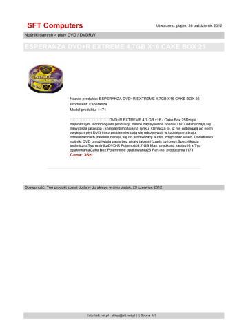 SFT Computers Utworzono: piątek, 26 październik 2012 Nośniki danych > płyty DVD / DVDRW ESPERANZA DVD+R EXTREME 4,7GB X16 CAKE BOX 25 Nazwa produktu: ESPERANZA DVD+R EXTREME 4,7GB X16 CAKE BOX 25 Producent: Esperanza Model produktu: 1171 DVD+R EXTREME 4,7 GB x16 - Cake Box 25Dzięki najnowszym technologiom produkcji, nasze zapisywalne nośniki DVD odznaczają się najwyższą jakością i kompatybilnością na rynku. Oznacza to, iż nie odbiegają od norm zwykłych płyt DVD i bez problemów dają się odczytywać w każdego rodzaju odtwarzaczach.Idealnie nadają się do archiwizacji audio, zdjęć oraz video. Dodatkowo nośniki DVD umożliwiają zapis bez utraty jakości (zapis cyfrowy).Specyfikacja technicznaTyp nośnikaDVD-R Pojemość4.7 GB Max. prędkość zapisu16 x Typ opakowaniaCake Box Pojemność opakowania25 Part-no. producenta1171 Cena: 36zł Dostępność: Ten produkt został dodany do sklepu w dniu piątek, 29 czerwiec 2012 http://sft.net.pl | [email protected] | | Strona 1/1