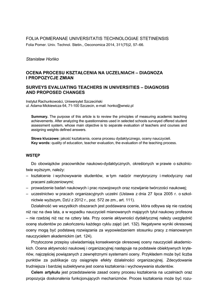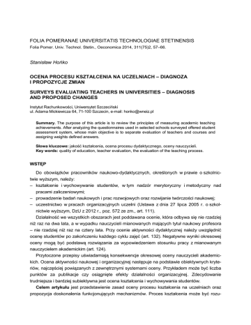 FOLIA POMERANAE UNIVERSITATIS TECHNOLOGIAE STETINENSIS Folia Pomer. Univ. Technol. Stetin., Oeconomica 2014, 311(75)2, 57–66. Stanisław Hońko OCENA PROCESU KSZTAŁCENIA NA UCZELNIACH – DIAGNOZA I PROPOZYCJE ZMIAN SURVEYS EVALUATING TEACHERS IN UNIVERSITIES – DIAGNOSIS AND PROPOSED CHANGES Instytut Rachunkowości, Uniwersytet Szczeciński ul. Adama Mickiewicza 64, 71-100 Szczecin, e-mail: [email protected] Summary. The purpose of this article is to review the principles of measuring academic teaching achievements. After analyzing the questionnaires used in selected schools surveyed offered student assessment system, whose main objective is to separate evaluation of teachers and courses and assigning weights defined answers. Słowa kluczowe: jakość kształcenia, ocena procesu dydaktycznego, oceny nauczycieli. Key words: quality of education, teacher evaluation, the evaluation of the teaching process. WSTĘP Do obowiązków pracowników naukowo-dydaktycznych, określonych w prawie o szkolnictwie wyższym, należy: – kształcenie i wychowywanie studentów, w tym nadzór merytoryczny i metodyczny nad pracami zaliczeniowymi; – prowadzenie badań naukowych i prac rozwojowych oraz rozwijanie twórczości naukowej; – uczestnictwo w pracach organizacyjnych uczelni (Ustawa z dnia 27 lipca 2005 r. o szkolnictwie wyższym, DzU z 2012 r., poz. 572 ze zm., art. 111). Działalność we wszystkich obszarach jest poddawana ocenie, która odbywa się nie rzadziej niż raz na dwa lata, a w wypadku nauczycieli mianowanych mających tytuł naukowy profesora – nie rzadziej niż raz na cztery lata. Przy ocenie aktywności dydaktycznej należy uwzględnić ocenę studentów po zakończeniu każdego cyklu zajęć (art. 132). Negatywne wyniki okresowej oceny mogą być podstawą rozwiązania za wypowiedzeniem stosunku pracy z mianowanym nauczycielem akademickim (art. 124). Przytoczone przepisy uświadamiają konsekwencje okresowej oceny nauczycieli akademickich. Ocena aktywności naukowej i organizacyjnej następuje na podstawie obiektywnych kryteriów, najczęściej powiązanych z zewnętrznymi systemami oceny. Przykładem może być liczba punktów za publikacje czy osiągnięte efekty działalności organizacyjnej. Zdecydowanie trudniejsza i bardziej subiektywna jest ocena kształcenia i wychowywania studentów. Celem artykułu jest przedstawienie zasad oceny procesu kształcenia na uczelniach oraz propozycja doskonalenia funkcjonujących mechanizmów. Proces kształcenia może być rozu- 58 S. Hońko miany dość szeroko i wówczas obejmuje nauczanie, uczenie się oraz kształtowanie osobowości wychowanków (Okoń 1995). Na potrzeby niniejszego artykułu przyjmuje się, że proces kształcenia oznacza ogół czynności nauczyciela akademickiego związanych z osiągnięciem i weryfikacją założonych efektów kształcenia. W artykule nie odniesiono się do obowiązków nauczyciela w zakresie wychowania studentów, wychodząc z założenia, że to zagadnienie wymaga odrębnego opracowania. Układ artykułu jest ściśle powiązany z przyjętym celem i składa się z takich elementów, jak: – diagnoza ankietyzacji jako metody oceny procesu dydaktycznego, w tym analiza ankiet stosowanych na wybranych uczelniach; – propozycje rozwiązań dotyczących ankietyzacji zajęć, mogące w ocenie autora przyczynić się do zmniejszenia subiektywizmu oceny oraz do ułatwienia analizy otrzymanych wyników. MATERIAŁ I METODY Artykuł ma charakter diagnostyczno-prognostyczny. W części diagnostycznej posłużono się metodą analizy źródeł, w szczególności uchwał senatów wybranych uczelni dotyczących regulaminu ankietyzacji zajęć. Dobór próby badawczej był przypadkowy i uzależniony od dostępności ankiety na stronie internetowej uczelni. Ponadto wykorzystano literaturę z zakresu pedagogiki i badań kwestionariuszowych. W części prognostycznej zaproponowano modyfikację układu ankiety, odpowiednie uporządkowanie pytań oraz przypisanie im wag, umożliwiających kompleksową ocenę nauczyciela i procesu kształcenia na uczelni. ANKIETYZACJA ZAJĘĆ DYDAKTYCZNYCH NA UCZELNI – DIAGNOZA Podstawowymi metodami oceny procesu kształcenia, nie tylko na uczelniach, są ankiety i hospitacja zajęć1. Chociaż metody te są stosowane na uczelniach od dawna, ich stosowanie wciąż budzi emocje. Nauczyciele akademiccy nie podważają sensu oceny sposobu prowadzenia zajęć, ale obawiają się ich subiektywizmu (Gałkowska i Kluska 2000). Spojrzenie na własne zajęcia z perspektywy studentów zaspokaja ciekawość nauczyciela i jednocześnie jest wyrazem partnerskiego traktowania studentów. W tabeli 1 zestawiono wady i zalety obu metod oceny zajęć dydaktycznych na uczelni. Tabela 1. Wady i zalety ankietyzacji i hospitacji Forma oceny Ankiety 1 Zalety Umożliwiają uzyskanie indywidualnych opinii o procesie dydaktycznym. Ankiety z pytaniami otwartymi umożliwiają uzyskanie informacji prowadzących do doskonalenia warsztatu dydaktycznego, poznania oczekiwań studentów i stopnia ich spełnienia. Pozwalają na konfrontację oczekiwań studentów z postrzeganiem procesu dydaktycznego przez nauczyciela akademickiego. Wady Oceny mogą dotyczyć cech osobistych nauczyciela, a nie jakości procesu dydaktycznego. Oceny mogą być formułowane pod wpływem emocji związanych zarówno z przebiegiem zajęć, jak z potwierdzeniem kompetencji w ramach danego przedmiotu. Trudność oceny przygotowania merytorycznego nauczyciela z powodu braku kompetencji studentów. Hospitacja zajęć jest zagadnieniem wymagającym odrębnego opracowania. Tematyki tej dotyczy wiele opracowań, np.: Kordziński (2012). Ocena procesu kształcenia na uczelniach – diagnoza i propozycje zmian 59 Tabela 1. Wady i zalety ankietyzacji i hospitacji (cd.) Forma oceny Hospitacje Zalety Wady Ocena jest przeprowadzana przez osobę kompetentną i doświadczoną. Mogą mieć charakter ustawicznego doskonalenia warsztatu dydaktycznego