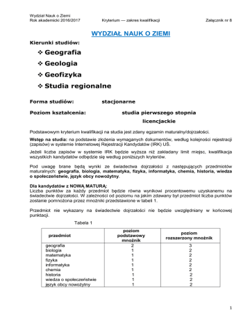 Wydział Nauk o Ziemi Rok akademicki 2016/2017 Załącznik nr 8 Kryterium — zakres kwalifikacji WYDZIAŁ NAUK O ZIEMI Kierunki studiów: v Geografia v Geologia v Geofizyka v Studia regionalne Forma studiów: stacjonarne Poziom kształcenia: studia pierwszego stopnia licencjackie Podstawowym kryterium kwalifikacji na studia jest zdany egzamin maturalny/dojrzałości. Wstęp na studia: na podstawie złożenia wymaganych dokumentów, według kolejności rejestracji (zapisów) w systemie Internetowej Rejestracji Kandydatów (IRK) UŚ. Jeżeli liczba zapisów w systemie IRK będzie wyższa niż zakładany limit miejsc, kwalifikacja wszystkich kandydatów odbędzie się według poniższych kryteriów. Pod uwagę brane będą wyniki ze świadectwa dojrzałości z następujących przedmiotów maturalnych: geografia, biologia, matematyka, fizyka, informatyka, chemia, historia, wiedza o społeczeństwie, język obcy nowożytny. Dla kandydatów z NOWĄ MATURĄ: Liczba punktów za każdy przedmiot będzie równa wynikowi procentowemu uzyskanemu na świadectwie dojrzałości. W zależności od poziomu na jakim zdawany był przedmiot liczba punktów zostanie pomnożona przez mnożniki przedstawione w tabeli 1. Przedmiot nie wykazany na świadectwie dojrzałości nie będzie uwzględniany w końcowej punktacji. Tabela 1 przedmiot geografia biologia matematyka fizyka informatyka chemia historia wiedza o społeczeństwie język obcy nowożytny poziom podstawowy mnożnik 2 1 1 1 1 1 1 1 1 poziom rozszerzony mnożnik 3 2 2 2 2 2 2 2 2 1 Wydział Nauk o Ziemi Rok akademicki 2016/2017 Załącznik nr 8 Kryterium — zakres kwalifikacji O miejscu w rankingu decyduje suma punktów uzyskanych z przedmiotów wymienionych w tabeli 1. Na studia będą przyjmowane osoby z największą liczbą punktów, aż do wypełnienia limitu miejsc. Dla kandydatów ze STARĄ MATURĄ: Oceny ze świadectwa dojrzałości zostaną przeliczone na punkty według tabeli 2. Dalszy tryb kwalifikacji będzie prowadzony tak jak dla kandydatów z Nową Maturą. Przedmioty maturalne będą traktowane jako zdane na poziomie rozszerzonym. Tabela 2 Matura do 1991 roku Matura po 1991 roku 6 — 100 % 5 — 100 % 5 — 80 % 4 — 70 % 4 — 75 % 3 — 30 % 3 — 50 % 2 — 30 % Kandydat na studia zobowiązany jest złożyć odpowiednie Zaświadczenie lekarskie o braku przeciwwskazań zdrowotnych do podjęcia studiów na tym kierunku. 2 Wydział Nauk o Ziemi Rok akademicki 2016/2017 Załącznik nr 8 Kryterium — zakres kwalifikacji Kierunek studiów: v Geologia stosowana v Inżynieria zagrożeń środowiskowych Forma studiów: stacjonarne Poziom kształcenia: studia pierwszego stopnia inżynierskie Podstawowym kryterium kwalifikacji na studia jest zdany egzamin maturalny/dojrzałości. Wstęp na studia: na podstawie złożenia wymaganych dokumentów, według kolejności rejestracji (zapisów) w systemie Internetowej Rejestracji Kandydatów (IRK) UŚ. Jeżeli liczba zapisów w systemie IRK będzie wyższa niż zakładany limit miejsc, kwalifikacja wszystkich kandydatów odbędzie się według poniższych kryteriów. Pod uwagę brane będą wyniki ze świadectwa dojrzałości z następujących przedmiotów maturalnych: geografia, biologia, matematyka, fizyka, informatyka, chemia, historia, wiedza o społeczeństwie, język obcy nowożytny. Dla kandydatów z NOWĄ MATURĄ: Liczba punktów za każdy przedmiot będzie równa wynikowi procentowemu uzyskanemu na świadectwie dojrzałości. W zależności od poziomu na jakim zdawany był przedmiot liczba punktów zostanie pomnożona przez mnożniki przedstawione w tabeli 1. Przedmiot nie wykazany na świadectwie dojrzałości nie będzie uwzględniany w końcowej punktacji. Tabela 1 przedmiot geografia biologia matematyka fizyka informatyka chemia historia wiedza o społeczeństwie język obcy nowożytny poziom podstawowy mnożnik 2 1 1 1 1 1 1 1 1 poziom rozszerzony mnożnik 3 2 2 2 2 2 2 2 2 O miejscu w rankingu decyduje suma punktów uzyskanych z przedmiotów wymienionych w tabeli 1. Na studia będą przyjmowane osoby z największą liczbą punktów, aż do wypełnienia limitu miejsc. 3 Wydział Nauk o Ziemi Rok akademicki 2016/2017 Załącznik nr 8 Kryterium — zakres kwalifikacji Dla kandydatów ze STARĄ MATURĄ: Oceny ze świadectwa dojrzałości zostaną przeliczone na punkty według tabeli 2. Dalszy tryb kwalifikacji będzie prowadzony tak jak dla kandydatów z Nową Maturą. Przedmioty maturalne będą traktowane jako zdane na poziomie rozszerzonym. Tabela 2 Matura do 1991 roku Matura po 1991 roku 6 — 100 % 5 — 100 % 5 — 80 % 4 — 70 % 4 — 75 % 3 — 30 % 3 — 50 % 2 — 30 % Kandydat na studia zobowiązany jest złożyć odpowiednie Zaświadczenie lekarskie o braku przeciwwskazań zdrowotnych do podjęcia studiów na tym kierunku. 4 Wydział Nauk o Ziemi Rok akademicki 2016/2017 Załącznik nr 8 Kryterium — zakres kwalifikacji Kierunek studiów: v Geografia Forma studiów: Poziom kształcenia: stacjonarne oraz niestacjonarne studia drugiego stopnia O przyjęcie na studia mogą się ubiegać osoby posiadające dyplom ukończenia studiów z tytułem licencjata, inżyniera lub magistra w zakresie geografii lub dyscyplin pokrewnych. Kandydat ubiegający się o przyjęcie posiada wiedzę, umiejętności oraz kompetencje społeczne niezbędne do podjęcia kształcenia na studiach II stopnia na tym kierunku, a w szczególności: · rozumie podstawowe zjawiska i procesy przyrodnicze; · ma podstawową wiedzę o miejscu i znaczeniu nauk przyrodniczych w systemie nauk oraz ich specyfice przedmiotowej i metodologicznej; · ma uporządkowaną wiedzę ogólną, obejmującą terminologię, teorie i metodologię z zakresu dziedzin nauki i dyscyplin naukowych; · potrafi wyszukiwać, analizować, oceniać, selekcjonować i użytkować informację z wykorzystaniem różnych źródeł i sposobów; · posiada podstawowe umiejętności badawcze, obejmujące formułowanie i analizę problemów badaw