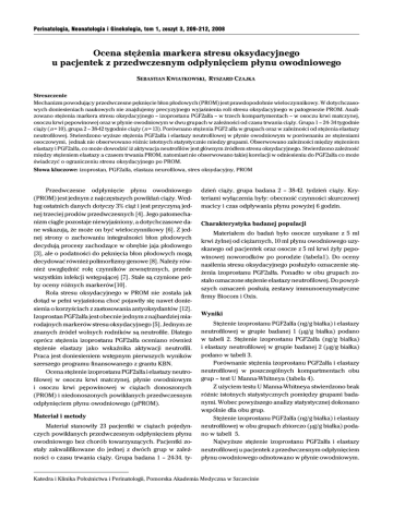Perinatologia, Neonatologia i Ginekologia, tom 1, zeszyt 3, 209-212, 2008 Ocena stężenia markera stresu oksydacyjnego u pacjentek z przedwczesnym odpłynięciem płynu owodniowego SEBASTIAN KWIATKOWSKI, RYSZARD CZAJKA Streszczenie Mechanizm powodujący przedwczesne pęknięcie błon płodowych (PROM) jest prawdopodobnie wieloczynnikowy. W dotychczasowych doniesieniach naukowych nie znajdujemy precyzyjnego wyjaśnienia roli stresu oksydacyjnego w patogenezie PROM. Analizowano stężenia markera stresu oksydacyjnego – izoprostanu PGF2alfa – w trzech kompartymentach – w osoczu krwi matczynej, osoczu krwi pępowinowej oraz w płynie owodniowym w dwu grupach w zależności od czasu trwania ciąży. Grupa 1 – 24- 34 tygodnie ciąży (n = 10), grupa 2 – 38-42 tygodnie ciąży (n = 13). Porównano stężenia PGF2 alfa w grupach oraz w zależności od stężenia elastazy neutrofilowej. Stwierdzono wyższe stężenia PGF2alfa i elastazy neutrofilowej w płynie owodniowym w porównaniu ze stężeniami osoczowymi, jednak nie obserwowano różnic istotnych statystycznie miedzy grupami. Obserwowano zależności między stężeniem elastazy i PGF2alfa, co może dowodzić iż aktywacja neutrofilów jest głównym źródłem stresu oksydacyjnego. Stwierdzono zależność między stężeniem elastazy a czasem trwania PROM, natomiast nie obserwowano takiej korelacji w odniesieniu do PGF2alfa co może świadczyć o ograniczeniu stresu oksydacyjnego po PROM. Słowa kluczowe: izoprostan, PGF2alfa, elastaza neurofilowa, stres oksydacyjny, PROM Przedwczesne odpłynięcie płynu owodniowego (PROM) jest jednym z najczęstszych powikłań ciąży. Według ostatnich danych dotyczy 3% ciąż i jest przyczyną jednej trzeciej prodów przedwczesnych [4]. Jego patomechanizm ciągle pozostaje niewyjaśniony, a dotychczasowe dane wskazują, że może on być wieloczynnikowy [6]. Z jednej strony o zachowaniu integralności błon płodowych decydują procesy zachodzące w obrębie jaja płodowego [3], ale o podatności do pęknięcia błon płodowych mogą decydować również polimorfizmy genowe [8]. Należy również uwzględnić rolę czynników zewnętrznych, przede wszystkim infekcji wstępującej [7]. Stale są czynione próby oceny różnych markerów[10]. Rola stresu oksydacyjnego w PROM nie została jak dotąd w pełni wyjaśniona choć pojawiły się nawet doniesienia o korzyściach z zastosowania antyoksydantów [12]. Izoprostan PGF2alfa jest obecnie jednym z najbardziej miarodajnych markerów stresu oksydacyjnego [5]. Jednym ze znanych źródeł wolnych rodników są neutrofile. Dlatego oprócz stężenia izoprostanu PGF2alfa oceniano również stężenie elastazy jako wskaźnika aktywacji neutrofili. Praca jest doniesieniem wstępnym pierwszych wyników szerszego programu finansowanego z grantu KBN. Ocena stężenie izoprostanu PGF2alfa i elastazy neutrofilowej w osoczu krwi matczynej, płynie owodniowym i osoczu krwi pępowinowej w ciążach donoszonych (PROM) i niedonoszonych powikłanych przedwczesnym odpłynięciem płynu owodniowego (pPROM). Materiał i metody Materiał stanowiły 23 pacjentki w ciążach pojedynczych powikłanych przedwczesnym odpłynięciem płynu owodniowego bez chorób towarzyszących. Pacjentki zostały zakwalifikowane do jednej z dwóch grup w zależności o czasu trwania ciąży. Grupa badana 1 – 24-34. ty- dzień ciąży, grupa badana 2 – 38-42. tydzień ciąży. Kryteriami wyłączenia były: obecność czynności skurczowej macicy i czas odpływania płynu powyżej 6 godzin. Charakterystyka badanej populacji Materiałem do badań było osocze uzyskane z 5 ml krwi żylnej od ciężarnych, 10 ml płynu owodniowego uzyskanego od pacjentek oraz osocze z 5 ml krwi żyły pępowinowej noworodków po porodzie (tabela1). Do oceny nasilenia stresu oksydacyjnego posłużyło oznaczenie stężenia izoprostanu PGF2alfa. Ponadto w obu grupach zostało oznaczone stężenie elastazy neutrofilowej. Do powyższych oznaczeń posłużą zestawy immunoenzymatyczne firmy Biocom i Oxis. Wyniki Stężenie izoprostanu PGF2alfa (ng/g białka) i elastazy neutrofilowej w grupie badanej 1 (μg/g białka) podano w tabeli 2. Stężenie izoprostanu PGF2alfa (ng/g białka) i elastazy neutrofilowej w grupie badanej 2 (μg/g białka) podano w tabeli 3. Porównanie stężenia izoprostanu PGF2alfa i elastazy neutrofilowej w poszczególnych kompartmentach obu grup – test U Manna-Whitneya (tabela 4). Z użyciem testu U Manna-Whitneya stwierdzono brak różnic istotnych statystycznych pomiędzy grupami badanymi. Wobec powyższego analizy statystycznej dokonano wspólnie dla obu grup. Stężenie izoprostanu PGF2alfa (ng/g białka) i elastazy neutrofilowej w obu grupach zbiorczo (μg/g białka) podano w tabeli 5. Najwyższe stężenie izoprostanu PGF2alfa i elastazy neutrofilowej u pacjentek z przedwczesnym odpłynięciem płynu owodniowego odnotowano w płynie owodniowym. Katedra i Klinika Położnictwa i Perinatologii, Pomorska Akademia Medyczna w Szczecinie 210 S. Kwiatkowski, R. Czajka Tabela 1. Charakterystyka badanej populacji Grupa badana 1 n = 10 Grupa badana 2 n = 13 28,3 ± 5,7 28 ± 6,31 39603 39664 Wiek pacjentki Pierwiastka/wieloródka 3(1-5) 2 (1-6) Wiek ciążowy Liczba godzin od odpłynięcia płynu w momencie pobrania 31,4 ± 3,34 39,23 ± 1,01 Liczba białych krwinek (g/l) 12,96 ± 4,2 12,98 ± 5,07 CRP w krwi ciężarnych 18 ± 16,6 8,01 ± 4,67 CRP w płynie owodniowym 10 ± 12,58 5,7 ± 2,56 CRP w krwi pępowinowej 13,5 ± 23,9 5,95 ± 2,48 36,725 ±0,21 36,7 ± 0,48 82 ± 14,05 80 ± 7,5 39602 39458 Temperatura ciała pacjentki Częstość uderzeń serca matki Droga porodu (cięcie cesarskie/drogami natury) Tabela 2. Stężenie izoprostanu PGF2alfa (ng/g białka) i elastazy neutrofilowej w grupie badanej 1 (μg/g białka) Stężenie izoprostanu Mediana Minimum Maksimum 25 percentyl 75 percentyl Osocze krwi matczynej 2,995 0,090 20,630 0,150 8,930 Płyn owodniowy 6,084 0,340 22,61