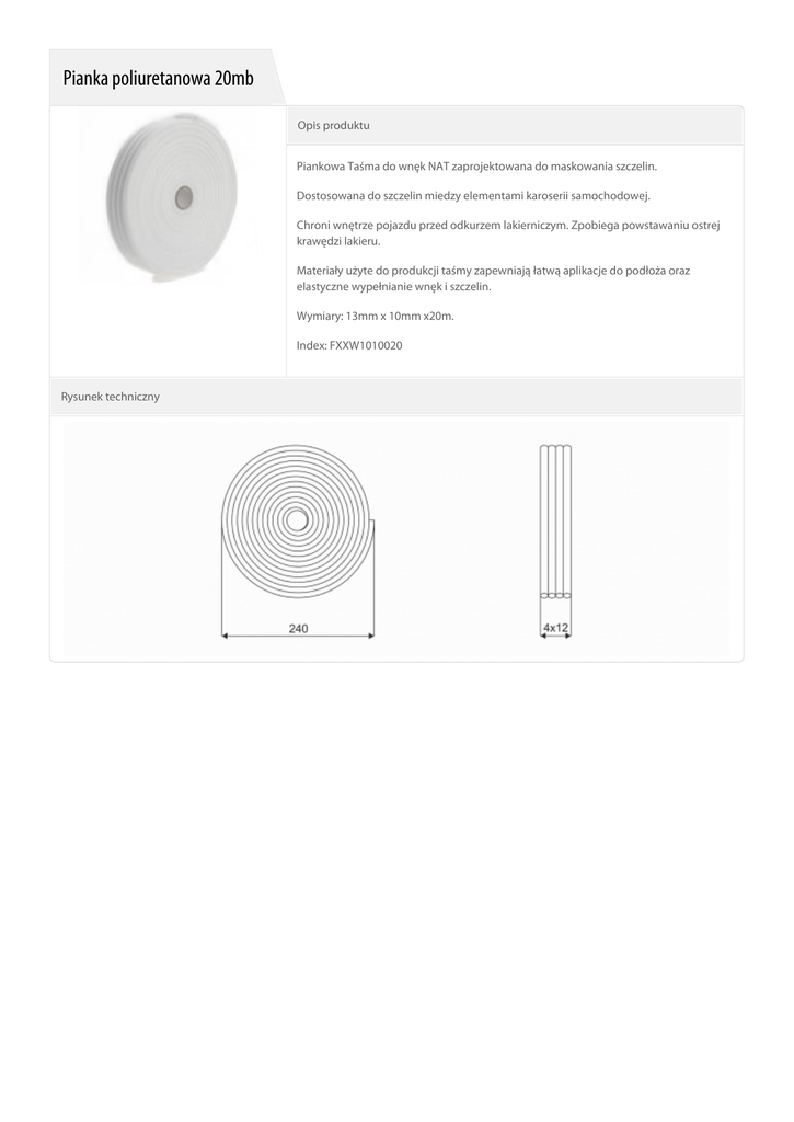 Pianka poliuretanowa 20mb Opis produktu Piankowa Taśma do wnęk NAT zaprojektowana do maskowania szczelin. Dostosowana do szczelin miedzy elementami karoserii samochodowej. Chroni wnętrze pojazdu przed odkurzem lakierniczym. Zpobiega powstawaniu ostrej krawędzi lakieru. Materiały użyte do produkcji taśmy zapewniają łatwą aplikacje do podłoża oraz elastyczne wypełnianie wnęk i szczelin. Wymiary: 13mm x 10mm x20m. Index: FXXW1010020 Rysunek techniczny