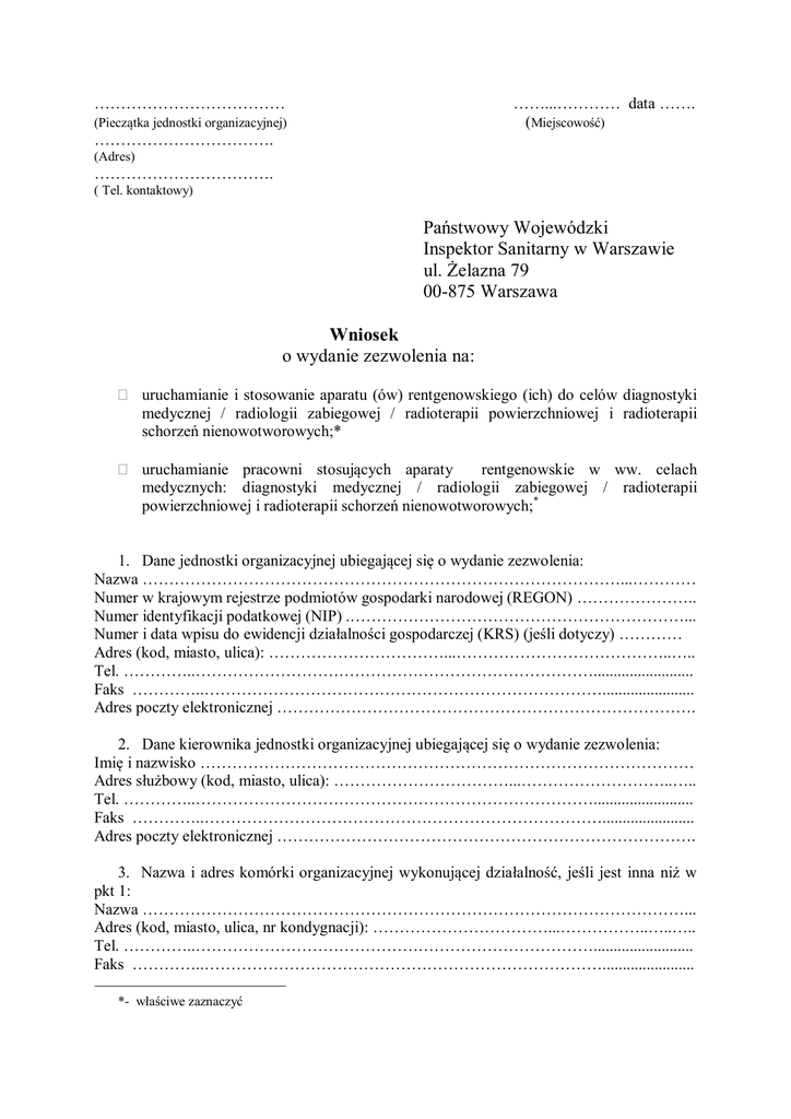 ……………………………… ……...………… data ……. (Miejscowość) (Pieczątka jednostki organizacyjnej) ……………………………. (Adres) ……………………………. ( Tel. kontaktowy) Państwowy Wojewódzki Inspektor Sanitarny w Warszawie ul. Żelazna 79 00-875 Warszawa Wniosek o wydanie zezwolenia na: uruchamianie i stosowanie aparatu (ów) rentgenowskiego (ich) do celów diagnostyki medycznej / radiologii zabiegowej / radioterapii powierzchniowej i radioterapii schorzeń nienowotworowych;* uruchamianie pracowni stosujących aparaty rentgenowskie w ww. celach medycznych: diagnostyki medycznej / radiologii zabiegowej / radioterapii powierzchniowej i radioterapii schorzeń nienowotworowych;* 1. Dane jednostki organizacyjnej ubiegającej się o wydanie zezwolenia: Nazwa ………………………………………………………………………………...………… Numer w krajowym rejestrze podmiotów gospodarki narodowej (REGON) ………………….. Numer identyfikacji podatkowej (NIP) .………………………………………………………... Numer i data wpisu do ewidencji działalności gospodarczej (KRS) (jeśli dotyczy) ………… Adres (kod, miasto, ulica): ……………………………...…………………………………..….. Tel. …………..…………………………………………………………………......................... Faks …………..…………………………………………………………………....................... Adres poczty elektronicznej ……………………………………………………………………. 2. Dane kierownika jednostki organizacyjnej ubiegającej się o wydanie zezwolenia: Imię i nazwisko ………………………………………………………………………………… Adres służbowy (kod, miasto, ulica): ……………………………...………………………..….. Tel. …………..…………………………………………………………………......................... Faks …………..…………………………………………………………………....................... Adres poczty elektronicznej ……………………………………………………………………. 3. Nazwa i adres komórki organizacyjnej wykonującej działalność, jeśli jest inna niż w pkt 1: Nazwa …………………………………………………………………………………………... Adres (kod, miasto, ulica, nr kondygnacji): ……………………………...……………..…..….. Tel. …………..…………………………………………………………………......................... Faks …………..…………………………………………………………………....................... *- właściwe zaznaczyć Adres poczty elektronicznej ……………………………………………………………………. 4. Przewidywany termin rozpoczęcia działalności: …......................................................... 5. Okres prowadzenia działalności przez czas nieoznaczony/ oznaczony*. Termin, do którego działalność będzie prowadzona, w przypadku gdy jest on oznaczony: ………………………………………………………………………………………………...… 6. Proponowane ograniczniki dawek (limity użytkowe dawek): ………………….……… 7. Dane o inspektorze ochrony radiologicznej: 1) Nazwisko i imię …………………………………………………............................. 2) Numer zaświadczenia …………………………………………………………..….. 3) Data wydania zaświadczenia …………..…………………………………...…......... 4) Telefon kontaktowy ………………………………………………………………... 8. Rodzaj i zakres prowadzonej kontroli: 1) narażenia pracowników na promieniowanie jonizujące poprzez: kontrolę dawek indywidualnych* ……………………………………… kontrolę środowiska pracy* ……………………………………………. 2) Otoczenia jednostki organizacyjnej: ……………………………………………. 9. Informacje charakteryzujące aparat rentgenowski (w przypadku gdy wniosek dot. uruchamiania i stosowania aparatu): 1) Typ aparatu rtg ………………...…………………….…………………………...… (wybrać jedno właściwe: zastosowanie w radiologii zabiegowej naczyniowej, zastosowanie w radiologii zabiegowej pozostałej, zastosowanie w diagnostyce bez radiologii zabiegowej, tylko do zdjęć, do zdjęć i prześwietleń, mammograf, stomatologiczny wewnątrzustny, stomatologiczny panoramiczny, densytometr, tomograf komputerowy, do terapii powierzchniowej, do terapii schorzeń nienowotworowych* sposób rejestracji obrazu: analogowy/cyfrowy*, tryb pracy: stacjonarny/niestacjonarny*) 2) Model aparatu rtg ......………………………………………………………………. 3) Numer fabryczny aparatu rtg .……………………………………………………… 4) Rodzaj wykonywanych badań rtg ………………...……………………………….. ……………………………………………………..………………………………... 5) Nazwa wytwórcy (producent aparatu rtg) ……………………………………..…… 6) Nazwa instalatora ……………...…………………………… ….…………………. Adres (miasto, ulica, numer domu) …………………………………….............. 7) Rok produkcji aparatu .......……………………...………………………………..… Uwaga: wypełnić dla każdego aparatu oddzielnie, w przypadku gdy jest uruchamianych więcej niż jeden. 10. Informacje charakteryzujące aparat rentgenowski (w przypadku gdy wniosek dot. uruchamiania 