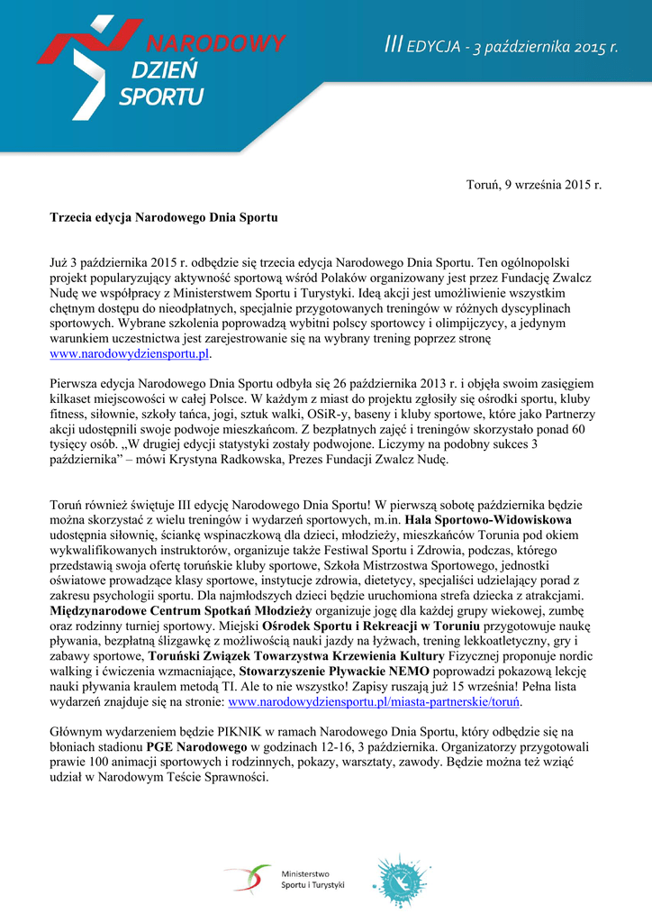 Toruń, 9 września 2015 r. Trzecia edycja Narodowego Dnia Sportu Już 3 października 2015 r. odbędzie się trzecia edycja Narodowego Dnia Sportu. Ten ogólnopolski projekt popularyzujący aktywność sportową wśród Polaków organizowany jest przez Fundację Zwalcz Nudę we współpracy z Ministerstwem Sportu i Turystyki. Ideą akcji jest umożliwienie wszystkim chętnym dostępu do nieodpłatnych, specjalnie przygotowanych treningów w różnych dyscyplinach sportowych. Wybrane szkolenia poprowadzą wybitni polscy sportowcy i olimpijczycy, a jedynym warunkiem uczestnictwa jest zarejestrowanie się na wybrany trening poprzez stronę www.narodowydziensportu.pl. Pierwsza edycja Narodowego Dnia Sportu odbyła się 26 października 2013 r. i objęła swoim zasięgiem kilkaset miejscowości w całej Polsce. W każdym z miast do projektu zgłosiły się ośrodki sportu, kluby fitness, siłownie, szkoły tańca, jogi, sztuk walki, OSiR-y, baseny i kluby sportowe, które jako Partnerzy akcji udostępnili swoje podwoje mieszkańcom. Z bezpłatnych zajęć i treningów skorzystało ponad 60 tysięcy osób. „W drugiej edycji statystyki zostały podwojone. Liczymy na podobny sukces 3 października” – mówi Krystyna Radkowska, Prezes Fundacji Zwalcz Nudę. Toruń również świętuje III edycję Narodowego Dnia Sportu! W pierwszą sobotę października będzie można skorzystać z wielu treningów i wydarzeń sportowych, m.in. Hala Sportowo-Widowiskowa udostępnia siłownię, ściankę wspinaczkową dla dzieci, młodzieży, mieszkańców Torunia pod okiem wykwalifikowanych instruktorów, organizuje także Festiwal Sportu i Zdrowia, podczas, którego przedstawią swoja ofertę toruńskie kluby sportowe, Szkoła Mistrzostwa Sportowego, jednostki oświatowe prowadzące klasy sportowe, instytucje zdrowia, dietetycy, specjaliści udzielający porad z zakresu psychologii sportu. Dla najmłodszych dzieci będzie uruchomiona strefa dziecka z atrakcjami. Międzynarodowe Centrum Spotkań Młodzieży organizuje jogę dla każdej grupy wiekowej, zumbę oraz rodzinny turniej sportowy. Miejski Ośrodek Sportu i Rekreacji w Toruniu przygotowuje naukę pływania, bezpłatną ślizgawkę z możliwością nauki jazdy na łyżwach, trening lekkoatletyczny, gry i zabawy sportowe, Toruński Związek Towarzystwa Krzewienia Kultury Fizycznej proponuje nordic walking i ćwiczenia wzmacniające, Stowarzyszenie Pływackie NEMO poprowadzi pokazową lekcję nauki pływania kraulem metodą TI. Ale to nie wszystko! Zapisy ruszają już 15 września! Pełna lista wydarzeń znajduje się na stronie: www.narodowydziensportu.pl/miasta-partnerskie/toruń. Głównym wydarzeniem będzie PIKNIK w ramach Narodowego Dnia Sportu, który odbędzie się na błoniach stadionu PGE Narodowego w godzinach 12-16, 3 października. Organizatorzy przygotowali prawie 100 animacji sportowych i rodzinnych, pokazy, warsztaty, zawody. Będzie można też wziąć udział w Narodowym Teście Sprawności. Sportowcami prowadzącymi treningi podczas Narodowego Dnia Sportu są m.in. Andrzej Supron, polski zapaśnik, mistrz świata i Europy, Robert Mateusiak, polski badmintonista i olimpijczyk z Sydney, Aten, Pekinu i Londynu, Paulina Bobak, polska biathlonistka, zawodniczka AZS AWF Katowice, medalistka Mistrzostw Polski seniorów, ogólnopolskiej Olimpiady Młodzieży oraz Mistrzostw Polski Juniorów, Albert Sosnowski - bokser wagi ciężkiej. Były mistrz świata organizacji WBF (2006-2007), mistrz Europy EBU (2009-2010), były pretendent do tytułu mistrza świata organizacji WBC. *** Ogólnopolskimi patronami Narodowego Dnia Sportu są Polski Komitet Olimpijski oraz Ministerstwo Sportu i Turystyki, które także współfinansuje projekt. W Toruniu projekt organizowany jest we współpracy z Urzędem Miasta Torunia. Lokalnym patronem medialnym jest TV Toruń. Dodatkowych informacji udzielają : Krystyna Radkowska Prezes Fundacji Zwalcz Nudę Organizator Narodowego Dnia Sportu tel.: 501 104 087; @: [email protected] Barbara Banach Koordynator Narodowego Dnia Sportu tel.: 511 585 782; @: [email protected]