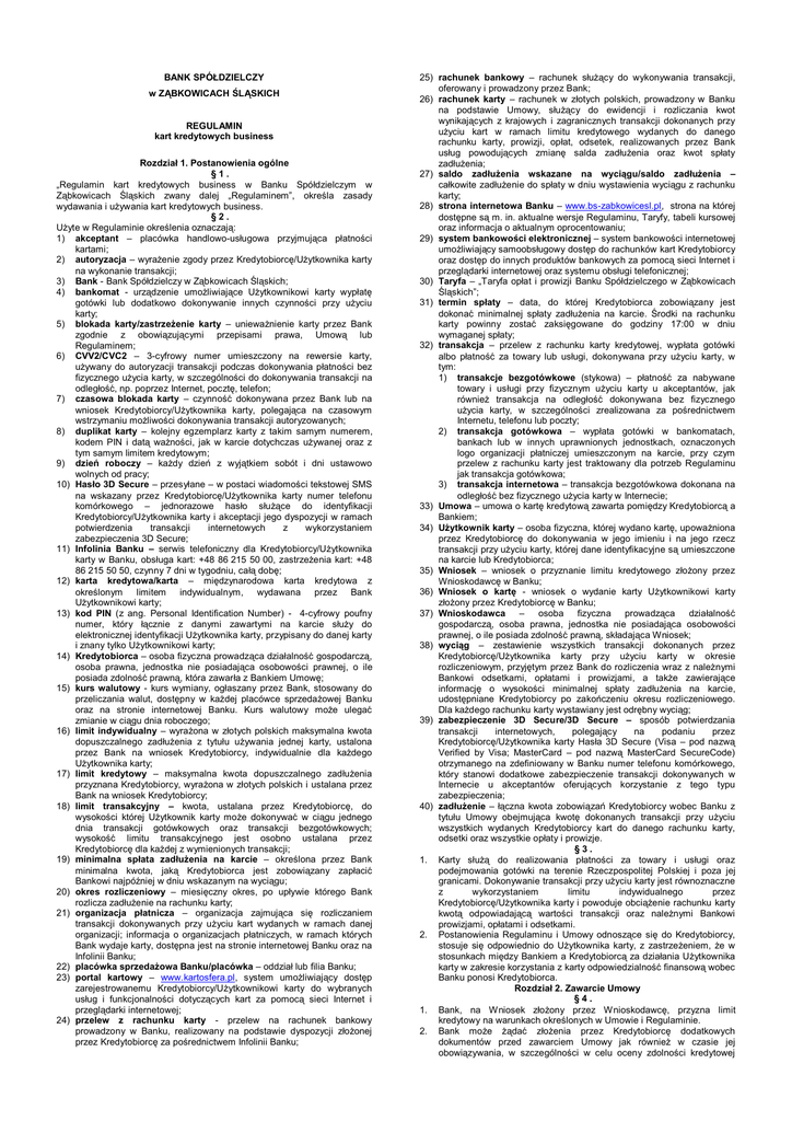 BANK SPÓŁDZIELCZY w ZĄBKOWICACH ŚLĄSKICH REGULAMIN kart kredytowych business Rozdział 1. Postanowienia ogólne §1. „Regulamin kart kredytowych business w Banku Spółdzielczym w Ząbkowicach Śląskich zwany dalej „Regulaminem”, określa zasady wydawania i używania kart kredytowych business. §2. Użyte w Regulaminie określenia oznaczają: 1) akceptant – placówka handlowo-usługowa przyjmująca płatności kartami; 2) autoryzacja – wyrażenie zgody przez Kredytobiorcę/Użytkownika karty na wykonanie transakcji; 3) Bank - Bank Spółdzielczy w Ząbkowicach Śląskich; 4) bankomat - urządzenie umożliwiające Użytkownikowi karty wypłatę gotówki lub dodatkowo dokonywanie innych czynności przy użyciu karty; 5) blokada karty/zastrzeżenie karty – unieważnienie karty przez Bank zgodnie z obowiązującymi przepisami prawa, Umową lub Regulaminem; 6) CVV2/CVC2 – 3-cyfrowy numer umieszczony na rewersie karty, używany do autoryzacji transakcji podczas dokonywania płatności bez fizycznego użycia karty, w szczególności do dokonywania transakcji na odległość, np. poprzez Internet, pocztę, telefon; 7) czasowa blokada karty – czynność dokonywana przez Bank lub na wniosek Kredytobiorcy/Użytkownika karty, polegająca na czasowym wstrzymaniu możliwości dokonywania transakcji autoryzowanych; 8) duplikat karty – kolejny egzemplarz karty z takim samym numerem, kodem PIN i datą ważności, jak w karcie dotychczas używanej oraz z tym samym limitem kredytowym; 9) dzień roboczy – każdy dzień z wyjątkiem sobót i dni ustawowo wolnych od pracy; 10) Hasło 3D Secure – przesyłane – w postaci wiadomości tekstowej SMS na wskazany przez Kredytobiorcę/Użytkownika karty numer telefonu komórkowego – jednorazowe hasło służące do identyfikacji Kredytobiorcy/Użytkownika karty i akceptacji jego dyspozycji w ramach potwierdzenia transakcji internetowych z wykorzystaniem zabezpieczenia 3D Secure; 11) Infolinia Banku – serwis telefoniczny dla Kredytobiorcy/Użytkownika karty w Banku, obsługa kart: +48 86 215 50 00, zastrzeżenia kart: +48 86 215 50 50, czynny 7 dni w tygodniu, całą dobę; 12) karta kredytowa/karta – międzynarodowa karta kredytowa z określonym limitem indywidualnym, wydawana przez Bank Użytkownikowi karty; 13) kod PIN (z ang. Personal Identification Number) - 4-cyfrowy poufny numer, który łącznie z danymi zawartymi na karcie służy do elektronicznej identyfikacji Użytkownika karty, przypisany do danej karty i znany tylko Użytkownikowi karty; 14) Kredytobiorca – osoba fizyczna prowadząca działalność gospodarczą, osoba prawna, jednostka nie posiadająca osobowości prawnej, o ile posiada zdolność prawną, która zawarła z Bankiem Umowę; 15) kurs walutowy - kurs wymiany, ogłaszany przez Bank, stosowany do przeliczania walut, dostępny w każdej placówce sprzedażowej Banku oraz na stronie internetowej Banku. Kurs walutowy może ulegać zmianie w ciągu dnia roboczego; 16) limit indywidualny – wyrażona w złotych polskich maksymalna kwota dopuszczalnego zadłużenia z tytułu używania jednej karty, ustalona przez Bank na wniosek Kredytobiorcy, indywidualnie dla każdego Użytkownika karty; 17) limit kredytowy – maksymalna kwota dopuszczalnego zadłużenia przyznana Kredytobiorcy, wyrażona w złotych polskich i ustalana przez Bank na wniosek Kredytobiorcy; 18) limit transakcyjny – kwota, ustalana przez Kredytobiorcę, do wysokości której Użytkownik karty może dokonywać w ciągu jednego dnia transakcji gotówkowych oraz transakcji bezgotówkowych; wysokość limitu transakcyjnego jest osobno ustalana przez Kredytobiorcę dla każdej z wymienionych transakcji; 19) minimalna spłata zadłużenia na karcie – określona przez Bank minimalna kwota, jaką Kredytobiorca jest zobowiązany zapłacić Bankowi najpóźniej w dniu wskazanym na wyciągu; 20) okres rozliczeniowy – miesięczny okres, po upływie którego Bank rozlicza zadłużenie na rachunku karty; 21) organizacja płatnicza – organizacja zajmująca się rozliczaniem transakcji dokonywanych przy użyciu kart wydanych w ramach danej organizacji; informacja o organizacjach płatniczych, w ramach których Bank wydaje karty, dostępna jest na stronie internetowej Banku oraz na Infolinii Banku; 22) placówka sprzedażowa Banku/placówka – oddział lub filia Banku; 23) portal kartowy – www.kartosfera.pl, system umożliwiający dostęp zarejestrowanemu Kredytobiorcy/Użytkownikowi karty do wybranych usług i funkcjonalności dotyczących kart za pomocą sieci Internet i przeglądarki internetowej; 24) przelew z rachunku karty - przelew na rachunek bankowy prowadzony w Banku, realizowany na podstawie dyspozycji złożonej przez Kredytobiorcę za pośrednictwem Infolinii Banku; 25) rachunek bankowy – rachunek służący do wykonywania transakcji, oferowany i prowadzony przez Bank; 26) rachunek karty – rachunek w złotych polskich, prowadzony w Banku na podstawie Umowy, służący do ewidencji i rozliczania kwot wynikających z krajowych i zagranicznych transakcji dokonanych przy użyciu kart w ramach limitu kredytowego wydanych do danego rachunku karty, prowizji, opłat, odsetek, realizowanych przez Bank usług powodujących zmianę salda zadłużenia oraz kwot spłaty zadłużenia; 27) saldo zadłużenia wskazane na wyciągu/saldo zadłużenia – całkowite zadłużenie do spłaty w dniu wystawienia wyciągu z rachunku karty; 28) strona internetowa Banku – www.bs-zabkowicesl.pl, strona na której dostępne są m. in. aktualne wersje Regulaminu, Taryfy, tabeli kursowej oraz informacja o aktualnym oprocentowaniu; 29) system bankowości elektronicznej – system bankowości internetowej umożliwiający samoobsługowy dostęp do rachunków kart Kredytobiorcy oraz dostęp do innych produktów bankowych za pomocą sieci Internet i przeglądarki internetowej oraz systemu obsługi telefonicznej; 30) Taryfa – „Taryfa opłat i prowizji Banku Spó