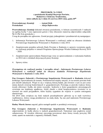 PROTOKÓŁ Nr 5/2015 z posiedzenia Komisji Rozwoju Powiatu, Rolnictwa i Ochrony Środowiska, które odbyło się w dniu 24 czerwca 2015 roku, godz.1000 Przewodniczący Komisji Protokolant - Antoni Dzik - Alicja Dąbrowska Przewodniczący Komisji dokonał otwarcia posiedzenia, w którym uczestniczyło 5 radnych na ogólną liczbę 7 oraz zaproszeni goście ( listy obecności stanowią odpowiednio załączniki Nr 1 i Nr 2 do protokołu ). Uwag do porządku nie zgłoszono. Został przyjęty jednogłośnie i przedstawiał się następująco: 1. Informacja Powiatowego Lekarza Weterynarii o realizacji zadań na obszarze działania Powiatowego Inspektoratu Weterynarii w Radomiu w roku 2014. 2. Zaopiniowanie projektu uchwały Rady Powiatu w Radomiu w sprawie wyrażenia zgody na realizację projektu w ramach Programu Operacyjnego Wiedza Edukacja Rozwój 2014 – 2020. 3. Zaopiniowanie sprawozdania finansowego wraz ze sprawozdaniem z wykonania budżetu za 2014 rok w działach dotyczących pracy Komisji. 4. Sprawy różne. Przystąpiono do realizacji punktu 1 porządku obrad - Informacja Powiatowego Lekarza Weterynarii o realizacji zadań na obszarze działania Powiatowego Inspektoratu Weterynarii w Radomiu w roku 2014. Pan Grzegorz Zaborski z Powiatowego Inspektoratu Weterynarii w Radomiu dokonał krótkiego wprowadzenia do tematu. Poinformował między innymi, że na terenie powiatu brak jest chorób zakaźnych. Wiąże to się z większą ilością badań, jak również z tym że jest coraz mniej dużych zwierząt hodowlanych w gospodarstwach. Powstają co prawda większe fermy trzody chlewnej i bydła, ale mimo wszystko hodowla w ilości gospodarstw utrzymujących zwierzęta ma tendencję spadkową. Jeżeli chodzi o dział bezpieczeństwa żywności to tu również nie mieli przypadków, które byłyby sygnałem do wejścia w system ostrzegania alarmowego. Od 2014 roku zwiększa się ilość małych przedsiębiorstw głównie są to mali wytwórcy wędliniarscy, którzy mogą produkować na małą skalę. Są one pod nadzorem Powiatowego Lekarza Weterynarii. Radny Marek Jarosz zapytał, gdzie nastąpił spadek w produkcji zwierzęcej. Pan Grzegorz Zaborski z Powiatowego Inspektoratu Weterynarii w Radomiu odpowiedział, że bydła ubywa w małych gospodarstwach. Natomiast stan pogłowia został zahamowany. W trzodzie chlewnej zaczynają powstawać duże fermy trzody powyżej 500 sztuk, oparte na materiale z zagranicy Holandii, Danii. 1 Radna Ewa Tkaczyk zapytała o chorobę Aujeszkego, bo w materiale znalazła się informacja, że zostały ubite 3 sztuki z tą chorobą. Zapytała, czy te 3 sztuki pochodziły z jednego gospodarstwa. Pan Grzegorz Zaborski z Powiatowego Inspektoratu Weterynarii w Radomiu poinformował, że powiat jest uznany za wolny od tej choroby. A monitoring polega na sprawdzeniu stada, jeżeli wyjdzie wynik dodatni, to przyjmuje się, że jest to tzw. fałszywy dodatni wynik, ale procedury zostają. I wybija się pojedyncze sztuki z tym wynikiem a stado jest pod obserwacją. Dwie sztuki były wybite w dwóch gospodarstwach. Pozostałe sztuki były zdrowe, dwukrotnie wynik wyszedł ujemny. Nie została stwierdzona choroba tylko czynnik chorobotwórczy. Radny Roman Frąk stwierdził, że w kwestii nadzoru nad bezpieczeństwem żywności przeprowadzono 565 kontroli, wydano 79 rozstrzygnięć. Na podmioty nadzorowane nałożono 10 kar pieniężnych na sumę 89.900 złotych. Zapytał jakiego gatunku były te uchybienia, czy były one poważne. Pan Grzegorz Zaborski z Powiatowego Inspektoratu Weterynarii w Radomiu wyjaśnił, że obowiązuje rozporządzenie Ministra Rolnictwa o grzywnach o charakterze pieniężnym nakładanych na podmioty, które naruszą warunki i wymagania weterynaryjne. To rozporządzenie ma zastosowanie do bieżącej pracy podmiotów, czyli nie jest to grzywna za nielegalną działalność, czy poza ich zgodą. Kary nakładane są na podmioty, w których stwierdzi się uchybienia podczas kontroli. Widełki są dość sztywno ustawione i wysokość jest ustalana na podstawie unijnych przepisów. Radny Roman Frąk stwierdził, że wykryto jedno ognisko salmonellozy na fermie niosek, zapytał czy to jest groźne dla konsumentów jajek. Pan Grzegorz Zaborski z Powiatowego Inspektoratu Weterynarii w Radomiu odpowiedział, że pośrednio tak. Bezpośrednio nie. Stwierdzony przypadek salmonellozy oznacza, że stwierdzono obecność tej bakterii w otoczeniu. W tej chwili przepisy weterynaryjne są na tyle wyostrzone, czy podlegają takim procedurom, że oni w zasadzie nie badają zwierząt. Reagują już na poziomie badań monitoringowych, które wykrywają ewentualną obecność bakterii w kale zwierząt, w kurzu, czy w otoczeniu zebranym z obiektu. Najczęściej wynik dodatni nakłada na nich obowiązek zlikwidowania tego potencjalnego zagrożenia. Wtedy zamykają obiekt, niszczą jego zawartość, odkażają i towar z niego pochodzący również przeznaczają do utylizacji. Kiedyś procedury zakładały po takich wynikach monitoringowych badanie zwierząt. Jeżeli wykryto salmonellę to były podejmowane środki, a jeszcze wcześniej było nawet dopuszczalne leczenie. Jeżeli chodzi o jajka to salmonelle jest groźna ale ona jest w naszym otoczeniu cały czas. Inspektorat zwalcza tylko dwa najgroźniejsze serotypy, natomiast bezpośrednio salmonella w towarze, czy w jajku wewnątrz nie ma żadnego zagrożenia. Jest ona na skorupkach, ale przy dobrym postępowaniu z nim nie ma jakiegoś problemu. Natomiast żeby tego niebezpieczeństwa nie powielać to niszczą wszystko już na samym początku. Oczywiście odbywa się to za odszkodowaniem dla właściciela, jeżeli uznają że nie było to świadome działanie. Jest to sygnał dla innych, że każde podejrzenie powinni zgłaszać. 2 Radny Roman Frąk stwierdził, że PIW przybyło zadań, natomiast nie został on wzmocniony kadrowo i finansowo. Zapytał, czy to powinno mieć miejsce i czy zwracał się Powiatowy Inspe