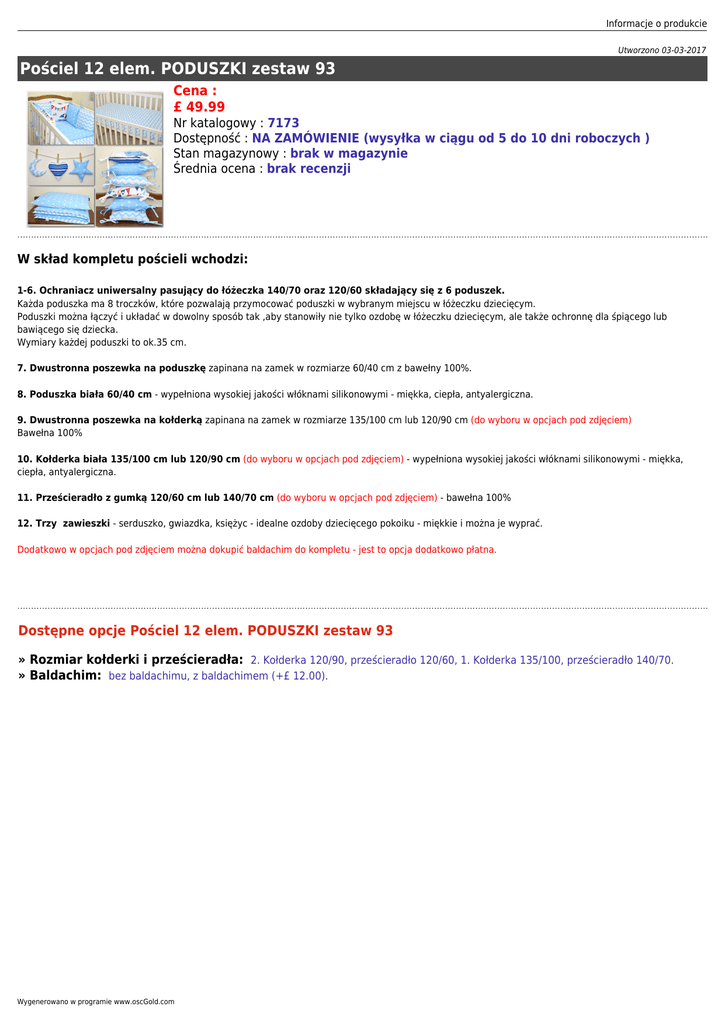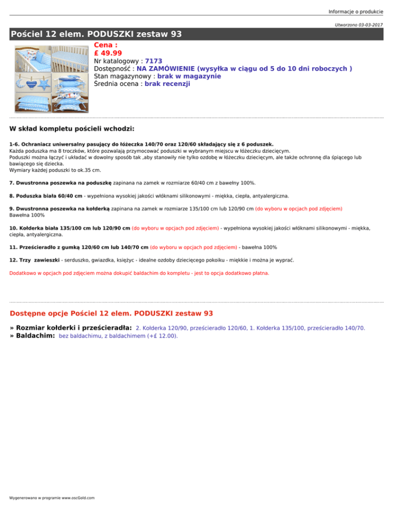 Informacje o produkcie Utworzono 03-03-2017 Pościel 12 elem. PODUSZKI zestaw 93 Cena : £ 49.99 Nr katalogowy : 7173 Dostępność : NA ZAMÓWIENIE (wysyłka w ciągu od 5 do 10 dni roboczych ) Stan magazynowy : brak w magazynie Średnia ocena : brak recenzji W skład kompletu pościeli wchodzi: 1-6. Ochraniacz uniwersalny pasujący do łóżeczka 140/70 oraz 120/60 składający się z 6 poduszek. Każda poduszka ma 8 troczków, które pozwalają przymocować poduszki w wybranym miejscu w łóżeczku dziecięcym. Poduszki można łączyć i układać w dowolny sposób tak ,aby stanowiły nie tylko ozdobę w łóżeczku dziecięcym, ale także ochronnę dla śpiącego lub bawiącego się dziecka. Wymiary każdej poduszki to ok.35 cm. 7. Dwustronna poszewka na poduszkę zapinana na zamek w rozmiarze 60/40 cm z bawełny 100%. 8. Poduszka biała 60/40 cm - wypełniona wysokiej jakości włóknami silikonowymi - miękka, ciepła, antyalergiczna. 9. Dwustronna poszewka na kołderką zapinana na zamek w rozmiarze 135/100 cm lub 120/90 cm (do wyboru w opcjach pod zdjęciem) Bawełna 100% 10. Kołderka biała 135/100 cm lub 120/90 cm (do wyboru w opcjach pod zdjęciem) - wypełniona wysokiej jakości włóknami silikonowymi - miękka, ciepła, antyalergiczna. 11. Prześcieradło z gumką 120/60 cm lub 140/70 cm (do wyboru w opcjach pod zdjęciem) - bawełna 100% 12. Trzy zawieszki - serduszko, gwiazdka, księżyc - idealne ozdoby dziecięcego pokoiku - miękkie i można je wyprać. Dodatkowo w opcjach pod zdjęciem można dokupić baldachim do kompletu - jest to opcja dodatkowo płatna. Dostępne opcje Pościel 12 elem. PODUSZKI zestaw 93 » Rozmiar kołderki i prześcieradła: 2. Kołderka 120/90, prześcieradło 120/60, 1. Kołderka 135/100, prześcieradło 140/70. » Baldachim: bez baldachimu, z baldachimem (+£ 12.00). Wygenerowano w programie www.oscGold.com