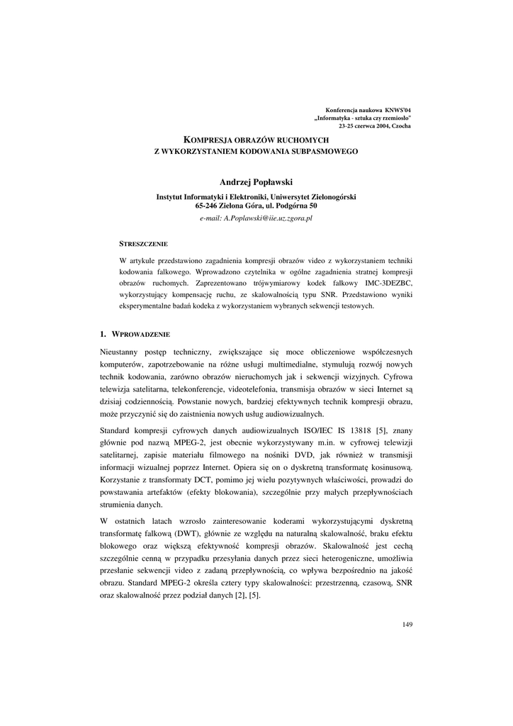,POGFSFODKBOBVLPXB,/84 v*OGPSNBUZLBT[UVLBD[ZS[FNJPTP D[FSXDB$[PDIB KOMPRESJA OBRAZÓW RUCHOMYCH Z WYKORZYSTANIEM KODOWANIA SUBPASMOWEGO Andrzej Popławski Instytut Informatyki i Elektroniki, Uniwersytet Zielonogórski 65-246 Zielona Góra, ul. Podgórna 50 e-mail: [email protected] STRESZCZENIE W artykule przedstawiono zagadnienia kompresji obrazów video z wykorzystaniem techniki kodowania falkowego. Wprowadzono czytelnika w ogólne zagadnienia stratnej kompresji obrazów ruchomych. Zaprezentowano trójwymiarowy kodek falkowy IMC-3DEZBC, wykorzystujący kompensacjĊ ruchu, ze skalowalnoĞcią typu SNR. Przedstawiono wyniki eksperymentalne badaĔ kodeka z wykorzystaniem wybranych sekwencji testowych. 1. WPROWADZENIE Nieustanny postĊp techniczny, zwiĊkszające siĊ moce obliczeniowe współczesnych komputerów, zapotrzebowanie na róĪne usługi multimedialne, stymulują rozwój nowych technik kodowania, zarówno obrazów nieruchomych jak i sekwencji wizyjnych. Cyfrowa telewizja satelitarna, telekonferencje, videotelefonia, transmisja obrazów w sieci Internet są dzisiaj codziennoĞcią. Powstanie nowych, bardziej efektywnych technik kompresji obrazu, moĪe przyczyniü siĊ do zaistnienia nowych usług audiowizualnych. Standard kompresji cyfrowych danych audiowizualnych ISO/IEC IS 13818 [5], znany głównie pod nazwą MPEG-2, jest obecnie wykorzystywany m.in. w cyfrowej telewizji satelitarnej, zapisie materiału filmowego na noĞniki DVD, jak równieĪ w transmisji informacji wizualnej poprzez Internet. Opiera siĊ on o dyskretną transformatĊ kosinusową. Korzystanie z transformaty DCT, pomimo jej wielu pozytywnych właĞciwoĞci, prowadzi do powstawania artefaktów (efekty blokowania), szczególnie przy małych przepływnoĞciach strumienia danych. W ostatnich latach wzrosło zainteresowanie koderami wykorzystującymi dyskretną transformatĊ falkową (DWT), głównie ze wzglĊdu na naturalną skalowalnoĞü, braku efektu blokowego oraz wiĊkszą efektywnoĞü kompresji obrazów. SkalowalnoĞü jest cechą szczególnie cenną w przypadku przesyłania danych przez sieci heterogeniczne, umoĪliwia przesłanie sekwencji video z zadaną przepływnoĞcią, co wpływa bezpoĞrednio na jakoĞü obrazu. Standard MPEG-2 okreĞla cztery typy skalowalnoĞci: przestrzenną, czasową, SNR oraz skalowalnoĞü przez podział danych [2], [5]. 149 2. METODY STRATNEJ KOMPRESJI OBRAZÓW Współczesne techniki stratnej kompresji obrazów opierają siĊ na kodowaniu z wykorzystaniem transformaty. Obecnie w praktyce uĪywa siĊ dyskretnej transformaty kosinusowej (DCT – discrete cosine transform) oraz dyskretnej transformaty falkowej (DWT – discrete wavelet transform). Ogólny schemat kodowania transformatowego przedstawiono na rys. 1. Transformata Kwantyzacja Kodowanie ciągów (RLC) Kodowanie o zmiennej długoĞci słowa (VLC) Rys. 1. Ogólny schemat kodowania transformatowego Dane po przetworzeniu transformatą są kwantowane celem zmniejszenia iloĞci informacji w nich zawartych. Na tym etapie dokonuje siĊ właĞciwa kompresja, zawiązana z nieodwracalną utratą informacji, zaĞ otrzymane wartoĞci zaokrągla siĊ najczĊĞciej do najbliĪszej liczby całkowitej. NastĊpnie dane zostają poddane kodowaniu ciągów, liczby okreĞlające wartoĞci RLC są przetwarzane za pomocą kodów Huffmana lub kodów arytmetycznych. Dekodowanie tak zapisanych informacji przebiega w odwrotnym kierunku, czyli: dekodowanie kodu o zmiennej długoĞci słowa, dekodowanie ciągów, dekwantyzacja i wykonanie odwrotnej transformaty. Przedstawiony schemat kodowania jest wykorzystywany dla zapamiĊtania informacji o jednej klatce obrazu – jest to tak zwane kodowanie wewnątrzobrazowe (ang. intraframe). Uzyskanie wiĊkszych stopni kompresji wymaga kodowania miĊdzyobrazowego (ang. interframe), polegającego na wykorzystywaniu podobieĔstw pomiĊdzy sąsiadującymi obrazami. Wykorzystuje siĊ w tym celu technikĊ predykcji z kompensacją ruchu (ang. motion compensated prediction), polegającą na wyznaczeniu estymacji ruchu dla bloków o zadanym rozmiarze (np.: 8x8, 16x16). W obrazie poprzednim poszukuje siĊ najbardziej podobnych bloków, róĪnice połoĪeĔ bloków wyznaczają wektory ruchu (MV – motion vector). Wykorzystując kompensacjĊ ruchu wyznaczany jest przewidywany obraz, który porównuje siĊ z obrazem na wyjĞciu kodera – róĪnica tych obrazów wyznacza błąd predykcji, który nastĊpnie jest kodowany podobnie jak w przypadku kodowania wewnątrzblokowego. 3. KODEK IMC-3DEZBC Badania mające na celu zwiĊkszenie efektywnoĞci kompresji obrazów ruchomych prowadzone są na bazie kodeka IMC-3DEZBC (ang. Invertible Motion Compensation – 3-Dimensional Embedded Zero Block Coding) autorstwa S.-T. Hsiang-a oraz J.W. Woods-a. Kodek ten został opisany w [4]. Jest to trójwymiarowy kodek falkowy wykorzystujący 150 kompensacjĊ ruchu, ze skalowalnoĞcią typu SNR (ang. SNR scalability). Trójwymiarowe kodowanie subpasmowe z kompensacją ruchu zostało zapoczątkowane przez Ohm-a [6], który połączył estymacjĊ ruchu z trójwymiarowym kodowaniem subpasmowym. W oparciu o tą technikĊ powstało wiele koderów, jednym z nich jest omawiany IMC-3DEZBC. Ogólna struktura kodera została przedstawiona na rys. 2. wejĞcie Estymacja MV Ruchu (ME) Koder Bufor Analiza Analiza Moduá Czasowa MC Przestrzenna 3D-EZBC wyjĞcie Rys. 2. Schemat blokowy kodera IMC-3DEZBC WejĞciowy strumieĔ video jest rozkładany czasowo przez dwa kanały analizy kompensacji ruchu. W bloku estymacji ruchu wykorzystywane jest hierarchiczne dopasowanie ze zmiennym rozmiarem bloku HVSMB (ang. hierarchical variable size block matching). Do filtracji w dziedzinie przestrzennej wykorzystane zostały filtry typu Daubechies 9/7 opisane w [1]. Moduł 3D-EZBC jest rozszerzeniem kodera obrazu EZBC [3] do trzech wymiarów. W literaturze brak jest szczegółowych informacji na temat moĪliwoĞci kodera w zaleĪnoĞci od róĪnych ustawieĔ parametr