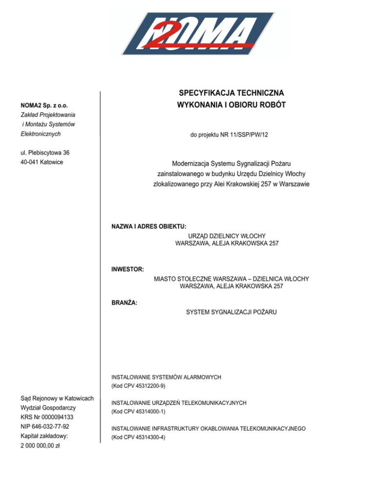 SPECYFIKACJA TECHNICZNA WYKONANIA I OBIORU ROBÓT NOMA2 Sp. z o.o. Zakład Projektowania i Montażu Systemów Elektronicznych do projektu NR 11/SSP/PW/12 ul. Plebiscytowa 36 40-041 Katowice Modernizacja Systemu Sygnalizacji Pożaru zainstalowanego w budynku Urzędu Dzielnicy Włochy zlokalizowanego przy Alei Krakowskiej 257 w Warszawie NAZWA I ADRES OBIEKTU: URZĄD DZIELNICY WŁOCHY WARSZAWA, ALEJA KRAKOWSKA 257 INWESTOR: MIASTO STOŁECZNE WARSZAWA – DZIELNICA WŁOCHY WARSZAWA, ALEJA KRAKOWSKA 257 BRANŻA: SYSTEM SYGNALIZACJI POŻARU INSTALOWANIE SYSTEMÓW ALARMOWYCH (Kod CPV 45312200-9) Sąd Rejonowy w Katowicach Wydział Gospodarczy KRS Nr 0000094133 NIP 646-032-77-92 Kapitał zakładowy: 2 000 000,00 zł INSTALOWANIE URZĄDZEŃ TELEKOMUNIKACYJNYCH (Kod CPV 45314000-1) INSTALOWANIE INFRASTRUKTURY OKABLOWANIA TELEKOMUNIKACYJNEGO (Kod CPV 45314300-4) SPIS TREŚCI 1. 2. CZĘŚĆ OGÓLNA ............................................................................................................................................... 4 1.1. Nazwa nadana zamówieniu przez zamawiającego .............................................................................................. 4 1.2. Przedmiot ST ........................................................................................................................................................ 4 1.3. Zakres stosowania ST ........................................................................................................................................... 4 1.4. Przedmiot i zakres robót objętych ST .................................................................................................................. 4 1.5. Określenia podstawowe, definicje ...................................................................................................................... 5 1.6. Ogólne wymagania dotyczące robót ................................................................................................................... 5 1.7. Dokumentacja robót montażowych .................................................................................................................... 5 WYMAGANIA DOTYCZĄCE WŁAŚCIWOŚCI MATERIAŁÓW .............................................................................. 6 2.1. Ogólne wymagania dotyczące właściwości ......................................................................................................... 6 2.2. Rodzaje materiałów ............................................................................................................................................. 6 2.2.1. Kable i przewody ............................................................................................................................... 7 2.2.2. Osprzęt instalacyjny do kabli i przewodów ....................................................................................... 7 2.2.3. Systemy mocujące przewody, kable, instalacje wiązkowe i osprzęt ................................................. 8 2.2.4. Sprzęt instalacyjny ............................................................................................................................. 9 3. 2.3. Warunki przyjęcia na budowę materiałów do robót montażowych ................................................................. 10 2.4. Warunki przechowywania materiałów do montażu instalacji elektrycznych .................................................... 10 WYMAGANIA DOTYCZĄCE SPRZĘTU, MASZYN I NARZĘDZI .......................................................................... 11 3.1. 4. WYMAGANIA DOTYCZĄCE TRANSPORTU ..................................................................................................... 11 4.1. 5. 6. Ogólne wymagania dotyczące sprzętu .............................................................................................................. 11 Transport materiałów ........................................................................................................................................ 11 WYMAGANIA DOTYCZĄCE WYKONANIA ROBÓT .......................................................................................... 11 5.1. Ogólne zasady wykonania robót ....................................................................................................................... 11 5.2. Trasowanie instalacji ......................................................................................................................................... 12 5.3. Przejścia przez stropy i ściany ............................................................................................................................ 12 5.4. Montaż konstrukcji wsporczych i uchwytów ..................................................................................................... 12 5.5. Kucie bruzd ........................................................................................................................................................ 12 5.6. Układanie rur ..................................................................................................................................................... 13 5.7. Wciąganie przewodów do rur............................................................................................................................ 13 5.8. Montaż przewodów ........................................................................................................................................... 13 5.9. Instalacja połączeń wyrównawczych ................................................................................................................. 14 5.10. Montaż central i podcentral .............................................................................................................................. 15 5.11. Montaż zasilaczy ..................................................................................................................