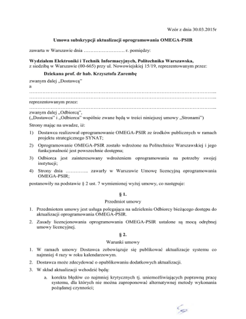 Wzór z dnia 30.03.2015r Umowa subskrypcji aktualizacji oprogramowania OMEGA-PSIR zawarta w Warszawie dnia ……………………. r. pomiędzy: Wydziałem Elektroniki i Technik Informacyjnych, Politechnika Warszawska, z siedzibą w Warszawie (00-665) przy ul. Nowowiejskiej 15/19, reprezentowanym przez: Dziekana prof. dr hab. Krzysztofa Zarembę zwanym dalej „Dostawcą” a …………………………………………………………………………………………………... …………………………………………………………………………………………………... reprezentowanym przez: …………………………………………………………………………………………………... zwanym dalej „Odbiorcą”, („Dostawca” i „Odbiorca” wspólnie zwane będą w treści niniejszej umowy „Stronami”) Strony mając na uwadze, iż: 1) Dostawca realizował oprogramowanie OMEGA-PSIR ze środków publicznych w ramach projektu strategicznego SYNAT; 2) Oprogramowanie OMEGA-PSIR zostało wdrożone na Politechnice Warszawskiej i jego funkcjonalność jest powszechnie dostępna; 3) Odbiorca jest zainteresowany wdrożeniem oprogramowania na potrzeby swojej instytucji; 4) Strony dnia ………….. zawarły w Warszawie Umowę licencyjną oprogramowania OMEGA-PSIR; postanowiły na podstawie § 2 ust. 7 wymienionej wyżej umowy, co następuje: § 1. Przedmiot umowy 1. Przedmiotem umowy jest usługa polegająca na udzieleniu Odbiorcy bieżącego dostępu do aktualizacji oprogramowania OMEGA-PSIR. 2. Zasady licencjonowania oprogramowania OMEGA-PSIR ustalone są mocą odrębnej umowy licencyjnej. § 2. Warunki umowy 1. W ramach umowy Dostawca zobowiązuje się publikować aktualizacje systemu co najmniej 4 razy w roku kalendarzowym. 2. Dostawca może zdecydować o opublikowaniu dodatkowych aktualizacji. 3. W skład aktualizacji wchodzić będą: a. korekta błędów co najmniej krytycznych tj. uniemożliwiających poprawną pracę systemu, dla których nie można zaproponować alternatywnej metody wykonania pożądanej czynności; b. zmiany wynikające z konieczności dostosowania do zmian prawa, w szczególności zasad oceny jednostki wg MNiSW; c. nowe funkcjonalności w zakresie ustalonym przez Dostawcę; d. baza konferencji; e. baza czasopism (obejmuje listy A, B i C z MNiSW); f. wszystkie skrypty definiujące funkcjonalność Bazy Wiedzy (kontrola poprawności danych, kontrola dostępu, formularze, itp.) w formie zastosowanej w Bazie Wiedzy Politechniki Warszawskiej; g. dokumentacja instalacyjna oraz dokumentacja użytkownika w zakresie dostępnym na Politechnice Warszawskiej. 4. Aktualizacje będą publikowane w repozytorium oprogramowania Dostawcy, do którego dane dostępowe zostaną przekazane Odbiorcy w dniu podpisania umowy. Dostawca zobowiązuje się do poinformowania Odbiorcy o umieszczeniu aktualizacji oprogramowania. § 3. Czas trwania umowy i opłaty 1. Umowa zostaje zawarta na czas nieokreślony, który jest podzielony na okresy subskrypcji. 2. Okres subskrypcji trwa 12 miesięcy i liczony jest od dnia podpisania umowy. 3. Roczna opłata subskrypcji obowiązująca w chwili podpisania umowy wynosi netto …………….. PLN (słownie: netto …………………………………………….…… PLN). W ciągu 14 dni od dnia podpisania niniejszej umowy zostanie wystawiona przez Dostawcę faktura pro forma. 4. Opłata za kolejne okresy subskrypcji może ulec zmianie. Na 30 dni przed rozpoczęciem każdego kolejnego okresu subskrypcji zostanie wystawiona przez Dostawcę faktura pro forma wg obowiązującej w danym roku opłaty. 5. Cennik obowiązujący w chwili podpisania umowy stanowi załącznik do umowy. 6. Faktury należy opłacać w ciągu 30 dni od chwili dostarczenia ich do Odbiorcy. Opłacenie faktury jest jednoznaczne z przedłużeniem umowy na kolejny roczny okres subskrypcji. 7. Rozwiązanie umowy przez Odbiorcę może nastąpić poprzez nieopłacenie w terminie opłaty za kolejny rok aktualizacji. 8. Rozwiązanie umowy przez Dostawcę może nastąpić w dowolnym momencie jako skutek naruszenia warunków licencyjnych przez Odbiorcę. W przypadku stwierdzenia naruszenia warunków licencyjnych Dostawca wzywa Odbiorcę do usunięcia naruszenia w ciągu dwóch tygodni lub przywrócenia stanu zgodnego z Umową. Wezwanie zawiera wskazanie nieprawidłowości i jest wysłane pisemnie na adres Odbiorcy. Czas w którym Odbiorca musi usunąć nieprawidłowości liczony jest od daty odbioru wezwania przez Odbiorcę. Jeżeli Odbiorca nie usunie naruszeń, Dostawca ma prawo rozwiązania umowy w trybie natychmiastowym. 9. W przypadkach o których mowa w ust. 8, Odbiorca utraci dostęp do kolejnych aktualizacji i nie będzie mógł domagać się zwrotu opłaty z tytułu niepełnego wykorzystania okresu subskrypcji, w którym nastąpiło rozwiązanie umowy. § 4. Ograniczenie odpowiedzialności 1. Pozostają w mocy wszystkie ograniczenia zawarte w umowie licencyjnej, w szczególności: a. Dostawca nie ponosi odpowiedzialności za skutki zainstalowania, jak również za skutki zaniechania w zainstalowaniu przedmiotowych aktualizacji przez Odbiorcę. b. Niezależnie od pozostałych ograniczeń wyrażonych w Umowie, wszelka odpowiedzialność Dostawcy z tytułu niewykonania lub niewłaściwego wykonania niniejszej Umowy lub obowiązków dodatkowych przyjętych na siebie przez Dostawcę, jak również skutków instalowania i wykorzystywania Oprogramowania przez Odbiorcę, ograniczona jest do kwoty stanowiącej równowartość opłaty uiszczonej przez Odbiorcę w ramach oddzielnie zleconych usług dodatkowych. § 5. Postanowienia końcowe 1. Umowa wchodzi w życie z dniem podpisania. 2. Wszelkie zmiany niniejszej umowy wymagają zgody stron w formie pisemnej pod rygorem nieważności. 3. W sprawach nieuregulowanych umową mają zastosowanie odpowiednie przepisy Kodeksu cywilnego. 4. Ewentualne spory wynikłe z wykonania umowy rozstrz