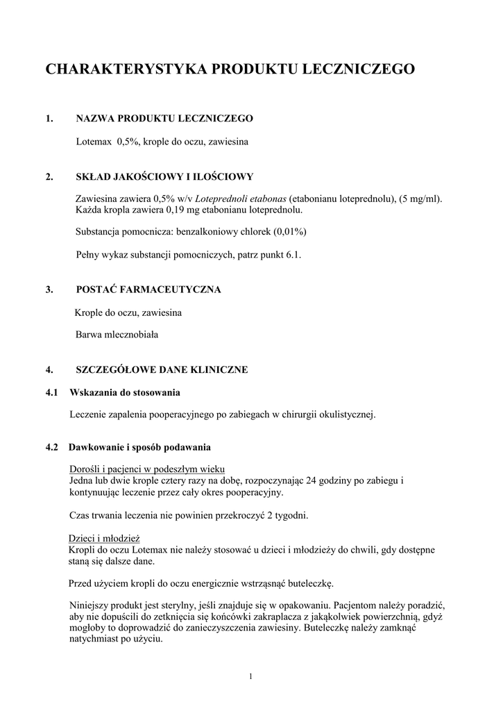 CHARAKTERYSTYKA PRODUKTU LECZNICZEGO 1. NAZWA PRODUKTU LECZNICZEGO Lotemax 0,5%, krople do oczu, zawiesina 2. SKŁAD JAKOŚCIOWY I ILOŚCIOWY Zawiesina zawiera 0,5% w/v Loteprednoli etabonas (etabonianu loteprednolu), (5 mg/ml). Każda kropla zawiera 0,19 mg etabonianu loteprednolu. Substancja pomocnicza: benzalkoniowy chlorek (0,01%) Pełny wykaz substancji pomocniczych, patrz punkt 6.1. 3. POSTAĆ FARMACEUTYCZNA Krople do oczu, zawiesina Barwa mlecznobiała 4. 4.1 SZCZEGÓŁOWE DANE KLINICZNE Wskazania do stosowania Leczenie zapalenia pooperacyjnego po zabiegach w chirurgii okulistycznej. 4.2 Dawkowanie i sposób podawania Dorośli i pacjenci w podeszłym wieku Jedna lub dwie krople cztery razy na dobę, rozpoczynając 24 godziny po zabiegu i kontynuując leczenie przez cały okres pooperacyjny. Czas trwania leczenia nie powinien przekroczyć 2 tygodni. Dzieci i młodzież Kropli do oczu Lotemax nie należy stosować u dzieci i młodzieży do chwili, gdy dostępne staną się dalsze dane. Przed użyciem kropli do oczu energicznie wstrząsnąć buteleczkę. Niniejszy produkt jest sterylny, jeśli znajduje się w opakowaniu. Pacjentom należy poradzić, aby nie dopuścili do zetknięcia się końcówki zakraplacza z jakąkolwiek powierzchnią, gdyż mogłoby to doprowadzić do zanieczyszczenia zawiesiny. Buteleczkę należy zamknąć natychmiast po użyciu. 1 4.3 Przeciwwskazania Krople do oczu Lotemax są przeciwwskazane w większości chorób wirusowych rogówki i spojówek, w tym nabłonkowym opryszczkowym zapaleniu rogówki (drzewkowatym zapaleniu rogówki), ospie krowiej, ospie wietrznej, a także w mykobakteryjnym zakażeniu oka i chorobach grzybiczych struktur ocznych, nieleczonych ropnych ostrych zakażeniach, które – podobnie jak inne choroby zakaźne – mogą być maskowane i zaostrzane przez kortykosteroidy, w zaczerwienieniu oka o nieznanym rozpoznaniu oraz zakażeniu wywołanym przez ameby. Są również przeciwwskazane w przypadkach nadwrażliwości na substancję czynną, którąkolwiek substancję pomocniczą i inne kortykosteroidy. 4.4 Specjalne ostrzeżenia i środki ostrożności dotyczące stosowania Długotrwałe stosowanie kortykosteroidów może prowadzić do nadciśnienia ocznego lub jaskry z uszkodzeniem nerwu wzrokowego, zmniejszeniem ostrości wzroku i pola widzenia, a także powstania zaćmy podtorebkowej tylnej. Steroidy należy stosować z zachowaniem szczególnej ostrożności gdy występuje jaskra. Dłuższe stosowanie kortykosteroidów może tłumić odpowiedź organizmu i zwiększać prawdopodobieństwo wtórnych zakażeń ocznych. Stwierdzono, że przy miejscowym stosowaniu steroidów w chorobach powodujących zmniejszenie grubości rogówki lub twardówki występowały przypadki perforacji. W ostrych stanach ropnych oka steroidy mogą maskować zakażenie lub nasilać obecną infekcję. Długotrwałe leczenie kortykosteroidami może wywołać grzybicę. W przypadku utrzymywania się owrzodzenia rogówki należy uwzględnić występowanie grzybicy w rozpoznaniu różnicowym. Lotemax zawiera chlorek benzalkoniowy, który może wywołać podrażnienie oczu. Generalnie pacjenci nie powinni nosić soczewek kontaktowych po zabiegu usunięcia zaćmy, chyba, że noszenie ich jest wskazane ze względów medycznych. Ponieważ produkt zawiera chlorek benzalkoniowy lek może powodować podrażnienie oczu. Należy unikać kontaktu leku z miękkimi soczewkami kontaktowymi. Należy usunąć soczewki kontaktowe przed zakropleniem i odczekać co najmniej 15 minut przed ponownym założeniem. Substancja zmienia zabarwienie soczewek kontaktowych. Jeśli po dwóch dniach objawy przedmiotowe i podmiotowe nie ulegną poprawie, pacjenta należy poddać ponownemu badaniu. Jeśli niniejszy produkt jest stosowany przez 10 dni lub dłużej, należy monitorować ciśnienie śródgałkowe. 4.5 Interakcje z innymi lekami i inne rodzaje interakcji Uwzględniając fakt, że etabonian loteprednolu nie jest wykrywalny w osoczu po miejscowym podaniu kropli Lotemax, nie należy spodziewać się, aby wpływał na farmakokinetykę produktów leczniczych podawanych ogólnoustrojowo. Niemniej na niewielki potencjał zwiększania ciśnienia śródgałkowego przez krople do oczu zawierające etabonian loteprednolu mogą negatywnie wpływać podawane ogólnoustrojowo produkty lecznicze o działaniu przeciwcholinergicznym. U pacjentów otrzymujących jednocześnie leki obniżające ciśnienie 2 śródgałkowe, dodanie etabonianu loteprednolu może zwiększyć ciśnienie śródgałkowe i zmniejszyć obserwowane działanie obniżające ciśnienie krwi tych produktów leczniczych. Jednoczesne podawanie leków porażających akomodację może zwiększyć ryzyko podwyższonego ciśnienia śródgałkowego. 4.6 Ciąża i laktacja Ciąża Brak danych klinicznych dotyczących stosowania zawiesiny do oczu Lotemax w czasie ciąży. Badania na zwierzętach wykazały szkodliwy wpływ na reprodukcję (patrz punkt. 5.3). Potencjalne zagrożenie dla człowieka nie jest znane, dlatego produktu Lotemax nie wolno stosować w okresie ciąży, jeśli nie jest to bezwzględnie konieczne. Laktacja Nie określono, czy etabonian loteprednolu jest wydzielany w mleku kobiecym. Wydzielanie etabonianu loteprednolu w mleku nie było badane na zwierzętach. Z tego względu stosowanie etabonianu loteprednolu u kobiet karmiących piersią jest przeciwwskazane. 4.7 Wpływ na zdolność prowadzenia pojazdów mechanicznych i obsługiwania urządzeń mechanicznych w ruchu Nie przeprowadzono badań nad wpływem produktu na zdolność prowadzenia pojazdów mechanicznych i obsługiwania urządzeń mechanicznych w ruchu. W przypadku wystąpienia przemijających zaburzeń widzenia pacjentowi należy zalecić odczekanie do momentu, aż ustąpią, przed przystąpieniem do prowadzenia pojazdów mechanicznych lub obsługiwania urządzeń mechanicznych w ruchu. 4.8 Działania niepożądane Reakcje związane ze stosowaniem steroidów oczn