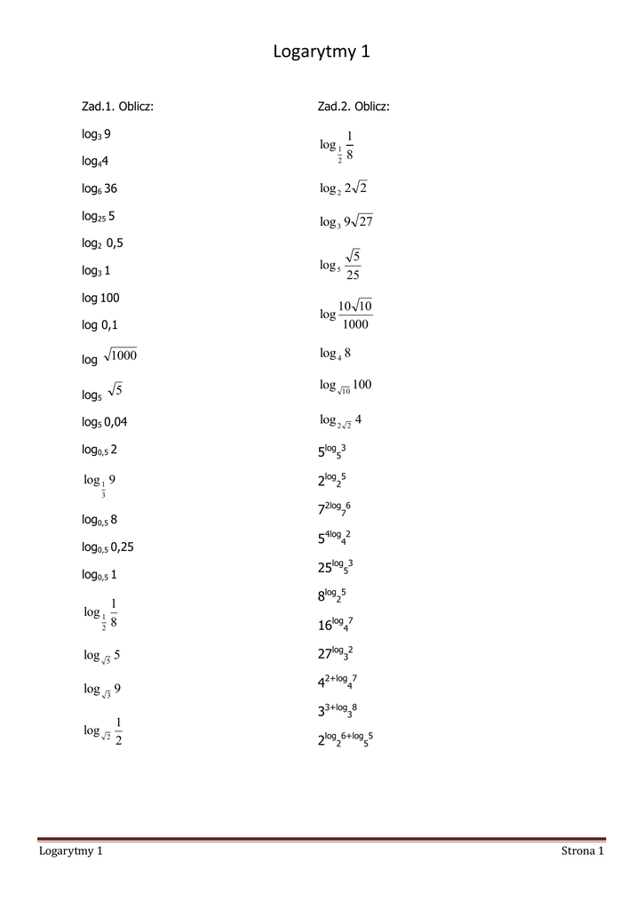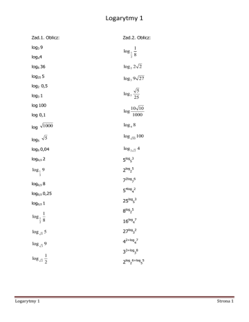 Logarytmy 1 Zad.1. Oblicz: log3 9 Zad.2. Oblicz: log 1 log44 2 log6 36 log25 5 1 8 log 2 2 2 log 3 9 27 log2 0,5 log 100 log 0,1 1000 log 5 25 log 5 log3 1 5 log5 log 10 10 1000 log 4 8 log 10 log5 0,04 log 2 log0,5 2 5log53 log 1 9 2log25 100 2 4 3 log0,5 8 log0,5 0,25 log0,5 1 1 log 1 8 2 log 5 log 9 3 log Logarytmy 1 2 5 1 2 72log76 54log42 25log53 8log25 16log47 27log32 42+log47 33+log38 2log26+log55 Strona 1 Zad.3. Oblicz: Zad.5. a) log0.36b=0.5 a) log7 7+log39 b) loga25=2/3 b) log9 3 –log216 c) log81x=0,25 c) log3(log28-2) d) log3 1+log24 d) log a 27 3 2 e) log5 125 - log55 f) log6(log525+4) g) h) log 5 1 log 2 8 25 log 7 49 log log 0,5 16 Zad.6. Oblicz wartość wyrażenia: 2 1 1 log 3 log 8 9 8 i) 4 9 log 3 27 e) 4 2 f) log 9 33 9 log 2 27 log 2 18 1 g) Zad.4. a) log2 x=3 h) log7(7 2+7 3) b) log0,5 x=4 c) log(x-3)=-1 i) log(x − 9) + 2log√2(x – 1) = 2 d) log4(2x-1)=0,5 e) log3(2x+3)=2 f) log3(log2x)=0 g) log2(log4x)=-1 h) log3(log5x+7)=2 i) log(5-4x)=0 j) log7x=-3 Zad.7. a) Wiedząc, że log a = −3, log b = 2 oblicz wartość wyrażenia a3 * b4. b) Wiedzac, że log a 1 2 i log b 1 oblicz 3 log ab c) Wiedząc, że log54=a i log53=b oblicz log2512 d) Oblicz log ab, wiedząc, że Logarytmy 1 Strona 2 log 10a 2010 i e) Wiemy, że log 10 1020 b . Wyznacz . f) g) h) i) Ile wynosi x jeżeli : a) log2log3x = 0 b) log3log4log3x = 0 Logarytmy 1 Strona 3