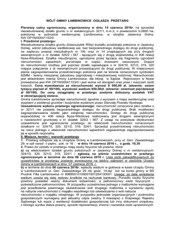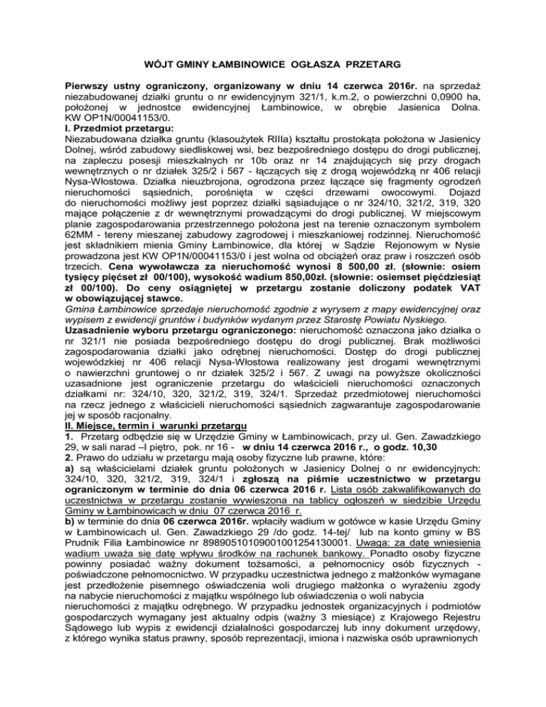 WÓJT GMINY ŁAMBINOWICE OGŁASZA PRZETARG Pierwszy ustny ograniczony, organizowany w dniu 14 czerwca 2016r. na sprzedaż niezabudowanej działki gruntu o nr ewidencyjnym 321/1, k.m.2, o powierzchni 0,0900 ha, położonej w jednostce ewidencyjnej Łambinowice, w obrębie Jasienica Dolna. KW OP1N/00041153/0. I. Przedmiot przetargu: Niezabudowana działka gruntu (klasoużytek RIIIa) kształtu prostokąta położona w Jasienicy Dolnej, wśród zabudowy siedliskowej wsi, bez bezpośredniego dostępu do drogi publicznej, na zapleczu posesji mieszkalnych nr 10b oraz nr 14 znajdujących się przy drogach wewnętrznych o nr działek 325/2 i 567 - łączących się z drogą wojewódzką nr 406 relacji Nysa-Włostowa. Działka nieuzbrojona, ogrodzona przez łączące się fragmenty ogrodzeń nieruchomości sąsiednich, porośnięta w części drzewami owocowymi. Dojazd do nieruchomości możliwy jest poprzez działki sąsiadujące o nr 324/10, 321/2, 319, 320 mające połączenie z dr wewnętrznymi prowadzącymi do drogi publicznej. W miejscowym planie zagospodarowania przestrzennego położona jest na terenie oznaczonym symbolem 62MM - tereny mieszanej zabudowy zagrodowej i mieszkaniowej rodzinnej. Nieruchomość jest składnikiem mienia Gminy Łambinowice, dla której w Sądzie Rejonowym w Nysie prowadzona jest KW OP1N/00041153/0 i jest wolna od obciążeń oraz praw i roszczeń osób trzecich. Cena wywoławcza za nieruchomość wynosi 8 500,00 zł. (słownie: osiem tysięcy pięćset zł 00/100), wysokość wadium 850,00zł. (słownie: osiemset pięćdziesiąt zł 00/100). Do ceny osiągniętej w przetargu zostanie doliczony podatek VAT w obowiązującej stawce. Gmina Łambinowice sprzedaje nieruchomość zgodnie z wyrysem z mapy ewidencyjnej oraz wypisem z ewidencji gruntów i budynków wydanym przez Starostę Powiatu Nyskiego. Uzasadnienie wyboru przetargu ograniczonego: nieruchomość oznaczona jako działka o nr 321/1 nie posiada bezpośredniego dostępu do drogi publicznej. Brak możliwości zagospodarowania działki jako odrębnej nieruchomości. Dostęp do drogi publicznej wojewódzkiej nr 406 relacji Nysa-Włostowa realizowany jest drogami wewnętrznymi o nawierzchni gruntowej o nr działek 325/2 i 567. Z uwagi na powyższe okoliczności uzasadnione jest ograniczenie przetargu do właścicieli nieruchomości oznaczonych działkami nr: 324/10, 320, 321/2, 319, 324/1. Sprzedaż przedmiotowej nieruchomości na rzecz jednego z właścicieli nieruchomości sąsiednich zagwarantuje zagospodarowanie jej w sposób racjonalny. II. Miejsce, termin i warunki przetargu 1. Przetarg odbędzie się w Urzędzie Gminy w Łambinowicach, przy ul. Gen. Zawadzkiego 29, w sali narad –I piętro, pok. nr 16 - w dniu 14 czerwca 2016 r., o godz. 10,30 2. Prawo do udziału w przetargu mają osoby fizyczne lub prawne, które: a) są właścicielami działek gruntu położonych w Jasienicy Dolnej o nr ewidencyjnych: 324/10, 320, 321/2, 319, 324/1 i zgłoszą na piśmie uczestnictwo w przetargu ograniczonym w terminie do dnia 06 czerwca 2016 r. Lista osób zakwalifikowanych do uczestnictwa w przetargu zostanie wywieszona na tablicy ogłoszeń w siedzibie Urzędu Gminy w Łambinowicach w dniu 07 czerwca 2016 r. b) w terminie do dnia 06 czerwca 2016r. wpłaciły wadium w gotówce w kasie Urzędu Gminy w Łambinowicach ul. Gen. Zawadzkiego 29 /do godz. 14-tej/ lub na konto gminy w BS Prudnik Filia Łambinowice nr 89890510109001001254130001. Uwaga: za datę wniesienia wadium uważa się datę wpływu środków na rachunek bankowy. Ponadto osoby fizyczne powinny posiadać ważny dokument tożsamości, a pełnomocnicy osób fizycznych poświadczone pełnomocnictwo. W przypadku uczestnictwa jednego z małżonków wymagane jest przedłożenie pisemnego oświadczenia woli drugiego małżonka o wyrażeniu zgody na nabycie nieruchomości z majątku wspólnego lub oświadczenia o woli nabycia nieruchomości z majątku odrębnego. W przypadku jednostek organizacyjnych i podmiotów gospodarczych wymagany jest aktualny odpis (ważny 3 miesiące) z Krajowego Rejestru Sądowego lub wypis z ewidencji działalności gospodarczej lub inny dokument urzędowy, z którego wynika status prawny, sposób reprezentacji, imiona i nazwiska osób uprawnionych -2do reprezentacji; pełnomocnictwo - w przypadku osób reprezentujących osobę prawną. Nabycie nieruchomości przez cudzoziemców może nastąpić w przypadku uzyskania zezwolenia Ministra Spraw Wewnętrznych i Administracji, jeżeli wymagają tego przepisy ustawy z dnia 24 marca 1920r. o nabywaniu nieruchomości przez cudzoziemców (t.j. Dz.U. z 2014r. poz.1380 ze zm.). 3. Wadium wniesione w pieniądzu przez uczestnika przetargu, który przetarg wygrał, zalicza się na poczet ceny nabycia nieruchomości. Pozostałym uczestnikom przetargu wadium zostaje zwrócone bezpośrednio po odwołaniu lub zamknięciu przetargu, jednak nie później niż przed upływem trzech dni od dnia odwołania lub zamknięcia przetargu. 4. Uczestnicy przetargu składają pisemne oświadczenia o znajomości przedmiotu sprzedaży i granic nieruchomości, braku zastrzeżeń do przedmiotu sprzedaży , kupna w stanie istniejącym, oraz o nabywaniu nieruchomości na podstawie dokumentów wydanych z ewidencji gruntów i budynków (druki pełnej treści oświadczeń dostępne przed otwarciem przetargu). 5. Dowód wpłaty wadium podlega przedłożeniu komisji przetargowej przed otwarciem przetargu. 6.Wadium przepada na rzecz sprzedawcy w razie uchylania się nabywcy od zawarcia umowy przenoszącej własność nieruchomości. 7.Ustalony w przetargu nabywca zobowiązany jest do dokonania wpłaty ceny nabycia nie później niż na dzień przed zawarciem umowy notarialnej przenoszącej własność oraz pokrycia wszelkich opłat związanych ze sporządzeniem umowy. O terminie i miejscu zawarcia umowy nabywca zostanie powiadomiony w odrębnej korespondencji. 8. Wydanie (przejęcie nieruchomości) nastąpi w dniu podpisania