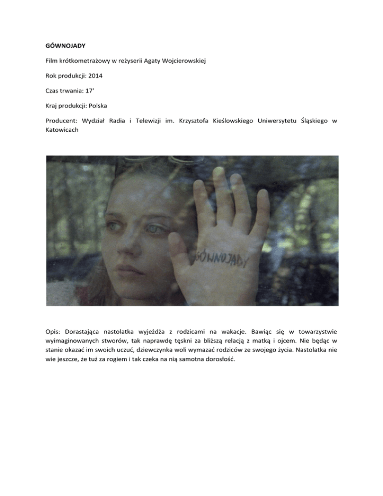 GÓWNOJADY Film krótkometrażowy w reżyserii Agaty Wojcierowskiej Rok produkcji: 2014 Czas trwania: 17' Kraj produkcji: Polska Producent: Wydział Radia i Telewizji im. Krzysztofa Kieślowskiego Uniwersytetu Śląskiego w Katowicach Opis: Dorastająca nastolatka wyjeżdża z rodzicami na wakacje. Bawiąc się w towarzystwie wyimaginowanych stworów, tak naprawdę tęskni za bliższą relacją z matką i ojcem. Nie będąc w stanie okazad im swoich uczud, dziewczynka woli wymazad rodziców ze swojego życia. Nastolatka nie wie jeszcze, że tuż za rogiem i tak czeka na nią samotna dorosłośd. Reżyser i scenarzystka: Agata Wojcierowska Studentka Reżyserii na Wydziale Radia i Telewizji im. Krzysztofa Kieślowskiego Uniwersytetu Śląskiego w Katowicach. Rysowniczka. Studiowała także Film Animowany i efekty specjalne w PWSFTVIT w Łodzi. Autorka kilku dokumentalnych. filmów krótkometrażowych, Zdjęcia: Krzysztof Trojnar Montaż: Wojciech Jagiełło Dźwięk: Jan Wrooski, Bartłomiej Woźniak, Paweł Janułajtys Muzyka: Bartłomiej Woźniak Scenografia: Ewa Sobczak Kostiumy: Sara Milczarek, Natalia Kacper Mleczak, Halina Mrożek, Karolina Łosik Kierownictwo produkcji: Ada Wojda, Katarzyna Tymusz Opieka artystyczna: Michał Rosa, Adam Sikora Obsada: Katarzyna Sawczuk, Sławomir Grzymkowski, Dorota Androsz animowanych i Szkoła filmowa: Wydział Radia i Telewizji im. Krzysztofa Kieślowskiego Uniwersytetu Śląskiego w Katowicach Wydział Radia i Telewizji im. Krzysztofa Kieślowskiego został utworzony w 1978 roku. W 2001 roku decyzją Senatu Uniwersytetu Śląskiego otrzymał imię Krzysztofa Kieślowskiego. Wydział jest jednostką organizacyjną Uniwersytetu Śląskiego prowadzącą kształcenie w szczególności w zakresie sztuki i dyscyplin artystycznych. Wydział Radia i Telewizji zatrudnia kadrę o najwyższym dorobku artystycznym i naukowym. Na Wydziale wykładają m.in. Krzysztof Zanussi, Filip Bajon, Jerzy Stuhr, Andrzej Fidyk, Maciej Pieprzyca i Michał Rosa. Wydział kształci studentów na trzech kierunkach: Reżyseria, Realizacja obrazu filmowego telewizyjnego i fotografia oraz Organizacja produkcji filmowej i telewizyjnej. Twórczośd studentów Wydziału jest prezentowana i nagradzana na krajowych i międzynarodowych festiwalach (np. Festiwal Polskich Filmów Fabularnych w Gdyni, Krakowski Festiwal Filmowy, Międzynarodowy Festiwal Filmowy Nowe Horyzonty, Camerimage, festiwale w Cottbus, San Sebastian, ClermontFerrand, Tampere, Santiago de Compostela, Kioto, Monachium, Nowym Jorku, Aspen, Wilnie, Kijowie i Bratysławie). Działalnośd w zakresie produkcji studenckich etiud filmowych Wydziału jest finansowana z dotacji z budżetu paostwa oraz ze środków programów operacyjnych Polskiego Instytutu Sztuki Filmowej. Oficjalna strona Wydziału: writv.us.edu.pl Dystrybucja i promocja filmu Michał Hudzikowski, [email protected], 663 573 247 Pokazy festiwalowe filmu 39. Festiwal Filmowy w Gdyni, Polska (2014) 43. Lubuskie Lato Filmowe, Polska (2014)