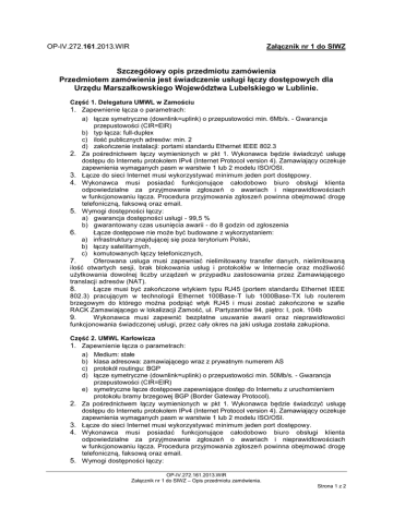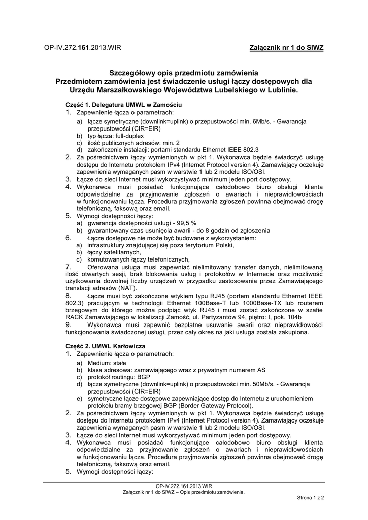 Załącznik nr 1 do SIWZ OP-IV.272.161.2013.WIR Szczegółowy opis przedmiotu zamówienia Przedmiotem zamówienia jest świadczenie usługi łączy dostępowych dla Urzędu Marszałkowskiego Województwa Lubelskiego w Lublinie. Część 1. Delegatura UMWL w Zamościu 1. Zapewnienie łącza o parametrach: a) łącze symetryczne (downlink=uplink) o przepustowości min. 6Mb/s. - Gwarancja przepustowości (CIR=EIR) b) typ łącza: full-duplex c) ilość publicznych adresów: min. 2 d) zakończenie instalacji: portami standardu Ethernet IEEE 802.3 2. Za pośrednictwem łączy wymienionych w pkt 1. Wykonawca będzie świadczyć usługę dostępu do Internetu protokołem IPv4 (Internet Protocol version 4). Zamawiający oczekuje zapewnienia wymaganych pasm w warstwie 1 lub 2 modelu ISO/OSI. 3. Łącze do sieci Internet musi wykorzystywać minimum jeden port dostępowy. 4. Wykonawca musi posiadać funkcjonujące całodobowo biuro obsługi klienta odpowiedzialne za przyjmowanie zgłoszeń o awariach i nieprawidłowościach w funkcjonowaniu łącza. Procedura przyjmowania zgłoszeń powinna obejmować drogę telefoniczną, faksową oraz email. 5. Wymogi dostępności łączy: a) gwarancja dostępności usługi - 99,5 % b) gwarantowany czas usunięcia awarii - do 8 godzin od zgłoszenia 6. Łącze dostępowe nie może być budowane z wykorzystaniem: a) infrastruktury znajdującej się poza terytorium Polski, b) łączy satelitarnych, c) komutowanych łączy telefonicznych, 7. Oferowana usługa musi zapewniać nielimitowany transfer danych, nielimitowaną ilość otwartych sesji, brak blokowania usług i protokołów w Internecie oraz możliwość użytkowania dowolnej liczby urządzeń w przypadku zastosowania przez Zamawiającego translacji adresów (NAT). 8. Łącze musi być zakończone wtykiem typu RJ45 (portem standardu Ethernet IEEE 802.3) pracującym w technologii Ethernet 100Base-T lub 1000Base-TX lub routerem brzegowym do którego można podpiąć wtyk RJ45 i musi zostać zakończone w szafie RACK Zamawiającego w lokalizacji Zamość, ul. Partyzantów 94, piętro: I, pok. 104b 9. Wykonawca musi zapewnić bezpłatne usuwanie awarii oraz nieprawidłowości funkcjonowania świadczonej usługi, przez cały okres na jaki usługa została zakupiona. Część 2. UMWL Karłowicza 1. Zapewnienie łącza o parametrach: a) Medium: stałe b) klasa adresowa: zamawiającego wraz z prywatnym numerem AS c) protokół routingu: BGP d) łącze symetryczne (downlink=uplink) o przepustowości min. 50Mb/s. - Gwarancja przepustowości (CIR=EIR) e) symetryczne łącze dostępowe zapewniające dostęp do Internetu z uruchomieniem protokołu bramy brzegowej BGP (Border Gateway Protocol). 2. Za pośrednictwem łączy wymienionych w pkt 1. Wykonawca będzie świadczyć usługę dostępu do Internetu protokołem IPv4 (Internet Protocol version 4). Zamawiający oczekuje zapewnienia wymaganych pasm w warstwie 1 lub 2 modelu ISO/OSI. 3. Łącze do sieci Internet musi wykorzystywać minimum jeden port dostępowy. 4. Wykonawca musi posiadać funkcjonujące całodobowo biuro obsługi klienta odpowiedzialne za przyjmowanie zgłoszeń o awariach i nieprawidłowościach w funkcjonowaniu łącza. Procedura przyjmowania zgłoszeń powinna obejmować drogę telefoniczną, faksową oraz email. 5. Wymogi dostępności łączy: OP-IV.272.161.2013.WIR Załącznik nr 1 do SIWZ – Opis przedmiotu zamówienia. Strona 1 z 2 a) gwarancja dostępności usługi - 99,5 % b) gwarantowany czas usunięcia awarii - do 8 godzin od zgłoszenia 6. Łącze dostępowe nie może być budowane z wykorzystaniem: a) infrastruktury znajdującej się poza terytorium Polski, b) łączy satelitarnych, c) komutowanych łączy telefonicznych, d) łączy technologii radiowych w pasmie nie podlegającym koncesjonowaniu w Urzędzie Komunikacji Elektronicznej, e) technologii Wi-Fi i technologii HSDPA. 7. Oferowana usługa musi zapewniać nielimitowany transfer danych, nielimitowaną ilość otwartych sesji, brak blokowania usług i protokołów w Internecie oraz możliwość użytkowania dowolnej liczby urządzeń w przypadku zastosowania przez Zamawiającego translacji adresów (NAT). 8. Łącze musi być zakończone wtykiem typu RJ45 (portem standardu Ethernet IEEE 802.3) pracującym w technologii Ethernet 100Base-T lub 1000Base-TX lub routerem brzegowym do którego można podpiąć wtyk RJ45 i musi zostać zakończone w szafie RACK Zamawiającego dla lokalizacji ul. Karłowicza 4, 20-027 Lublin. 9. Wykonawca musi zapewnić bezpłatne usuwanie awarii oraz nieprawidłowości funkcjonowania świadczonej usługi, przez cały okres na jaki usługa została zakupiona. 10. Wykonawca musi posiadać, co najmniej 3 punkty styku z Kraj owymi Dostawcami Internetowymi, w tym jeden z nich powinien być bezpośredni z siecią TPNET. OP-IV.272.161.2013.WIR Załącznik nr 1 do SIWZ – Opis przedmiotu zamówienia. Strona 2 z 2
