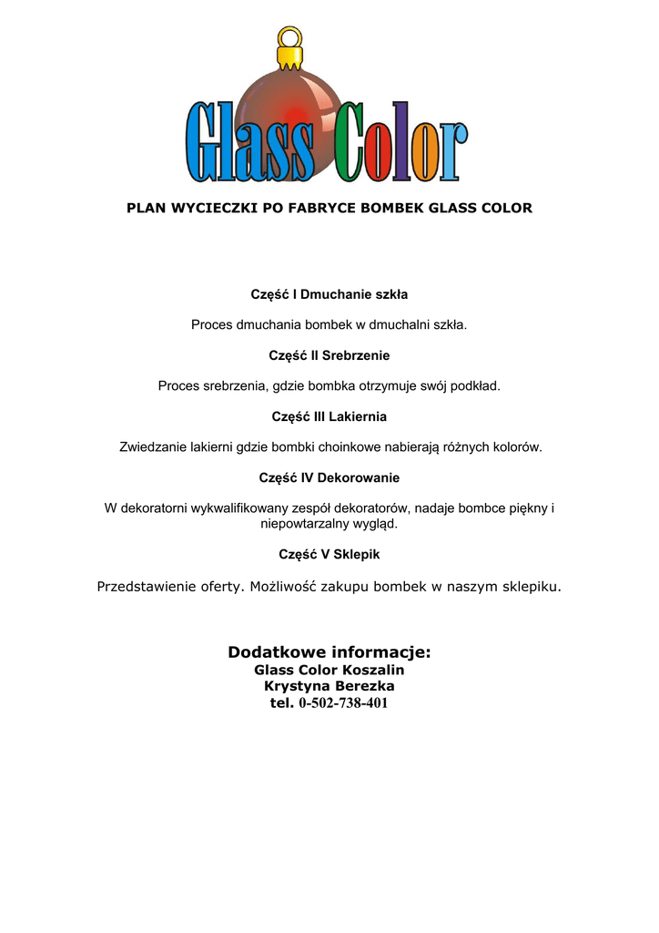 PLAN WYCIECZKI PO FABRYCE BOMBEK GLASS COLOR Część I Dmuchanie szkła Proces dmuchania bombek w dmuchalni szkła. Część II Srebrzenie Proces srebrzenia, gdzie bombka otrzymuje swój podkład. Część III Lakiernia Zwiedzanie lakierni gdzie bombki choinkowe nabierają różnych kolorów. Część IV Dekorowanie W dekoratorni wykwalifikowany zespół dekoratorów, nadaje bombce piękny i niepowtarzalny wygląd. Część V Sklepik Przedstawienie oferty. Możliwość zakupu bombek w naszym sklepiku. Dodatkowe informacje: Glass Color Koszalin Krystyna Berezka tel. 0-502-738-401