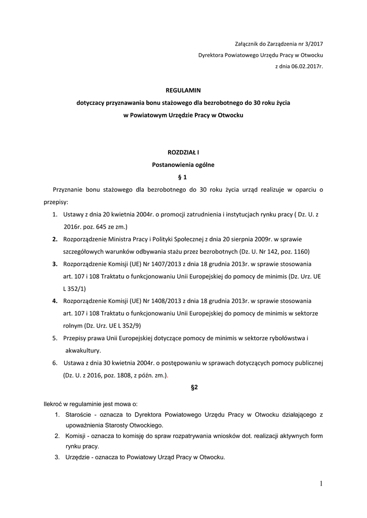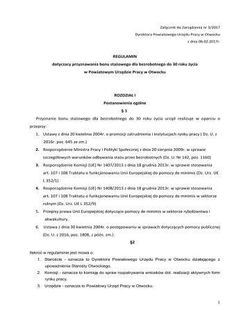 Załącznik do Zarządzenia nr 3/2017 Dyrektora Powiatowego Urzędu Pracy w Otwocku z dnia 06.02.2017r. REGULAMIN dotyczacy przyznawania bonu stażowego dla bezrobotnego do 30 roku życia w Powiatowym Urzędzie Pracy w Otwocku ROZDZIAŁ I Postanowienia ogólne §1 Przyznanie bonu stażowego dla bezrobotnego do 30 roku życia urząd realizuje w oparciu o przepisy: 1. Ustawy z dnia 20 kwietnia 2004r. o promocji zatrudnienia i instytucjach rynku pracy ( Dz. U. z 2016r. poz. 645 ze zm.) 2. Rozporządzenie Ministra Pracy i Polityki Społecznej z dnia 20 sierpnia 2009r. w sprawie szczegółowych warunków odbywania stażu przez bezrobotnych (Dz. U. Nr 142, poz. 1160) 3. Rozporządzenie Komisji (UE) Nr 1407/2013 z dnia 18 grudnia 2013r. w sprawie stosowania art. 107 i 108 Traktatu o funkcjonowaniu Unii Europejskiej do pomocy de minimis (Dz. Urz. UE L 352/1) 4. Rozporządzenie Komisji (UE) Nr 1408/2013 z dnia 18 grudnia 2013r. w sprawie stosowania art. 107 i 108 Traktatu o funkcjonowaniu Unii Europejskiej do pomocy de minimis w sektorze rolnym (Dz. Urz. UE L 352/9) 5. Przepisy prawa Unii Europejskiej dotyczące pomocy de minimis w sektorze rybołówstwa i akwakultury. 6. Ustawa z dnia 30 kwietnia 2004r. o postępowaniu w sprawach dotyczących pomocy publicznej (Dz. U. z 2016, poz. 1808, z późn. zm.). §2 Ilekroć w regulaminie jest mowa o: 1. Staroście - oznacza to Dyrektora Powiatowego Urzędu Pracy w Otwocku działającego z upoważnienia Starosty Otwockiego. 2. Komisji - oznacza to komisję do spraw rozpatrywania wniosków dot. realizacji aktywnych form rynku pracy. 3. Urzędzie - oznacza to Powiatowy Urząd Pracy w Otwocku. 1 4. Bezrobotnym - oznacza to osobę, o której mowa w art. 2 pkt. 2 ustawy z dnia 20 kwietnia 2004 r. o promocji zatrudnienia i instytucjach rynku pracy (tekst jednolity Dz. U. z 2016 r., poz. 645 z późn. zm.) 5. Stażu - oznacza nabywanie przez bezrobotnego umiejętności praktycznych, niezbędnych do podjęcia pracy przez wykonywanie zadań w miejscu pracy bez nawiązania stosunku pracy z Organizatorem. 6. Ustawie - oznacza to ustawę z dnia 20 kwietnia z 2004r. o promocji zatrudnienia i instytucjach rynku pracy (tekst jednolity Dz. U.2016 r., poz. 645 z poźn. zm.). 7. Organizatorze - oznacza to jednostkę, w której osoba bezrobotna skierowana przez Urząd odbywa lub ma odbyć staż. 8. Programie stażu – oznacza to zakres wykonywanych czynności lub zadań realizowanych przez bezrobotnego w ramach stażu. 9. Członka najbliższej rodziny - oznacza to: współmałżonka , zstępnych, wstępnych w linii prostej w pierwszym stopnia pokrewieństwa. ROZDZIAŁ II Warunki przyznawania bonu stażowego wynikające z obowiązujących przepisów §2 1. Bon stażowy stanowi gwarancję skierowania do odbycia stażu u pracodawcy wskazanego przez bezrobotnego na okres 6 miesięcy, o ile pracodawca zobowiąże się do zatrudnienia bezrobotnego po zakończeniu stażu przez okres 6 miesięcy. 2. O bon stażowy może ubiegać się osoba bezrobotna zarejestrowane w Powiatowym Urzędzie Pracy w Otwocku, która: 1) nie ukończyła 30 roku życia, 2) złożyła wniosek o przyznanie bonu stażowego, 3) znalazła pracodawcę do realizacji stażu, który zobowiązał się zatrudnić ją po zakończeniu stażu na okres 6 miesięcy 3. Przyznanie bonu stażowego następuje na podstawie indywidualnego planu działania. 4. Termin ważności bonu stażowego określa Starosta. 5. Pracodawcy, który zatrudni bezrobotnego przez deklarowany okres 6 miesięcy, Starosta wypłaca premię w wysokości 1500 zł. 6. Premia stanowi pomoc udzielaną zgodnie z warunkami dopuszczalności pomocy de minimis. 7. W ramach bonu stażowego Starosta finansuje: 1) koszty przejazdu do i z miejsca odbywania stażu – w formie ryczałtu, do wysokości 600 zł, wypłacanego bezrobotnemu w miesięcznych transzach w wysokości do 100 zł, łącznie ze stypendium; 2) koszty niezbędnych badań lekarskich lub psychologicznych – w formie wpłaty na konto wykonawcy badania. 2 8. Minister właściwy do spraw pracy, na podstawie komunikatu Prezesa Głównego Urzędu Statystycznego, ogłasza, w drodze obwieszczenia w Dzienniku Urzędowym Rzeczypospolitej Polskiej „Monitor Polski”, kwoty premii i kosztów przejazdu po waloryzacji. 9. Starosta może skierować bezrobotnych do 30 roku życia do odbycia stażu w ramach bonu stażowego na okres 6 miesięcy do pracodawcy, rolniczej spółdzielni produkcyjnej lub pełnoletniej osoby fizycznej, zamieszkującej i prowadzącej na terytorium Rzeczypospolitej Polskiej, osobiście i na własny rachunek, działalność w zakresie produkcji roślinnej lub zwierzęcej, w tym ogrodniczej, sadowniczej, pszczelarskiej i rybnej, w pozostającym w jej posiadaniu gospodarstwie rolnym obejmującym obszar użytków rolnych o powierzchni przekraczającej 2 ha przeliczeniowe lub prowadzącej dział specjalny produkcji rolnej, o którym mowa w ustawie z dnia 20 grudnia 1990 r. o ubezpieczeniu społecznym rolników. 10. Starosta może skierować bezrobotnych do 30 roku życia do odbycia stażu w ramach bonu stażowego na okres 6 miesięcy do przedsiębiorcy niezatrudniającego pracownika na zasadach przewidzianych dla pracodawców. 11. Staż w ramach bonu stażowego odbywa się na podstawie umowy zawartej w formie pisemnej przez Dyrektora Urzędu działającego z upoważnienia Starosty z pracodawcą według programu określonego w umowie. Umowa określa szczegółowe warunki realizacji stażu w ramach bonu stażowego. Przy ustalaniu programu powinny być uwzględnione predyspozycje psychofizyczne i zdrowotne, poziom wykształcenia oraz dotychczasowe kwalifikacje zawodowe bezrobotnego. Program powinien określać: 1) nazwę zawodu lub specjalności, której program dotyczy; 2) zakres zadań wykonywanych przez bezrobotnego; 3) rodzaj uzyskiwanych kwalifikacji lub umiejętności zawodowych; 4) sposób potwierdzenia nabytych kwalifikacji lub umiejętności zawodowych; 5) opiekuna osoby objętej prog