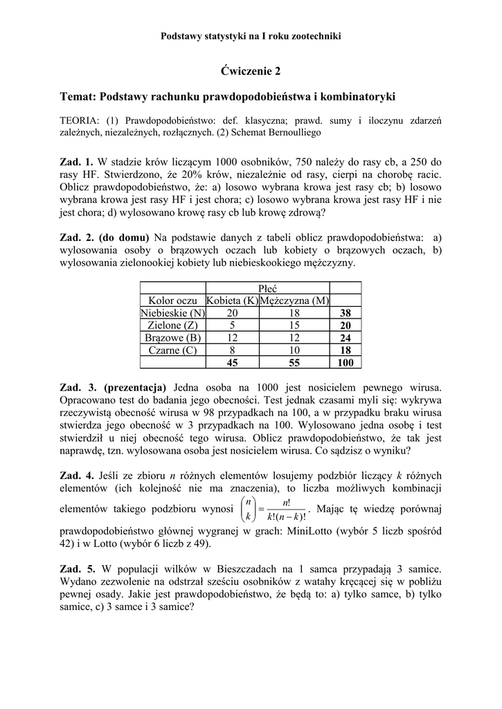 Podstawy statystyki na I roku zootechniki Ćwiczenie 2 Temat: Podstawy rachunku prawdopodobieństwa i kombinatoryki TEORIA: (1) Prawdopodobieństwo: def. klasyczna; prawd. sumy i iloczynu zdarzeń zależnych, niezależnych, rozłącznych. (2) Schemat Bernoulliego Zad. 1. W stadzie krów liczącym 1000 osobników, 750 należy do rasy cb, a 250 do rasy HF. Stwierdzono, że 20% krów, niezależnie od rasy, cierpi na chorobę racic. Oblicz prawdopodobieństwo, że: a) losowo wybrana krowa jest rasy cb; b) losowo wybrana krowa jest rasy HF i jest chora; c) losowo wybrana krowa jest rasy HF i nie jest chora; d) wylosowano krowę rasy cb lub krowę zdrową? Zad. 2. (do domu) Na podstawie danych z tabeli oblicz prawdopodobieństwa: a) wylosowania osoby o brązowych oczach lub kobiety o brązowych oczach, b) wylosowania zielonookiej kobiety lub niebieskookiego mężczyzny. Płeć Kolor oczu Kobieta (K) Mężczyzna (M) Niebieskie (N) 20 18 38 Zielone (Z) 5 15 20 Brązowe (B) 12 12 24 Czarne (C) 8 10 18 45 55 100 Zad. 3. (prezentacja) Jedna osoba na 1000 jest nosicielem pewnego wirusa. Opracowano test do badania jego obecności. Test jednak czasami myli się: wykrywa rzeczywistą obecność wirusa w 98 przypadkach na 100, a w przypadku braku wirusa stwierdza jego obecność w 3 przypadkach na 100. Wylosowano jedna osobę i test stwierdził u niej obecność tego wirusa. Oblicz prawdopodobieństwo, że tak jest naprawdę, tzn. wylosowana osoba jest nosicielem wirusa. Co sądzisz o wyniku? Zad. 4. Jeśli ze zbioru n różnych elementów losujemy podzbiór liczący k różnych elementów (ich kolejność nie ma znaczenia), to liczba możliwych kombinacji n n! elementów takiego podzbioru wynosi . Mając tę wiedzę porównaj k k!(n k )! prawdopodobieństwo głównej wygranej w grach: MiniLotto (wybór 5 liczb spośród 42) i w Lotto (wybór 6 liczb z 49). Zad. 5. W populacji wilków w Bieszczadach na 1 samca przypadają 3 samice. Wydano zezwolenie na odstrzał sześciu osobników z watahy kręcącej się w pobliżu pewnej osady. Jakie jest prawdopodobieństwo, że będą to: a) tylko samce, b) tylko samice, c) 3 samce i 3 samice?