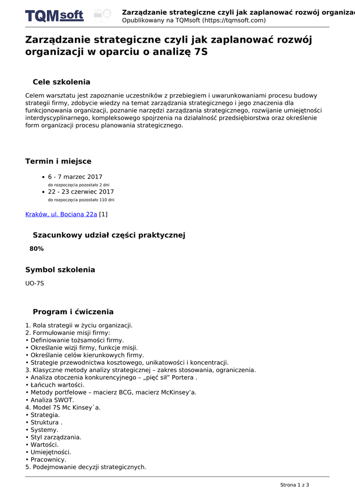 Zarządzanie strategiczne czyli jak zaplanować rozwój organizac Opublikowany na TQMsoft (https://tqmsoft.com) Zarządzanie strategiczne czyli jak zaplanować rozwój organizacji w oparciu o analizę 7S Cele szkolenia Celem warsztatu jest zapoznanie uczestników z przebiegiem i uwarunkowaniami procesu budowy strategii firmy, zdobycie wiedzy na temat zarządzania strategicznego i jego znaczenia dla funkcjonowania organizacji, poznanie narzędzi zarządzania strategicznego, rozwijanie umiejętności interdyscyplinarnego, kompleksowego spojrzenia na działalność przedsiębiorstwa oraz określenie form organizacji procesu planowania strategicznego. Termin i miejsce 6 - 7 marzec 2017 do rozpoczęcia pozostało 2 dni 22 - 23 czerwiec 2017 do rozpoczęcia pozostało 110 dni Kraków, ul. Bociana 22a [1] Szacunkowy udział części praktycznej 80% Symbol szkolenia UO-7S Program i ćwiczenia 1. Rola strategii w życiu organizacji. 2. Formułowanie misji firmy: • Definiowanie tożsamości firmy. • Określanie wizji firmy, funkcje misji. • Określanie celów kierunkowych firmy. • Strategie przewodnictwa kosztowego, unikatowości i koncentracji. 3. Klasyczne metody analizy strategicznej – zakres stosowania, ograniczenia. • Analiza otoczenia konkurencyjnego – „pięć sił” Portera . • Łańcuch wartości. • Metody portfelowe – macierz BCG, macierz McKinsey’a. • Analiza SWOT. 4. Model 7S Mc Kinsey`a. • Strategia. • Struktura . • Systemy. • Styl zarządzania. • Wartości. • Umiejętności. • Pracownicy. 5. Podejmowanie decyzji strategicznych. Strona 1 z 3 Zarządzanie strategiczne czyli jak zaplanować rozwój organizac Opublikowany na TQMsoft (https://tqmsoft.com) • Rola naczelnego kierownictwa. • Rola kadry kierowniczej średniego szczebla. • Uwarunkowania wynikające ze struktury kapitałowo – własnościowej. • Społeczno – organizacyjne uwarunkowania podejmowania decyzji strategicznych. 6. Systemowe spojrzenie na organizację. 7. Proces wdrażania strategii i jego wąskie gardła. • Decyzje strategiczne – narzędzia wspomagania, rola intuicji, czynnik ryzyka. • Wprowadzanie zmian strategicznych – czynniki oporu. • Upowszechnianie strategii, budowanie zaangażowania pracowników. Ćwiczenia: • Analiza otoczenia SWOT, PESTER – praca warsztatowa. • Diagnoza rozwoju organizacji – kwestionariusz Leppard, Quinn Quameron. • Diagram 7s - praca indywidualna bądź zespołowa w oparciu o organizacje uczestników. • Zasady formułowania celów – dyskusja moderowana. Adresaci średnia i wyższa kadra kierownicza oraz osoby zarządzające przedsiębiorstwem Korzyści dla uczestnika Po ukończeniu modułu uczestnik będzie posiadał następujące umiejętności: • dokonania analizy strategicznej metodami SWOT, PESTER, KCK, • sformułowania celu metodami SMART i WARTO, • stworzenia strategii z wykorzystaniem Analizy 7S, • określenia celów i wskaźników dla każdego S, • dokonania wyboru preferowanej metody zarządzania strategicznego, • stworzenia planu pracy nad przygotowaniem i wdrożeniem strategii. Korzyści dla przedsiębiorstwa Korzyści dla przedsiębiorstwa: • Analiza rozwoju własnej organizacji. • Rozwój organizacji poprzez świadome ustalanie celów i delegowanie przez osoby decyzyjne. • Wzrost lojalności pracowników poprzez efektywne kaskadowanie celów. • Budowa strategii w oparciu o sprawdzone i efektywne narzędzia. • Wybór właściwych wskaźników ilościowych i jakościowych adekwatnych do celów i strategii organizacji • Stworzenie SKUTECZNEJ STRATEGII, zrozumiałej dla wszystkich pracowników, która połączy długookresowe CELE firmy z bieżącymi zadaniami (przełoży misję i wizję w konkretne działania operacyjne). Metodyka wykład, ćwiczenia, case study, przykłady Strona 2 z 3 Zarządzanie strategiczne czyli jak zaplanować rozwój organizac Opublikowany na TQMsoft (https://tqmsoft.com) Informacje dodatkowe Cena szkolenia obejmuje: szkolenie, materiały, certyfikat uczestnictwa w szkoleniu, obiady, słodki poczęstunek, możliwość bezpłatnych, krótkich konsultacji do 3 miesięcy po szkoleniu, pomoc w rezerwacji hotelu oraz bezpłatny dostęp do elektronicznych materiałów szkoleniowych w systemie Biblioteka TQMsoft. Drukuj [2] Pdf [3] Wyślij e-mail [4] Share [5] Share [6] Tweet [7] Share [8] Źródłowy URL: https://tqmsoft.com/pl/szkolenia/zarzadzanie-strategiczne-czyli-jak-zaplanowacrozwoj-organizacji-w-oparciu-o-analize-7s Odnośniki [1] https://www.google.pl/maps/search/Kraków, ul. Bociana 22a [2] https://tqmsoft.com/print/14794 [3] https://tqmsoft.com/printpdf/14794 [4] mailto:?body=https%3A%2F%2Ftqmsoft.com%2Fpl%2Fprintpdf%2F14794 [5] https://www.linkedin.com/shareArticle?mini=true&source=TQMsoft.com&url=https%3A%2F%2Ft qmsoft.com%2Fpl%2Fprintpdf%2F14794 [6] https://www.facebook.com/sharer/sharer.php?u=https%3A%2F%2Ftqmsoft.com%2Fpl%2Fprintpd f%2F14794 [7] https://twitter.com/home?status=https%3A%2F%2Ftqmsoft.com%2Fpl%2Fprintpdf%2F14794 [8] https://plus.google.com/share?url=https%3A%2F%2Ftqmsoft.com%2Fpl%2Fprintpdf%2F14794 Strona 3 z 3