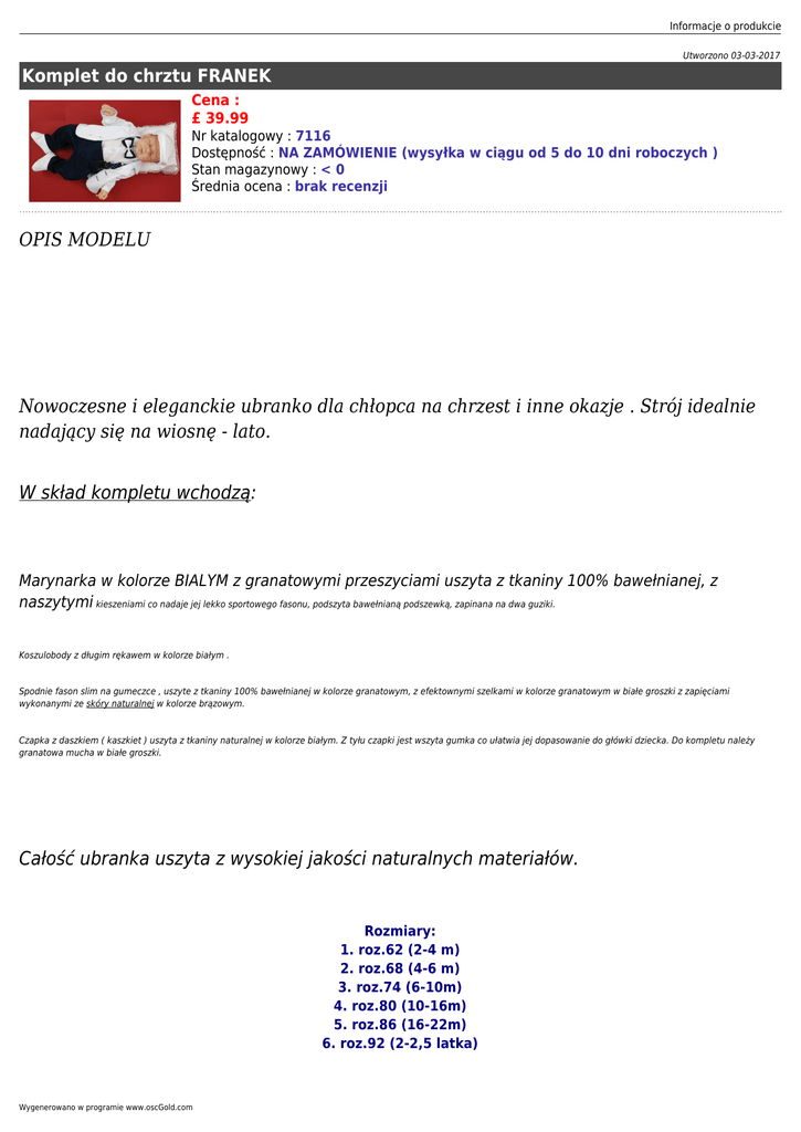 Informacje o produkcie Utworzono 03-03-2017 Komplet do chrztu FRANEK Cena : £ 39.99 Nr katalogowy : 7116 Dostępność : NA ZAMÓWIENIE (wysyłka w ciągu od 5 do 10 dni roboczych ) Stan magazynowy : < 0 Średnia ocena : brak recenzji OPIS MODELU Nowoczesne i eleganckie ubranko dla chłopca na chrzest i inne okazje . Strój idealnie nadający się na wiosnę - lato. W skład kompletu wchodzą: Marynarka w kolorze BIALYM z granatowymi przeszyciami uszyta z tkaniny 100% bawełnianej, z naszytymi kieszeniami co nadaje jej lekko sportowego fasonu, podszyta bawełnianą podszewką, zapinana na dwa guziki. Koszulobody z długim rękawem w kolorze białym . Spodnie fason slim na gumeczce , uszyte z tkaniny 100% bawełnianej w kolorze granatowym, z efektownymi szelkami w kolorze granatowym w białe groszki z zapięciami wykonanymi ze skóry naturalnej w kolorze brązowym. Czapka z daszkiem ( kaszkiet ) uszyta z tkaniny naturalnej w kolorze białym. Z tyłu czapki jest wszyta gumka co ułatwia jej dopasowanie do główki dziecka. Do kompletu należy granatowa mucha w białe groszki. Całość ubranka uszyta z wysokiej jakości naturalnych materiałów. Rozmiary: 1. roz.62 (2-4 m) 2. roz.68 (4-6 m) 3. roz.74 (6-10m) 4. roz.80 (10-16m) 5. roz.86 (16-22m) 6. roz.92 (2-2,5 latka) Wygenerowano w programie www.oscGold.com Przed zakupem proszę nas poinformować o rozmiarze ubranka oraz spytać o termin realizacji !!! Dostępne opcje Komplet do chrztu FRANEK » ROZMIAR: roz. 56, roz. 62, roz. 68, roz. 74, roz. 80, roz. 86.