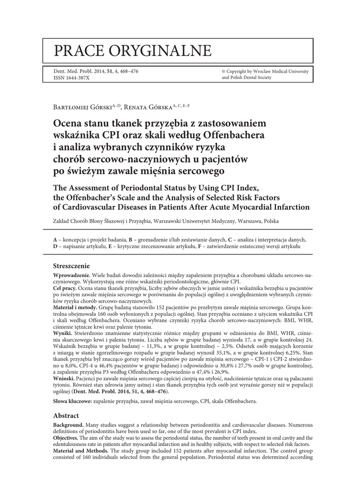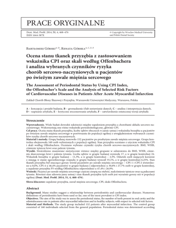 PRACe ORYGINALNe Dent. Med. Probl. 2014, 51, 4, 468–476 ISSN 1644-387X © Copyright by Wroclaw Medical University and Polish Dental Society Bartłomiej GórskiA–D, Renata GórskaA, C, E–F Ocena stanu tkanek przyzębia z zastosowaniem wskaźnika CPI oraz skali według Offenbachera i analiza wybranych czynników ryzyka chorób sercowo-naczyniowych u pacjentów po świeżym zawale mięśnia sercowego The Assessment of Periodontal Status by Using CPI Index, the Offenbacher’s Scale and the Analysis of Selected Risk Factors of Cardiovascular Diseases in Patients After Acute Myocardial Infarction Zakład Chorób Błony Śluzowej i Przyzębia, Warszawski Uniwersytet Medyczny, Warszawa, Polska A – koncepcja i projekt badania, B – gromadzenie i/lub zestawianie danych, C – analiza i interpretacja danych, D – napisanie artykułu, E – krytyczne zrecenzowanie artykułu, F – zatwierdzenie ostatecznej wersji artykułu Streszczenie Wprowadzenie. Wiele badań dowodzi zależności między zapaleniem przyzębia a chorobami układu sercowo-naczyniowego. Wykorzystują one różne wskaźniki periodontologiczne, głównie CPI. Cel pracy. Ocena stanu tkanek przyzębia, liczby zębów obecnych w jamie ustnej i wskaźnika bezzębia u pacjentów po świeżym zawale mięśnia sercowego w porównaniu do populacji ogólnej z uwzględnieniem wybranych czynników ryzyka chorób sercowo-naczyniowych. Materiał i metody. Grupę badaną stanowiło 152 pacjentów po przebytym zawale mięśnia sercowego. Grupa kontrolna obejmowała 160 osób wyłonionych z populacji ogólnej. Stan przyzębia oceniano z użyciem wskaźnika CPI i skali według Offenbachera. Oceniano wybrane czynniki ryzyka chorób sercowo-naczyniowych: BMI, WHR, ciśnienie tętnicze krwi oraz palenie tytoniu. Wyniki. Stwierdzono znamienne statystycznie różnice między grupami w odniesieniu do BMI, WHR, ciśnienia skurczowego krwi i palenia tytoniu. Liczba zębów w grupie badanej wyniosła 17, a w grupie kontrolnej 24. Wskaźnik bezzębia w grupie badanej – 11,3%, a w grupie kontrolnej – 2,5%. Odsetek osób mających korzenie z miazgą w stanie zgorzelinowego rozpadu w grupie badanej wynosił 35,1%, a w grupie kontrolnej 6,25%. Stan tkanek przyzębia był znacząco gorszy wśród pacjentów po zawale mięśnia sercowego – CPI-1 i CPI-2 stwierdzono u 8,0%, CPI-4 u 46,4% pacjentów w grupie badanej i odpowiednio u 30,8% i 27,7% osób w grupie kontrolnej, a zapalenie przyzębia P3 według Offenbachera odpowiednio u 47,4% i 26,9%. Wnioski. Pacjenci po zawale mięśnia sercowego częściej cierpią na otyłość, nadciśnienie tętnicze oraz są palaczami tytoniu. Również stan zdrowia jamy ustnej i stan tkanek przyzębia tych osób jest wyraźnie gorszy niż w populacji ogólnej (Dent. Med. Probl. 2014, 51, 4, 468–476). Słowa kluczowe: zapalenie przyzębia, zawał mięśnia sercowego, CPI, skala Offenbachera. Abstract Background. Many studies suggest a relationship between periodontitis and cardiovascular diseases. Numerous definitions of periodontitis have been used so far, one of the most prevalent is CPI index. Objectives. The aim of the study was to assess the periodontal status, the number of teeth present in oral cavity and the edentulousness rate in patients after myocardial infarction and in healthy subjects, with respect to selected risk factors. Material and Methods. The study group included 152 patients after myocardial infarction. The control group consisted of 160 individuals selected from the general population. Periodontal status was determined according 469 Stan przyzębia u pacjentów po zawale mięśnia sercowego to community periodontal index (CPI) and the Offenbacher scale. Selected risk factors were assessed: BMI, WHR, blood pressure andd tobacco smoking. Results. In the study group obesity, hypertenison and tobacco smoking occured statistically more often than in the control group. The number of teeth in the study group was 17, whereas in the control 24. Edentulousness rate in the study group reached 11.3% in contrast with 2.5% in the control. The percentatage of patients in the study group with roots with gangrene was 35.1%, whereas in control 6.25%. The periodontal status was worse in patients after myocardial infarction – CPI-1 and CPI-2 were found in 8.0%, CPI-3 in 46.4% patients in the study group and in the control in 30.8% and 27.7% respectively while periodontitis – P3 according to the Offenbacher scale in 47.4% and 26.9% respectively. Conclusions. The prevalence of obesity, hypertension and tobacco smoking is higher among patients after myocardial infarction. Moreover, oral health and periodontal status in this population is worse than in healthy individuals as well (Dent. Med. Probl. 2014, 51, 4, 468–476). Key words: periodontitis, myocardial infarction, CPI, Offenbacher scale. Choroby przyzębia są schorzeniami aparatu zawieszeniowego zęba o podłożu wieloczynnikowym i są główną przyczyną utraty zębów, zaburzeń czynności narządu żucia oraz pogorszenia komfortu życia u ludzi starszych. Częstotliwość występowania zapaleń przyzębia zwiększa się wraz z wiekiem, zaawansowane zapalenie przyzębia występuje u 1% osób w wieku 20–29 lat, w porównaniu z 39% w wieku powyżej 65 lat [1]. Zależności te potwierdzają przeprowadzone w ostatnich latach w Polsce badania epidemiologiczne, które objęły losowo wybranych Polaków w wieku 35–44 i 65–74 lata w różnych ośrodkach miejskich [2, 3]. Zdrowe przyzębia (CPI-0) zaobserwowano u 1,62% badanych w wieku 35–44 i 0,75% w wieku 65–74 lata. Najbardziej zaawansowana choroba (CPI-4) występowała u 19,47% w wieku 35–44 lata i u 31,89% w wieku 65–74 lata [2, 3]. Występowanie oraz zaawansowanie chorób przyzębia jest związane z wiekiem, płcią męską, uwarunkowaniami genetycznymi, niskim poziomem edukacji oraz niskim statusem socjoekonomicznym [4]. Palenie tytoniu i pewne choroby ogólnoustrojowe (np. cukrzyca, osteo