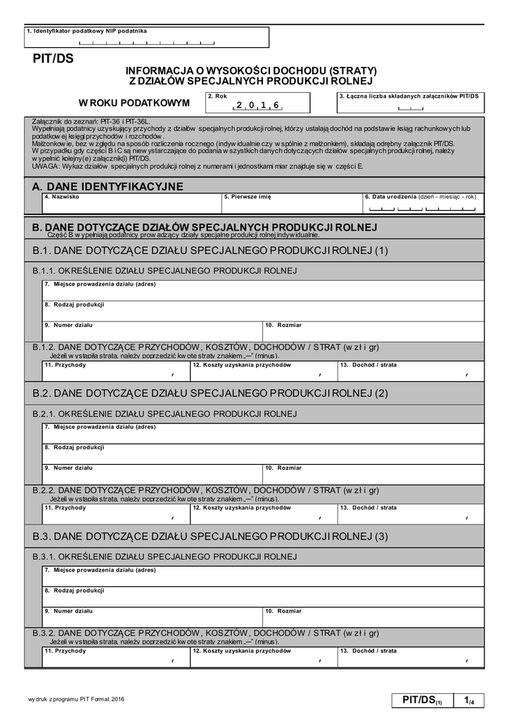 1. Identyfikator podatkowy NIP podatnika PIT/DS INFORMACJA O WYSOKOŚCI DOCHODU (STRATY) Z DZIAŁÓW SPECJALNYCH PRODUKCJI ROLNEJ 2. Rok W ROKU PODATKOWYM 3. Łączna liczba składanych załączników PIT/DS 2 0 1 6 Załącznik do zeznań: PIT-36 i PIT-36L. Wypełniają podatnicy uzyskujący przychody z działów specjalnych produkcji rolnej, którzy ustalają dochód na podstawie ksiąg rachunkowych lub podatkow ej księgi przychodów i rozchodów . Małżonkow ie, bez w zględu na sposób rozliczenia rocznego (indyw idualnie czy w spólnie z małżonkiem), składają odrębny załącznik PIT/DS. W przypadku gdy części B i C są niew ystarczające do podania w szystkich danych dotyczących działów specjalnych produkcji rolnej, należy w ypełnić kolejny(e) załącznik(i) PIT/DS. UWAGA: Wykaz działów specjalnych produkcji rolnej z numerami i jednostkami miar znajduje się w części E. A. DANE IDENTYFIKACYJNE 4. Nazwisko 5. Pierwsze imię 6. Data urodzenia (dzień - miesiąc - rok) B. DANE DOTYCZĄCE DZIAŁÓW SPECJALNYCH PRODUKCJI ROLNEJ Część B w ypełniają podatnicy prow adzący działy specjalne produkcji rolnej indywidualnie. B.1. DANE DOTYCZĄCE DZIAŁU SPECJALNEGO PRODUKCJI ROLNEJ (1) B.1.1. OKREŚLENIE DZIAŁU SPECJALNEGO PRODUKCJI ROLNEJ 7. Miej sce prowadzenia działu (adres) 8. Rodzaj produkcj i 9. Numer działu 10. Rozmiar B.1.2. DANE DOTYCZĄ CE PRZYCHODÓW , KOSZTÓW , DOCHODÓW / STRAT (w zł i gr) Jeżeli w ystąpiła strata, należy poprzedzić kw otę straty znakiem „─” (minus). 11. Przychody 12. Koszty uzyskania przychodów , 13. Dochód / strata , , B.2. DANE DOTYCZĄCE DZIAŁU SPECJALNEGO PRODUKCJI ROLNEJ (2) B.2.1. OKREŚLENIE DZIAŁU SPECJALNEGO PRODUKCJI ROLNEJ 7. Miej sce prowadzenia działu (adres) 8. Rodzaj produkcj i 9. Numer działu 10. Rozmiar B.2.2. DANE DOTYCZĄ CE PRZYCHODÓW , KOSZTÓW , DOCHODÓW / STRAT (w zł i gr) Jeżeli w ystąpiła strata, należy poprzedzić kw otę straty znakiem „─” (minus). 11. Przychody 12. Koszty uzyskania przychodów , 13. Dochód / strata , , B.3. DANE DOTYCZĄCE DZIAŁU SPECJALNEGO PRODUKCJI ROLNEJ (3) B.3.1. OKREŚLENIE DZIAŁU SPECJALNEGO PRODUKCJI ROLNEJ 7. Miej sce prowadzenia działu (adres) 8. Rodzaj produkcj i 9. Numer działu 10. Rozmiar B.3.2. DANE DOTYCZĄ CE PRZYCHODÓW , KOSZTÓW , DOCHODÓW / STRAT (w zł i gr) Jeżeli w ystąpiła strata, należy poprzedzić kw otę straty znakiem „─” (minus). 11. Przychody 12. Koszty uzyskania przychodów , wy druk z programu PIT Format 2016 13. Dochód / strata , , PIT/DS(1) 1/4 C. DANE DOTYCZĄCE DZIAŁÓW SPECJALNYCH PRODUKCJI ROLNEJ Część C w ypełniają podatnicy prow adzący działy specjalne produkcji rolnej wspólnie z innym podatnikiem/podatnikami lub w formie spółki niebędącej osobą prawną. C.1. DANE DOTYCZĄCE DZIAŁU SPECJALNEGO PRODUKCJI ROLNEJ (1) C.1.1. OKREŚLENIE DZIAŁU SPECJALNEGO PRODUKCJI ROLNEJ 14. Miej sce prowadzenia działu (adres) 15. Rodzaj produkcj i 16. Numer działu 10. Rozmiar 18. Udział podatnika , C.1.2. DANE DOTYCZĄ CE PRZYCHODÓW , KOSZTÓW , DOCHODÓW / STRAT (w zł i gr) Jeżeli w ystąpiła strata, należy poprzedzić kw otę straty znakiem „─” (minus). Przychód Koszty uzyskania przychodu przypadający na podatnika łączny 19. 20. łączny 21. , Dochód/strata przypadający na podatnika 22. , łączny (-na) 23. , przypadający (-ca) na podatnika 24. , , , C.2. DANE DOTYCZĄCE DZIAŁU SPECJALNEGO PRODUKCJI ROLNEJ (2) C.2.1. OKREŚLENIE DZIAŁU SPECJALNEGO PRODUKCJI ROLNEJ 14. Miej sce prowadzenia działu (adres) 15. Rodzaj produkcj i 16. Numer działu 10. Rozmiar 18. Udział podatnika , C.2.2. DANE DOTYCZĄ CE PRZYCHODÓW , KOSZTÓW , DOCHODÓW / STRAT (w zł i gr) Jeżeli w ystąpiła strata, należy poprzedzić kw otę straty znakiem „─” (minus). Przychód Koszty uzyskania przychodu przypadający na podatnika łączny 19. 20. łączny 21. , Dochód/strata przypadający na podatnika 22. , łączny (-na) 23. , przypadający (-ca) na podatnika 24. , , , C.3. DANE DOTYCZĄCE DZIAŁU SPECJALNEGO PRODUKCJI ROLNEJ (3) B.3.1. OKREŚLENIE DZIAŁU SPECJALNEGO PRODUKCJI ROLNEJ 14. Miej sce prowadzenia działu (adres) 15. Rodzaj produkcj i 16. Numer działu 10. Rozmiar 18. Udział podatnika , B.3.2. DANE DOTYCZĄ CE PRZYCHODÓW , KOSZTÓW , DOCHODÓW / STRAT (w zł i gr) Jeżeli w ystąpiła strata, należy poprzedzić kw otę straty znakiem „─” (minus). Przychód Koszty uzyskania przychodu przypadający na podatnika łączny 19. 20. przypadający na podatnika łączny 21. , , Dochód/strata 22. , łączny (-na) 23. przypadający (-ca) na podatnika 24. , , , D. ŁĄCZNY PRZYCHÓD, KOSZTY, DOCHÓD LUB STRATA PODATNIKA Z DZIAŁÓW SPECJALNYCH PRODUKCJI ROLNEJ (w zł i gr) 1) Kwoty wy nikające z poz. od 25 do 28 należy wpisać odpowiednio do poz. 59–62 lub poz. 110–113 zeznania PIT-36 albo do poz. 18–21 zeznania PIT-36L. 25. Przychody (suma kwot ze wszystkich poz. 11 i 20) 26. Koszty uzyskania przychodów (suma kwot ze wszystkich poz. 12 i 22) , , 27. Dochód (j eżeli kwota z poz. 25 j est większa 28. Strata (j eżeli kwota z poz. 26 j est większa od kwoty z poz. 26, od kwoty z poz. 25 od kwoty z poz. 25, od kwoty z poz. 26 należy odj ąć kwotę z poz. 26) należy odj ąć kwotę z poz. 25) , , 1) Jeżeli podatnik składa w ięcej niż jeden załącznik PIT/DS, część D w ypełnia na jednym załączniku, z tym że w części D w poz. 25 i 26 sumuje odpowiednie kwoty ze wszystkich załączników . PIT/DS(1) 2/4 wy druk z programu PIT Format 2016 E. WYKAZ DZIAŁÓW SPECJALNYCH PRODUKCJI ROLNEJ Z NUMERAMI I JEDNOSTKAMI MIAR 01-12 Uprawy w szklarniach, tunelach foliowych ogrzewanych, uprawy grzybów, roślin in vitro, hodowla entomofagów 01 02 Szklarnie ogrzewane Rośliny ozdobne.................................................................................................................m2 Rośliny pozostałe ....................................................................