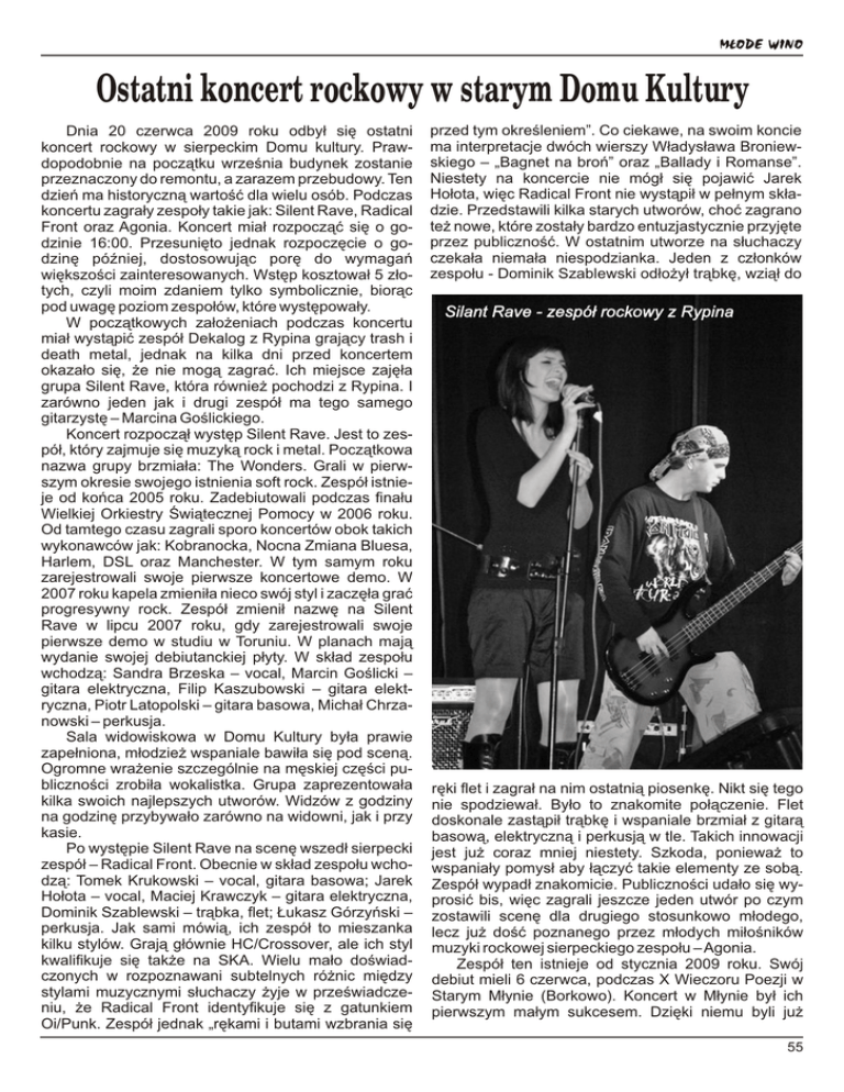 M£ODE WINO Ostatni koncert rockowy w starym Domu Kultury Dnia 20 czerwca 2009 roku odby³ siê ostatni koncert rockowy w sierpeckim Domu kultury. Prawdopodobnie na pocz¹tku wrzeœnia budynek zostanie przeznaczony do remontu, a zarazem przebudowy. Ten dzieñ ma historyczn¹ wartoœæ dla wielu osób. Podczas koncertu zagra³y zespo³y takie jak: Silent Rave, Radical Front oraz Agonia. Koncert mia³ rozpocz¹æ siê o godzinie 16:00. Przesuniêto jednak rozpoczêcie o godzinê póŸniej, dostosowuj¹c porê do wymagañ wiêkszoœci zainteresowanych. Wstêp kosztowa³ 5 z³otych, czyli moim zdaniem tylko symbolicznie, bior¹c pod uwagê poziom zespo³ów, które wystêpowa³y. W pocz¹tkowych za³o¿eniach podczas koncertu mia³ wyst¹piæ zespó³ Dekalog z Rypina graj¹cy trash i death metal, jednak na kilka dni przed koncertem okaza³o siê, ¿e nie mog¹ zagraæ. Ich miejsce zajê³a grupa Silent Rave, która równie¿ pochodzi z Rypina. I zarówno jeden jak i drugi zespó³ ma tego samego gitarzystê – Marcina Goœlickiego. Koncert rozpocz¹³ wystêp Silent Rave. Jest to zespó³, który zajmuje siê muzyk¹ rock i metal. Pocz¹tkowa nazwa grupy brzmia³a: The Wonders. Grali w pierwszym okresie swojego istnienia soft rock. Zespó³ istnieje od koñca 2005 roku. Zadebiutowali podczas fina³u Wielkiej Orkiestry Œwi¹tecznej Pomocy w 2006 roku. Od tamtego czasu zagrali sporo koncertów obok takich wykonawców jak: Kobranocka, Nocna Zmiana Bluesa, Harlem, DSL oraz Manchester. W tym samym roku zarejestrowali swoje pierwsze koncertowe demo. W 2007 roku kapela zmieni³a nieco swój styl i zaczê³a graæ progresywny rock. Zespó³ zmieni³ nazwê na Silent Rave w lipcu 2007 roku, gdy zarejestrowali swoje pierwsze demo w studiu w Toruniu. W planach maj¹ wydanie swojej debiutanckiej p³yty. W sk³ad zespo³u wchodz¹: Sandra Brzeska – vocal, Marcin Goœlicki – gitara elektryczna, Filip Kaszubowski – gitara elektryczna, Piotr Latopolski – gitara basowa, Micha³ Chrzanowski – perkusja. Sala widowiskowa w Domu Kultury by³a prawie zape³niona, m³odzie¿ wspaniale bawi³a siê pod scen¹. Ogromne wra¿enie szczególnie na mêskiej czêœci publicznoœci zrobi³a wokalistka. Grupa zaprezentowa³a kilka swoich najlepszych utworów. Widzów z godziny na godzinê przybywa³o zarówno na widowni, jak i przy kasie. Po wystêpie Silent Rave na scenê wszed³ sierpecki zespó³ – Radical Front. Obecnie w sk³ad zespo³u wchodz¹: Tomek Krukowski – vocal, gitara basowa; Jarek Ho³ota – vocal, Maciej Krawczyk – gitara elektryczna, Dominik Szablewski – tr¹bka, flet; £ukasz Górzyñski – perkusja. Jak sami mówi¹, ich zespó³ to mieszanka kilku stylów. Graj¹ g³ównie HC/Crossover, ale ich styl kwalifikuje siê tak¿e na SKA. Wielu ma³o doœwiadczonych w rozpoznawani subtelnych ró¿nic miêdzy stylami muzycznymi s³uchaczy ¿yje w przeœwiadczeniu, ¿e Radical Front identyfikuje siê z gatunkiem Oi/Punk. Zespó³ jednak „rêkami i butami wzbrania siê przed tym okreœleniem”. Co ciekawe, na swoim koncie ma interpretacje dwóch wierszy W³adys³awa Broniewskiego – „Bagnet na broñ” oraz „Ballady i Romanse”. Niestety na koncercie nie móg³ siê pojawiæ Jarek Ho³ota, wiêc Radical Front nie wyst¹pi³ w pe³nym sk³adzie. Przedstawili kilka starych utworów, choæ zagrano te¿ nowe, które zosta³y bardzo entuzjastycznie przyjête przez publicznoœæ. W ostatnim utworze na s³uchaczy czeka³a niema³a niespodzianka. Jeden z cz³onków zespo³u - Dominik Szablewski od³o¿y³ tr¹bkê, wzi¹³ do Silant Rave - zespó³ rockowy z Rypina rêki flet i zagra³ na nim ostatni¹ piosenkê. Nikt siê tego nie spodziewa³. By³o to znakomite po³¹czenie. Flet doskonale zast¹pi³ tr¹bkê i wspaniale brzmia³ z gitar¹ basow¹, elektryczn¹ i perkusj¹ w tle. Takich innowacji jest ju¿ coraz mniej niestety. Szkoda, poniewa¿ to wspania³y pomys³ aby ³¹czyæ takie elementy ze sob¹. Zespó³ wypad³ znakomicie. Publicznoœci uda³o siê wyprosiæ bis, wiêc zagrali jeszcze jeden utwór po czym zostawili scenê dla drugiego stosunkowo m³odego, lecz ju¿ doœæ poznanego przez m³odych mi³oœników muzyki rockowej sierpeckiego zespo³u – Agonia. Zespó³ ten istnieje od stycznia 2009 roku. Swój debiut mieli 6 czerwca, podczas X Wieczoru Poezji w Starym M³ynie (Borkowo). Koncert w M³ynie by³ ich pierwszym ma³ym sukcesem. Dziêki niemu byli ju¿ 55