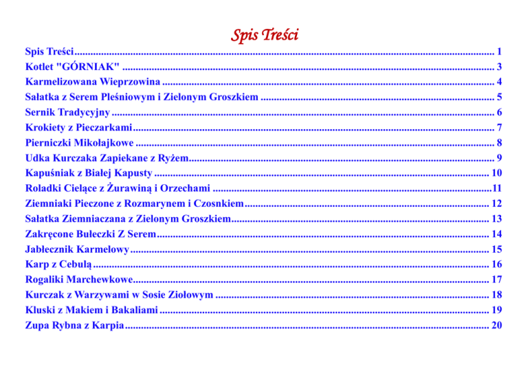 Spis Treści Spis Treści .............................................................................................................................................................. 1 Kotlet "GÓRNIAK" ............................................................................................................................................ 3 Karmelizowana Wieprzowina ............................................................................................................................. 4 Sałatka z Serem Pleśniowym i Zielonym Groszkiem ........................................................................................ 5 Sernik Tradycyjny ................................................................................................................................................ 6 Krokiety z Pieczarkami ........................................................................................................................................ 7 Pierniczki Mikołajkowe ....................................................................................................................................... 8 Udka Kurczaka Zapiekane z Ryżem................................................................................................................... 9 Kapuśniak z Białej Kapusty .............................................................................................................................. 10 Roladki Cielące z Żurawiną i Orzechami .........................................................................................................11 Ziemniaki Pieczone z Rozmarynem i Czosnkiem ............................................................................................ 12 Sałatka Ziemniaczana z Zielonym Groszkiem ................................................................................................. 13 Zakręcone Bułeczki Z Serem ............................................................................................................................. 14 Jabłecznik Karmelowy ....................................................................................................................................... 15 Karp z Cebulą ..................................................................................................................................................... 16 Rogaliki Marchewkowe...................................................................................................................................... 17 Kurczak z Warzywami w Sosie Ziołowym ....................................................................................................... 18 Kluski z Makiem i Bakaliami ............................................................................................................................ 19 Zupa Rybna z Karpia ......................................................................................................................................... 20 Migdałowa Zupa Wigilijna ................................................................................................................................ 21 Pierniczki na Choinkę ........................................................................................................................................ 22 Karp na Niebiesko .............................................................................................................................................. 23 Karp po Żydowsku ............................................................................................................................................. 24 Karp z Migdałami i Orzechami Włoskimi ....................................................................................................... 25 Zapiekanka Ziemniaczana................................................................................................................................. 26 Sałatka Śledziowa ............................................................................................................................................... 27 Pierogi z Serem ................................................................................................................................................... 28 Kompot z Winogron ........................................................................................................................................... 29 Śledzie w Pomidorach ........................................................................................................................................ 30 Żeberka z Kapustą Kiszoną ............................................................................................................................... 31 Pyszny Mus Czekoladowy.................................................................................................................................. 32 Ciasto Czekoladowo - Migdałowe ..................................................................................................................... 33 01-12-2015 Wtorek Kotlet "GÓRNIAK" Składniki: 3-4 kotlety ze schabu, 1/2 kg kiszonej kapusty, 1/2 kg pieczarek, 1 cebula, 2 łyżki masła, sól, pieprz, dowolne zioła, tłuszcz do smażenia. Ugotować kapustę kiszoną. Cebulę i pieczarki drobno posiekać i razem przesmażyć na maśle. Połączyć kapustę z grzybami, doprawić do smaku. Kotlety rozklepać, nakładać farsz i zwijać w roladki. Panierować, smażyć na gorącym tłuszczu. Spis treści 02-12-2015 Środa Karmelizowana Wieprzowina Składniki: 300 g polędwiczek wieprzowych, pokrojonych w kostkę, marynata: 4 łyżki sosu sojowego, 4 łyżki sosu worcestershire, 1,5 łyżki płynnego miodu, 3 łyżki oliwy, 1,5 łyżki soku z cytryny, szczypta suszonego czosnku, bulion warzywny, tymianek. Wymieszaj składniki marynaty: sos sojowy, sos worcestershire, miód, sok z cytryny, oliwę, dodaj suszony czosnek granulowany. Włóż do niej kawałki mięsa i dokładnie 