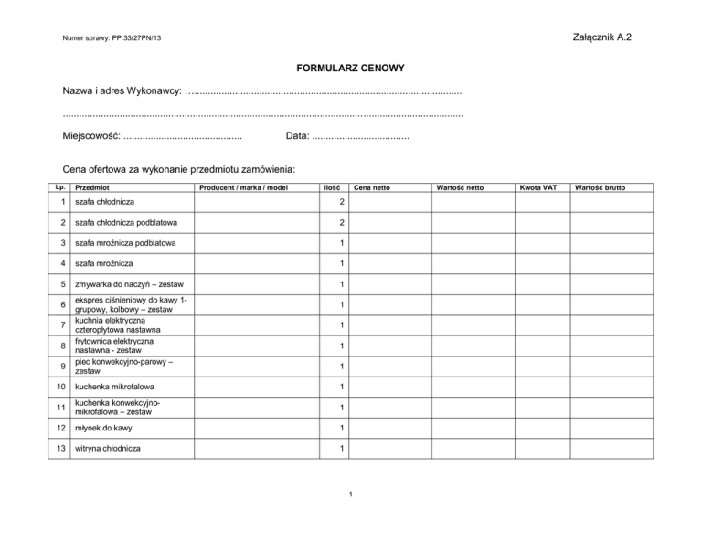 Załącznik A.2 Numer sprawy: PP.33/27PN/13 FORMULARZ CENOWY Nazwa i adres Wykonawcy: …................................................................................................... .................................................................................................................................................... Miejscowość: ............................................ Data: .................................... Cena ofertowa za wykonanie przedmiotu zamówienia: Lp. Przedmiot Producent / marka / model Ilość 1 szafa chłodnicza 2 2 szafa chłodnicza podblatowa 2 3 szafa mroźnicza podblatowa 1 4 szafa mroźnicza 1 5 zmywarka do naczyń – zestaw 1 6 7 8 9 ekspres ciśnieniowy do kawy 1grupowy, kolbowy – zestaw kuchnia elektryczna czteropłytowa nastawna frytownica elektryczna nastawna - zestaw piec konwekcyjno-parowy – zestaw Cena netto 1 1 1 1 10 kuchenka mikrofalowa 1 11 kuchenka konwekcyjnomikrofalowa – zestaw 1 12 młynek do kawy 1 13 witryna chłodnicza 1 1 Wartość netto Kwota VAT Wartość brutto Załącznik A.2 Numer sprawy: PP.33/27PN/13 14 okap przyścienny skośny 1 15 stół roboczy ze zlewem prawy 2 16 stół roboczy z basenem prawy – zestaw 1 17 stół roboczy jezdny na kółkach 1 18 podstawa 1 19 stół wg projektu 1 20 regał ze stali chromowanej 1 21 stół ze zlewem i otworem na odpadki - zestaw 1 22 szafa przelotowa 1 23 regał magazynowy 1 24 stół przyścienny z blokiem trzech szuflad i dwiema półkami 1 25 regał magazynowy 1 26 regał magazynowy 1 27 kosz na odpadki 1 Ogółem I Lp. 1 2 3 4 Przedmiot talerz głęboki ø230 [mm] talerz płytki - kolacyjny ø270 [mm] talerz płytki – deserowy ø170 [mm] bulionówka 0.4l Producent / marka / model Ilość Cena netto 60 60 60 25 2 Wartość netto Kwota VAT Wartość brutto Załącznik A.2 Numer sprawy: PP.33/27PN/13 5 przykrywka do bulionówki 6 waza 3l 7 półmisek owalny 10 8 sosierka 10 9 salaterka ø240 [mm] 25 8 8 10 zestaw – 2 miseczki na dipy 0.08l + podstawka 15 11 filiżanka 0.20l ze spodkiem 60 12 filiżanka 0.10l ze spodkiem 15 13 zestaw - czajniczek 0.3l + filiżanka 0.3l + spodek 17 cm 20 14 cukiernica 0.25l 15 15 mlecznik 0.20l 5 16 mlecznik 0.05l 5 17 szklanka do latte o poj. 0.26l 12 18 zestaw do przypaw 5-cio elementowy (2xgruszka, serwetnik, wykałacznik) 12 19 maselnica 4 20 butelka - z opisem: ocet 4 21 butelka - z opisem: oliwa 4 22 butelka - z opisem: maggi 4 23 dzbanek o pojemności 1.00l 12 3 Załącznik A.2 Numer sprawy: PP.33/27PN/13 24 szklanka wysoka 60 25 łyżka stołowa 60 26 widelec stołowy 60 27 nóż stołowy 60 28 łyżeczka do herbaty 60 29 łyżeczka do kawy 24 30 widelczyk do ciast 60 31 nóż do tortu 1 32 łopatka do tortu 1 33 chochla 8 34 nóż uniwersalny 25cm 1 35 nóż uniwersalny 30cm 1 36 nóż do mięsa 1 37 nóż do obierania 1 38 nóż do krojenia 1 39 stalka do noży kuchennych 1 40 nóż do jarzyn 1 41 chochla kuchenna 0.25l 2 42 chochla kuchenna 0.50l 2 43 chochla kuchenna 0.75l 2 4 Załącznik A.2 Numer sprawy: PP.33/27PN/13 44 chochla kuchenna 1.00l 1 45 widedec do mięsa 1 46 łyżka cedzakowa 12cm 1 47 łyżka cedzakowa 14cm 1 48 łyżka do serwowania 1 49 rózga 8 ramion 1 50 rózga 7 ramion 1 51 łopatka kątowa 1 52 szczypce do ciasta 1 53 termometr do mięsa 3 54 termometr do lodówek i zamrażarek 6 55 lampa owadobójcza 2 56 taca kelnerska 6 57 warnik 2 58 termos stołowy z pompką 6 59 garnek wysoki z pokrywką 2.50l 3 60 garnek niski z pokrywką 5.00l 2 61 garnek wysoki z pokrywką 9.00l 1 62 garnek wysoki z pokrywką 6.30l 1 63 garnek średni z pokrywką 11.10l 1 5 Załącznik A.2 Numer sprawy: PP.33/27PN/13 64 garnek średni z pokrywką 22.40l 2 65 garnek niski z pokrywką 31.40l 2 66 patelnia 20cm 2 67 patelnia 28cm 2 68 zestaw akcesoriów do ekspresu do kawy 1 Ogółem II Ogółem I Ogółem II Suma Wartość z pozycji ogółem I i ogółem II należy dodać, a sumę tych wartości przenieść do formularza ofertowego – załącznik A.1 ............................................................................ (data i czytelny podpis wykonawcy) 6