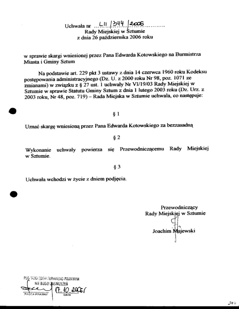 w sprawieskargiwniesionejprzezPanaEdwardaKotowskiegona Burmistrza