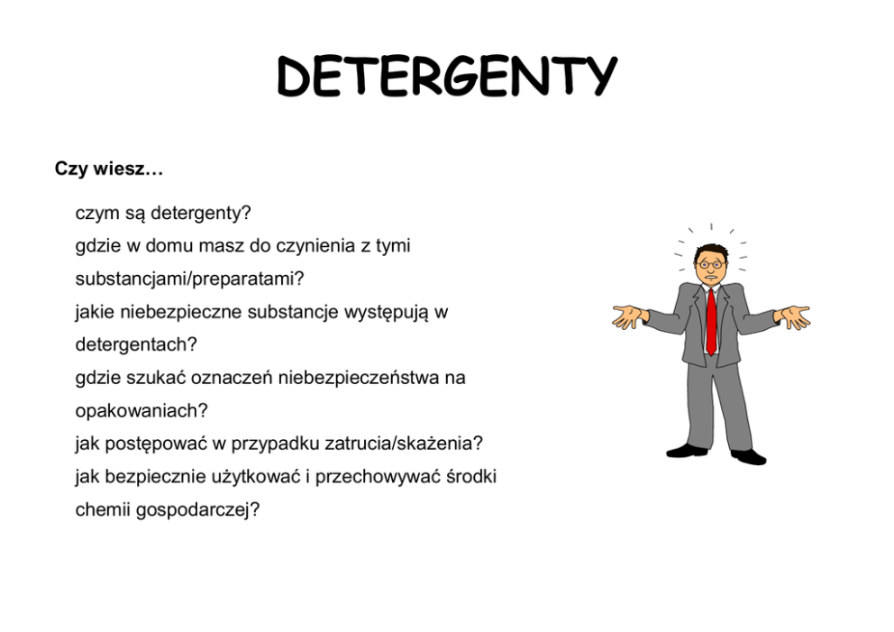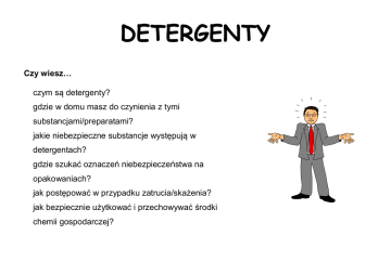 DETERGENTY Czy wiesz czym są detergenty? gdzie w domu masz do czynienia z tymi substancjami/preparatami? jakie niebezpieczne substancje występują w detergentach? gdzie szukać oznaczeń niebezpieczeństwa na opakowaniach? jak postępować w przypadku zatrucia/skażenia? jak bezpiecznie użytkować i przechowywać środki chemii gospodarczej? Detergenty to wszelkie substancje lub mieszaniny zawierające mydło i/lub inne substancje powierzchniowo czynne (czyli zmniejszające napięcie powierzchniowe wody) przeznaczone do prania, mycia i czyszczenia. Detergenty mogą mieć różną postać (płyn, proszek, pasta, kostka, wypraska, kształtka, granulki, itp.). Jest to najliczniejsza grupa środków chemicznych niebezpiecznych (lub potencjalnie niebezpiecznych) obecnych w każdym gospodarstwie domowym. W detergentach przeznaczonych do prania i mycia z reguły znajdują się bezpieczne niejonowe i anionowe środki powierzchniowo czynne często z dodatkiem fosforanów, enzymów i innych specyficznych składników. Niestety w większości preparatów przeznaczonych do czyszczenia i dezynfekcji toalet znajduje się podchloryn sodu o właściwościach żrących, wodorotlenek sodu o właściwościach żrących oraz różnorodne substancje o właściwościach drażniących. W środkach służących do wybielania i odplamiania mogą znajdować się: drażniący węglan sodu, żrący podchloryn sodu oraz żrący wodorotlenek sodu czy nadtlenek wodoru (utleniający, żrący). Stosunkowo największe zagrożenie stwarzają środki do udrażniania rur, ponieważ zawierają znaczne ilości żrącego wodorotlenku sodu. Wszystkie opakowania produktów chemii gospodarczej sklasyfikowane jako niebezpieczne muszą być odpowiednio oznakowane. Na każdej butelce, kartonie lub innym opakowaniu produktu zawierającego niebezpieczne składniki (w określonej przepisami prawa ilości) znajdują się piktogramy (symbole) określające rodzaj stwarzanego zagrożenia. Wszystkie te symbole wraz z opisem zagrożenia przedstawia poniższy obrazek. Rysunek 1 Oznaczenia substancji niebezpiecznych Rysunek 2 Przykładowa etykieta preparatu niebezpiecznego PIERWSZA POMOC W PRZYPADKU ZATRUCIA DETERGENTAMI Osobę, która uległa zatruciu wziewnemu (wdychała opary lub pyły substancji/preparatu niebezpiecznego) należy wynieść lub wyprowadzić na świeże powietrze, zapewnić jej spokój i ciepło. Jeżeli objawy zatrucia takie jak zawroty głowy, duszności, nudności, problemy z oddychaniem lub szeroko pojęty dyskomfort nie ustąpią należy skontaktować się z lekarzem. W przypadku, gdy osoba zatruta nie oddycha, lub oddech jest słaby lub nieregularny należy powiadomić pogotowie ratunkowe, w miarę możliwości prowadzić oddech zastępczy (sztuczne oddychanie). Osobę, która została oblana/obsypana detergentami należy potraktować tak samo jak osobę skażoną środkiem chemicznym, oznacza to, że z poszkodowanego należy zdjąć odzież i buty, usunąć resztki preparatu za skóry, spłukać go obficie chłodną wodą, po czym wytrzeć do sucha i obserwować skórę. Jeśli pojawią się objawy uczulenia lub oparzenia (zaczerwienienie, swędzenie, pęcherze) należy skontaktować się z lekarzem. Jeśli detergent dostał się do oka poszkodowanego należy natychmiast przemyć oczy bieżącą wodą, przez co najmniej 15 minut przy otwartych powiekach. Ponadto koniecznie należy zasięgnąć porady lekarza. W przypadku spożycia detergentów należy dokładnie wypłukać usta wodą. NIE WOLNO PROWOKOWAĆ WYMIOTÓW. W przypadku jakiegokolwiek dyskomfortu ze strony układu pokarmowego należy skontaktować się z lekarzem pokazując w miarę możliwości etykietę lub opakowanie produktu. Kontakt z detergentami niesklasyfikowanymi jako substancje/preparaty niebezpieczne z reguły nie stanowi zagrożenia dla zdrowia. Wyjątek stanowią osoby uczulone na substancje znajdujące się w składzie produktu. Kontakt z preparatami oznaczonymi jako niebezpieczne może być przyczyną chwilowego lub w skrajnych przypadkach trwałego uszczerbku na zdrowiu. Stosując detergenty sklasyfikowane jako preparaty niebezpieczne należy postępować zgodnie z instrukcją umieszczoną na opakowaniu. Ponadto należy zachować zdrowy rozsądek i umiar w dawkowaniu preparatu, ponieważ są to substancje szkodliwe dla środowiska naturalnego, i bardzo niebezpieczne dla organizmów wodnych. Szczególną ostrożność należy zachować podczas stosowania udrażniaczy do rur, gdyż zawarty w nich wodorotlenek sodu wchodzi w gwałtowną reakcję z wodą z wydzieleniem ciepła i żrącej piany. Ponadto każdy produkt niebezpieczny posiada kartę charakterystyki substancji niebezpiecznej dostępną w punktach sprzedaży, w której można znaleźć wszystkie informacje o wspomnianym produkcie, a także sposoby jego przechowywania i bezpiecznego użytkowania. Detergenty należy przechowywać w zamkniętych pojemnikach, w temperaturze pokojowej w miejscu niedostępnym dla dzieci i zwierząt domowych. DLA WŁASNEGO BEZPIECZEŃSTWA NALEŻY CZYTAĆ ETYKIETY PRODUKTÓW CHEMII GOSPODARCZEJ I W MIARĘ MOŻLIWOŚCI WYBIERAĆ I STOSOWAĆ TE, KTÓRE NIE ZOSTAŁY SKLASYFIKOWANE JAKO NIEBEZPIECZNE! Opracowanie: JRG II
