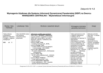 PKP SA Oddział Dworce Kolejowe w Warszawie Załącznik Nr 1.2 Wymagania UŜytkowe dla Systemu Informacji Dynamicznej PasaŜerskiej (SIDP) na Dworcu WARSZAWA CENTRALNA – Wyświetlacze Informacyjne Rodzaj / Opis Terminala Lokalizacja / Opis Tablica Główna (wyświetlacz) BieŜących Odjazdów Pociągów z zegarem analogowym HALA GŁOWNA ściana pod antresolą zachodnią strona południowa tGO: szt. 2 Struktura i zawartość danych Informacja na tGOz musi zawierać: Stałe napisy: „ODJAZDY / Departures” w języku polskim i angielskim w kolorze Ŝółtym jako nazwę tablicy, nad polem aktywnym, planowy / rozkładowy czas odjazdu pociągu kolumna: Czas / Time: 5 znaków numerycznych _99:99_ kolumna Pociąg / Train: 9 znaków alfanumerycznych kategoria i numer pociągu _AAA_99999_ kolumna Do / Destination: 20 znaków alfabetycznych _AAAAaaaaaa AAAaaaaAAA_ kolumna Przez / Via: min 50 znaków alfabetycznych _AAAAAA AAAaaaaaa………………..aaa AAAA_ kolumna Peron / Platform: 3 znaki alfanumeryczne _XXX_ kolumna Przewoźnik / Operator: 3 znaki alfabetyczne _XXX_, aktualnie uŜywane skróty Przewoźników: Wymagane minimalne parametry techniczne Uwagi Tablica jednostronna LCD z zegarem analogowym o średnicy 30 cm, wyświetlanie co najmniej 12 najwcześniej odjeŜdŜających pociągów w min.12 wierszach, w tym wiersza dodatkowego do wyświetlania komunikatów specjalnych w postaci przewijanych informacji tekstowych jak np.: UWAGA ! Pociągi:„ … „, odjeŜdŜają za stacji Warszawa Śródmieście”, prędkość przesuwu tekstu nie moŜe przekraczać 6 znaków na sekundę, czytelność informacji min z 25m, wysokość czcionki (dla wielkiej litery alfabetu łacińskiego) ≥ 96mm, Zalecana czcionka Sans Serif , w okresie próbnego uruchomienia Zamawiający dopuszcza zmianę czcionki i szczegółów dotyczących kolorów pól danych, kolorystyka urządzenia zgodnie z zał. 1.9. Postępowanie Nr D7a-223/1-2/2011 na wykonanie Systemu Informacji Dynamicznej PasaŜerskiej dla Dworca WARSZAWA CENTRALNA 1 PKP SA Oddział Dworce Kolejowe w Warszawie IC – PKP Intercity S.A. PR – Przewozy Regionalne Sp. z o.o. KM – Koleje Mazowieckie – KM Sp. z o.o. SKW – Szybka Kolej Miejska Sp. z o.o. kolumna Uwagi / Remarks: nazwa pociągu / informacja o odchyleniach od planu, w tym o opóźnieniach, nazwa pociągu pisana wielkimi literami i kursywą, opóźnienie w minutach, minimum 18 znaków alfanumerycznych _XXXXXxxxxxXXXXXxxx_, scroll Uwaga: druga tablica wyświetla kontynuację rozkładu jazdy odjazdów, tablicy pierwszej. parametry techniczne tablicy zdefiniowane w zał. Nr 1.9 – „wytyczne” pkt 3. i 4.1.1 obudowa spełnia min IP30, minimalne rozmiary tablicy; 2500(h) x 4500(w) mm Obudowa - zgodnie z Zał. 1.9, napisy- białe na niebieskim tle i niebieskie na białym tle (np. dla komunikatów specjalnych), interfejs LAN / Ethernet, transmisja VDSL2, wymiana danych TCP/IP Inne wymogi dot. wyświetlacza: Tolerancja wysokości (h) +150 mm, Tolerancja szerokości (w) + 200 mm, Odległość pomiędzy wierszami – min. 15 mm Powierzchnia pola aktywnego LCD: min. 6,93 2 m Przykładowe wizualizacje wyświetlaczy głównych znajdują się w zał. 1.9, pkt. 4.1.1.1 – przykład 1,2,3; pkt 4.1.1.4 – przykład 4 i są jedynie przykładem wizualizacji, nie dotyczą ilości linii, konkretnych napisów, wymiarów, itp. Postępowanie Nr D7a-223/1-2/2011 na wykonanie Systemu Informacji Dynamicznej PasaŜerskiej dla Dworca WARSZAWA CENTRALNA 2 PKP SA Oddział Dworce Kolejowe w Warszawie OPCJA Tablica Główna (wyświetlacz) BieŜących Odjazdów Pociągów (bez zegara) tGO2: szt. 1 OPCJA Tablica (wyświetlacz) BieŜących Przyjazdów Pociągów (bez zegara) tGP: szt. 1 HALA GŁOWNA, ściana pod antresolą wschodnią strona północna HALA GŁOWNA, ściana pod antresolą wschodnią strona południowa ściany Wymagane parametry jak dla Tablicy tGO. informacja na tGP musi zawierać: : Stały napis: „PRZYJAZDY / Arrivals” w języku polskim i angielskim w kolorze białym jako nazwę tablicy, nad polem aktywnym, struktura i zakres danych jak w tablicy tGO, z tym, Ŝe obecnie kolumna: czas / Time określa planowy / rozkładowy czas przyjazdu pociągu, zaś kolumnę: Do / Destination, zastępuje kolumna: Z / From Wymagane parametry jak dla Tablicy tGO. Uwagi jak dla tablicy tGO Tablica jednostronna LCD, wyświetlanie 12 najwcześniej przyjeŜdŜających pociągów w 12 wierszach w tym wiersza dodatkowego do wyświetlania komunikatów specjalnych w postaci przewijanych informacji tekstowych jak np.: UWAGA ! Pociągi:„ … „, przyjeŜdŜają ze stacji Warszawa Śródmieście”, prędkość przesuwu tekstu nie moŜe przekraczać 6 znaków na sekundę, czytelność informacji min z 25m , wysokość czcionki (dla wielkiej litery alfabetu łacińskiego) ≥ 96mm, parametry techniczne tablicy zdefiniowane w zał. Nr 1.9 – „wytyczne” pkt. 3. i 4.1.1 obudowa spełnia min IP30, minimalne rozmiary tablicy; 2500(h) x 4500(w) mm, obudowa- kolor ciemnoniebieski zgodnie z zał. 1.9, napisy- białe na niebieskim tle i niebieskie na białym tle (np. dla Uwagi jak dla tablicy tGO Postępowanie Nr D7a-223/1-2/2011 na wykonanie Systemu Informacji Dynamicznej PasaŜerskiej dla Dworca WARSZAWA CENTRALNA 3 PKP SA Oddział Dworce Kolejowe w Warszawie komunikatów specjalnych), interfejs LAN / Ethernet, opcjonalnie VDSL, wymiana danych TCP/IP. Uwaga: brak przygotowanych instalacji: energetycznej i informatycznej. Stosowne przyłącza realizuje Dostawca w uzgodnieniu z Zamawiającym. Inne wymogi dot. wyświetlacza: Tolerancja wysokości (h) +150 mm, Tolerancja szerokości (w) + 200 mm, Odległość pomiędzy wierszami – min. 15 mm Powierzchnia pola aktywnego LCD: min. 6,93 2 m Tablica Peronowa Krawędziowa (wyświetlacz) Odjazdu Pociągu z Toru, dwustronna (bez zegara) tKO: szt. 32 w sektorze 4,3,2 i 1 nad torem 7 w sektorze 4,3,2 i 1 nad torem 5 w sektorze 4,3,2 i 1 nad torem 3 w sektorze 4,3,2 i 1 nad torem 1 w