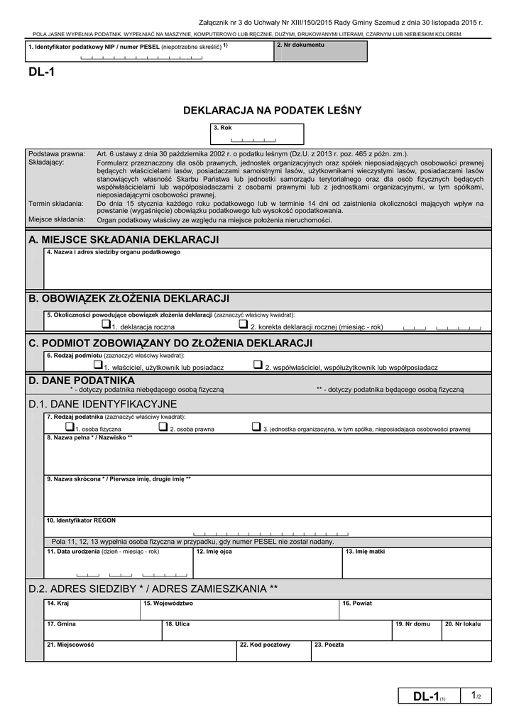 Załącznik nr 3 do Uchwały Nr XIII/150/2015 Rady Gminy Szemud z dnia 30 listopada 2015 r. POLA JASNE WYPEŁNIA PODATNIK. WYPEŁNIAĆ NA MASZYNIE, KOMPUTEROWO LUB RĘCZNIE, DUŻYMI, DRUKOWANYMI LITERAMI, CZARNYM LUB NIEBIESKIM KOLOREM. 1. Identyfikator podatkowy NIP / numer PESEL (niepotrzebne skreślić) 1) 2. Nr dokumentu DL-1 DEKLARACJA NA PODATEK LEŚNY 3. Rok Podstawa prawna: Składający: Termin składania: Miejsce składania: Art. 6 ustawy z dnia 30 października 2002 r. o podatku leśnym (Dz.U. z 2013 r. poz. 465 z późn. zm.). Formularz przeznaczony dla osób prawnych, jednostek organizacyjnych oraz spółek nieposiadających osobowości prawnej będących właścicielami lasów, posiadaczami samoistnymi lasów, użytkownikami wieczystymi lasów, posiadaczami lasów stanowiących własność Skarbu Państwa lub jednostki samorządu terytorialnego oraz dla osób fizycznych będących współwłaścicielami lub współposiadaczami z osobami prawnymi lub z jednostkami organizacyjnymi, w tym spółkami, nieposiadającymi osobowości prawnej. Do dnia 15 stycznia każdego roku podatkowego lub w terminie 14 dni od zaistnienia okoliczności mających wpływ na powstanie (wygaśnięcie) obowiązku podatkowego lub wysokość opodatkowania. Organ podatkowy właściwy ze względu na miejsce położenia nieruchomości. A. MIEJSCE SKŁADANIA DEKLARACJI 4. Nazwa i adres siedziby organu podatkowego B. OBOWIĄZEK ZŁOŻENIA DEKLARACJI 5. Okoliczności powodujące obowiązek złożenia deklaracji (zaznaczyć właściwy kwadrat): 1. deklaracja roczna 2. korekta deklaracji rocznej (miesiąc - rok) C. PODMIOT ZOBOWIĄZANY DO ZŁOŻENIA DEKLARACJI 6. Rodzaj podmiotu (zaznaczyć właściwy kwadrat): 1. właściciel, użytkownik lub posiadacz 2. współwłaściciel, współużytkownik lub współposiadacz D. DANE PODATNIKA * - dotyczy podatnika niebędącego osobą fizyczną ** - dotyczy podatnika będącego osobą fizyczną D.1. DANE IDENTYFIKACYJNE 7. Rodzaj podatnika (zaznaczyć właściwy kwadrat): 1. osoba fizyczna 8. Nazwa pełna * / Nazwisko ** 2. osoba prawna 3. jednostka organizacyjna, w tym spółka, nieposiadająca osobowości prawnej 9. Nazwa skrócona * / Pierwsze imię, drugie imię ** 10. Identyfikator REGON Pola 11, 12, 13 wypełnia osoba fizyczna w przypadku, gdy numer PESEL nie został nadany. 12. Imię ojca 11. Data urodzenia (dzień - miesiąc - rok) 13. Imię matki D.2. ADRES SIEDZIBY * / ADRES ZAMIESZKANIA ** 14. Kraj 17. Gmina 21. Miejscowość 15. Województwo 16. Powiat 18. Ulica 19. Nr domu 22. Kod pocztowy 20. Nr lokalu 23. Poczta DL-1 (1) 1/2 POLA JASNE WYPEŁNIA PODATNIK. WYPEŁNIAĆ NA MASZYNIE, KOMPUTEROWO LUB RĘCZNIE, DUŻYMI, DRUKOWANYMI LITERAMI, CZARNYM LUB NIEBIESKIM KOLOREM. D.3. ADRES DO KORESPONDENCJI Należy wypełnić tylko wówczas, gdy adres do korespondencji jest inny niż w części D.2. 24. Kraj 25. Województwo 27. Gmina 26. Powiat 28. Ulica 29. Nr domu 31. Miejscowość 32. Kod pocztowy 30. Nr lokalu 33. Poczta D.4. KONTAKT 34. Telefon 35. Faks 36. E-mail E. DANE DOTYCZĄCE LASÓW NIEPODLEGAJĄCYCH ZWOLNIENIU Powierzchnia w ha 2) Rodzaj gruntów leśnych Stawka podatku Kwota podatku zł, 1. Lasy 37. 3. Lasy wchodzące w skład rezerwatów przyrody 40. 4. Lasy wchodzące w skład parków narodowych 43. 38. gr zł, gr 39. , , 41. , 42. , , 44. , 45. , , , F. ŁĄCZNA KWOTA PODATKU Kwota podatku (w pełnych złotych) 46. zł G. INFORMACJA O ZAŁĄCZNIKACH 47. Liczba załączników PO-1 48. Załącznik ZL-1 składany (zaznaczyć właściwy kwadrat): tak nie H. PODPIS PODATNIKA / OSOBY REPREZENTUJĄCEJ PODATNIKA 49. Imię 50. Nazwisko 51. Data wypełnienia deklaracji (dzień - miesiąc - rok) 52. Podpis (pieczęć) podatnika / osoby reprezentującej podatnika 3) I. ADNOTACJE ORGANU PODATKOWEGO 53. Uwagi organu podatkowego 54. Data (dzień - miesiąc - rok) 55. Podpis przyjmującego formularz 1) Numer PESEL wpisują podatnicy będący osobami fizycznymi objętymi rejestrem PESEL, nieprowadzący działalności gospodarczej lub niebędący zarejestrowanymi podatnikami podatku od towarów i usług. Identyfikator podatkowy NIP wpisują pozostali podatnicy. 2) Należy podać z dokładnością do czterech miejsc po przecinku. 3) Niepotrzebne skreślić. Pouczenia Za podanie nieprawdy lub zatajenie prawdy i przez to narażenie podatku na uszczuplenie grozi odpowiedzialność przewidziana w Kodeksie karnym skarbowym. W przypadku niezapłacenia w obowiązującym terminie kwoty podatku z poz. 46 lub wpłacenia jej w niepełnej wysokości, niniejsza deklaracja stanowi podstawę do wystawienia tytułu wykonawczego, zgodnie z przepisami ustawy z dnia 17 czerwca 1966 r. o postępowaniu egzekucyjnym w administracji (t.j. Dz.U. z 2014 r. poz. 1619, z późn. zm.). DL-1 (1) 2/2