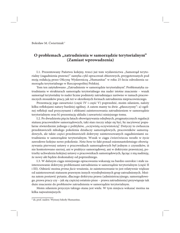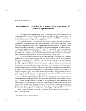 Bolesław M. Ćwiertniak1* O problemach „zatrudnienia w samorządzie terytorialnym” (Zamiast wprowadzenia) I.1. Prezentowany Państwu kolejny, trzeci już tom wydawnictwa „Samorząd terytorialny (zagadnienia prawne)” zamyka cykl opracowań zbiorowych, przygotowanych pod moją redakcją przez Oficynę Wydawniczą „Humanitas” w roku 25-lecia odrodzenia samorządu terytorialnego w Rzeczpospolitej Polskiej. Tom ten zatytułowano „Zatrudnienie w samorządzie terytorialnym”. Problematyka zatrudniania w strukturach samorządu terytorialnego ma nader istotne znaczenie – wszak samorząd terytorialny to nader liczne podmioty zatrudniające zarówno w ramach pracowniczych stosunków pracy, jak też w określonych formach zatrudnienia niepracowniczego. Prezentację jego zawartości (część IV i część V) poprzedzić, moim zdaniem, należy kilku refleksjami natury bardziej ogólnej. A zatem mamy tu dwie „płaszczyzny”: a) ogólnej refleksji nad przyczynami i efektami zainteresowania zatrudnieniem w samorządzie terytorialnym oraz b) prezentację układu i zawartości niniejszego tomu. I.2. Po dwudziestu pięciu latach obowiązywania odrębnych, pragmatycznych regulacji statusu pracowników samorządowych, taki stan rzeczy zdaje się być, by zacytować popularne stwierdzenie jednego z polityków, „oczywistą oczywistością”. Dotyczy to zwłaszcza przedstawicieli młodego pokolenia działaczy samorządowych, pracowników samorządowych, ale także części przedstawicieli doktryny zainteresowanych zagadnieniami zatrudnienia w samorządzie terytorialnym. Wszak w ciągu ćwierćwiecza weszło w życie zawodowe kolejne nowe pokolenie. Nota bene to fakt ponad osiemnastoletniego obowiązywania pierwszej ustawy o pracownikach samorządowych był jednym z czynników, iż nie kontestowano szerzej, ani w praktyce samorządowej, ani w doktrynie prawniczej, potrzeby uchwalenia kolejnej ustawy o pracownikach samorządowych, łącząc z nią nadzieję, że nowy akt będzie doskonalszy od poprzedniego. I.3. W dalszym ciągu niniejszego opracowania wskazuję na bardzo szerokie i stałe zainteresowanie doktryny problemami zatrudnienia w samorządzie terytorialnym (część II i III). Odnieść można prima facie wrażenie, że zainteresowanie to jest relatywnie większe od zainteresowań statusem prawnym innych wyodrębnionych grup zatrudnionych. Można zatem postawić pytanie, dlaczego doktryna prawa (administracyjnego, samorządowego, prawa pracy czy – jak się częściej ostatnio pisze – prawa zatrudnienia) przywiązuje tak duże znaczenie do problemów zatrudnienia w samorządzie terytorialnym. Moim zdaniem przyczyn takiego stanu jest wiele. W tym miejscu wskazać można na kilka najważniejszych: 1* dr, prof. nadzw. Wyższej Szkoły Humanitas. 8 Samorząd terytorialny (zagadnienia prawne) 1) liczebność osób zatrudnionych w samorządzie terytorialnym, 2) złożoność regulacji prawnych kreujących odmienne statusy poszczególnych grup zatrudnionych w samorządzie terytorialnym i związane z tym: ! umiejscowienie regulacji zatrudnienia w samorządzie terytorialnym w naszym systemie prawnym, ! częsta zmiana regulacji prawnych (zarówno nowelizacje pragmatyk, jak też aktów ustrojowych, mające wpływ na status prawny zatrudnionych), ! jakość tych regulacji prawnych (zwykle oceniana jako „fatalna”, „zła” itp. – stąd obie kolejne pragmatyki samorządowe dość często określano jako „niewypały”, „buble prawne” itp.). Stąd też w konsekwencji: 3) problemy z aplikacją ich przepisów, w szczególności zaś problemy walidacyjne i interpretacyjne. II.1. Nawiązując do pierwszej ze wskazanych przyczyn, podkreślić należy znaczną liczebność osób zatrudnionych w strukturach samorządowych. Liczbę samych pracowników samorządowych, podlegających bezpośrednio przepisom ustawy o pracownikach samorządowych z dnia 21 listopada 2008 r.2, szacuje się na prawie 300 tysięcy osób. Już z początkiem tzw. pierwszego etapu reformy samorządowej w stosunki pracy pracowników samorządowych ex lege przekształcono ponad 96 tysięcy stosunków pracy dotychczasowych pracowników terenowych urzędów administracji państwowej3. Owa „armia” pracowników samorządowych rosła wraz z kolejnymi reformami samorządowymi. Wzrost zadań i kompetencji samorządu terytorialnego (część z tych zagadnień poruszono w tomie II „Kompetencje i zadania samorządu terytorialnego”, który oddaliśmy w Państwa ręce w grudniu 2015 r., a także we wcześniejszej dwutomowej monografii zbiorowej wydanej nakładem Oficyny Wydawniczej „Humanitas” w 2013 r.4) spowodował z kolei „rozciągnięcie” statusu pracownika samorządowego na różne grupy pracownicze, których status regulują przepisy odrębne w rozumieniu art. 5 k.p. oraz odpowiednio art. 1a, a obecnie art. 3 obu kolejnych ustaw o pracownikach samorządowych. Dla przykładu można tu wskazać pracowników samorządowych przedszkoli, szkół, instytucji kultury, zakładów opieki zdrowotnej, samorządowych instytucji pomocy społecznej, straży miejskich i gminnych, pracowników gospodarki komunalnej etc.5 Każda z owych grup to kolejna rzesza pracowników samorządowych, niejedTekst pierwotny: Dz.U. 2008 r., nr 223, poz. 1458. Por. art. 33.1. ustawy z dnia 22 marca 1990 r. o pracownikach samorządowych; tekst pierwotny: Dz.U. 1990 r., nr 21, poz. 124; datę przekształcenia wskazała zaś ustawa: Przepisy wprowadzające ustawę o samorządzie terytorialnym i ustawę o pracownikach samorządowych z dnia 10 maja 1990 roku (Dz.U. 1990 r., nr 32, poz. 191). 4 Por. B.M. Ćwiertniak (red.), Prawne aspekty samorządu terytorialnego, t. I, Sosnowiec 2013, cz. III, s. 223360; B.M. Ćwiertniak (red.), Prawne problemy ..., t. II, Sosnowiec 2013, cz. I, s. 13-80. 5 Por. szerzej: A. Kisielewicz, Pracownicy samorządowi po reformie administracji publicznej, „Prawo Pracy” 1999, nr 4, s. 3 i nast.; aktualnie zaś H. 