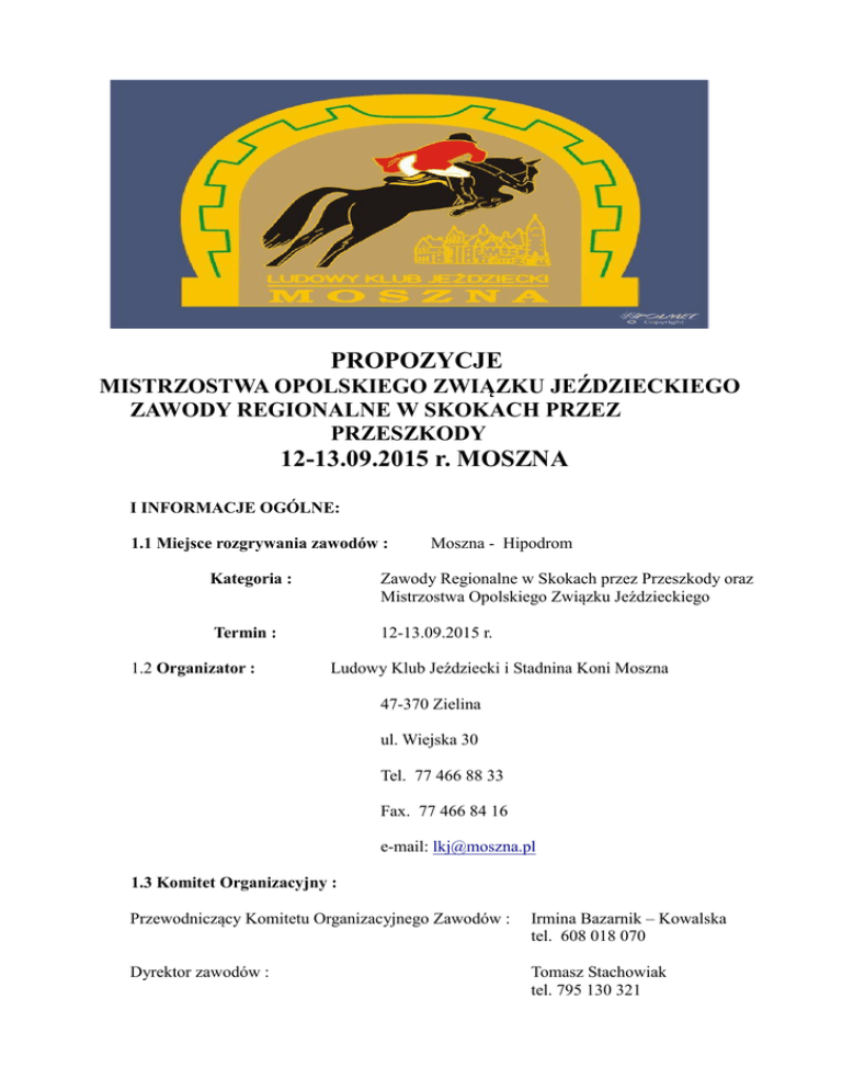 PROPOZYCJE MISTRZOSTWA OPOLSKIEGO ZWIĄZKU JEŹDZIECKIEGO ZAWODY REGIONALNE W SKOKACH PRZEZ PRZESZKODY 12-13.09.2015 r. MOSZNA I INFORMACJE OGÓLNE: 1.1 Miejsce rozgrywania zawodów : Moszna - Hipodrom Kategoria : Zawody Regionalne w Skokach przez Przeszkody oraz Mistrzostwa Opolskiego Związku Jeździeckiego Termin : 12-13.09.2015 r. 1.2 Organizator : Ludowy Klub Jeździecki i Stadnina Koni Moszna 47-370 Zielina ul. Wiejska 30 Tel. 77 466 88 33 Fax. 77 466 84 16 e-mail: [email protected] 1.3 Komitet Organizacyjny : Przewodniczący Komitetu Organizacyjnego Zawodów : Irmina Bazarnik – Kowalska tel. 608 018 070 Dyrektor zawodów : Tomasz Stachowiak tel. 795 130 321 Sekretarz zawodów : Maria Musioł Biuro Stajni : Anna Zielańska Szef Stajni : Tadeusz Kaliciński tel. 668 817 363 1.4 Gospodarz Toru : tel. 662 240 472 Rudolf Mrugała 1.5 Sędziowie : Sędzia główny : Stefan Kabała Sędzia OZJ : Ewa Puzio Sędzia : Łukasz Małek Komisarz : Małgorzta Krawczyk 1.6 Spiker zawodów : 1.7 Lekarz zawodów : Tomasz Stachowiak Sławomir Gołyś II WARUNKI OGÓLNE : Zawody będą rozegrane zgodnie z aktualnymi przepisami PZJ III UDZIAŁ : Kluby i sekcje zarejestrowane w PZJ/OZJ. W Mistrzostwach w kategoriach PROFI oraz OPEN klasyfikowani będą wyłącznie zawodnicy zarejestrowani w OPOLSKIM ZWIĄZKU JEŹDZIECKIM Kategoria NADZIEJI JEŹDZIECKICH jest kategorią OTWARTĄ – mogą w niej startować zawodnicy z dowolnego regionu z licencją B lub bez ale z aktualnymi badaniami lekarskimi i zgodą opiekuna na start w przypadku osób niepełnoletnich. IV WARUNKI TECHNICZE : 4.1 Zawody otwarte : podłoże – piasek kwarcowy , 60x80 m 4.2 Rozprężalnia : podłoże – piasek kwarcowy , 30x60 m V WARUNKI UDZIAŁU : a) zawodnicy – na koszt własny, b) luzacy – na koszt własny, c) konie – koszt transportu pokrywają delegujący, VI ZGŁOSZENIA I OPŁATY : 6.1 ZGŁOSZENIA : Zgłoszenia zawodników i koni nalezy przesłąć w terminie do dnia 04.09.2015 r. na adres organizatora : [email protected] Zgłoszenia prosimy wysyłać na drukach PZJ. 6.2 BOKSY : Boksy zamawiać można do dnia 04.09.2015 r. tylko na adres organizatora : [email protected] , tylko z dołączonym dowodem wpłaty. Ludowy Klub Jedździecki Moszna ul. Wiejska 30, 47-370 Zielina nr. konta : BS Strzeleczki 61 8883 1028 2003 0000 1355 0001 Po tym terminie opłaty za boksy nie podlegają zwrotowi w wypadku rezygnacji ze startów w zawodach. Opłaty za boks : 200 zł Wszystkie boksy dostępne są od piatku 11.09.2015 r. Od godz. 12:00 6.3 Oplaty startowe : Mistrzostwa : 105 zł za dzień startów od konia w tym 5 zł na rzecz OZJ Zawody Regionalne, Mistrzostwa Nadzieji Jeździeckich : Opłata 85 zł od konia w tym 5 zł na rzecz OZJ Opłaty nalezy dokonać w biurze zawodów najpóźniej na 2 godziny przed rozpoczęciem konkursów. Bez dokonanej wpłaty zawodnicy oraz konie będą skreśleni z list startowych. Za każdą zmianę na listach startowych dokonaną później niż ww. terminie pobierana będzie opłata w wysokości 20.00 zł. Informacje o rezygnacji ze startów należy podać organizatorowi najpóźniej do godz. 18.00 dnia poprzedzającego starty. VII DOKUMENTACJA I PRZEPISY WETERYNARYJNE : 7.1 Wymagana dokumentacja koni : Konie musza posiadać aktualne badania i szczepienia, aktualną licencję. Bez w/w dokumentów konie nie będą dopuszczone do startu. 7.2 Dokumentacja dla Klubów / Sekcji i zawodników : Zgodna z wymaganiami PZJ VIII RÓŻNE : 8.1 Organizator nie ponosi odpowiedzialności za zaistniałe szkody , wypadki i kradzieże. 8.2 Noclegi : 1. Pokoje gościnne na terenie SK Moszna tel. 77/466 88 33 2. Hotel Zielona Zatoka w Dębinie tel. 77/437 63 22 3. Hotel ZAJAZD Krapkowice tel. 77/466 13 64 4. Hotel SALVE Głogówek tel. 77/437 33 13 5. Ośrodek Wypoczynkowy w Dobrej – tel. 77/ 466 83 25 IX PROGRAM ZAWODÓW : rozpoczęcie konkursów : godz. 10.00 Mistrzostwa odbywają się w 3 kategoriach : Nadziei Jeździeckich (M NJ) : konkursy 50cm, 50cm, 60cm – kategoria otwarta, towarzyska, zawodnicy bez licencji lub z licencją B. Mogą startować z poza województwa opolskiego ! Open (MOP) : 100cm, 100cm, 105 cm – zawodnicy z licencją W oraz B3 Profi (MPR) : 120cm, 125cm, 125cm – zawodnicy z licencją B3 i wyższą. Zawodnik ma prawo startu w tylko jednej kategorii. Zawodnik może startować na 2 koniach. Do finału należy wybrać jednego konia, który ukończył minimum jeden z półfinałów. Mistrzostwa rozgrywane są na zasadach Mistrzostw Polski. Sobota (12.09.2015) Konkurs nr 1 – mini LL (do 50 cm) seria A, I pólfinał MNJ, towarzyski, dokładności bez rozgrywki art.238.1.1 Konkurs nr 2 – mini LL (do 50 cm) II półfinał MNJ , towarzyski dokładności bez rozgrywki art. 238.1.1 Konkurs nr 3 - LL (90) seria A, towarzyski, dokładności bez rozgrywki art.238.1.1 Konkurs nr 4 – L (100) seria A, I pólfinał MOP, dokładności bez rozgrywki art.238.1.1 Seria B, otwarta, dokładności bez rozgrywki art. 238.1.1 Konkurs nr 4 – L (100) II pólfinał MOP, dokładności bez rozgrywki art. 238.1.1 Konkurs nr 5- P (110) o wzrastającym stopniu trudności z jokerem art.269.5 Konkurs nr 6- N (120) seria A, I półfinał MPR, szybkości, art.263. Seria B, otwarta, szybkości, art.263. Konkurs nr 7- N (120) seria A, II półfinał MPR, zwykły, art.238.2.1 seria B, otwarta, zwykły, art.238.2.1 Niedziela (13.09.2015) Konkurs nr 8 – LL (do 90)towarzyski, dokładności bez rozgrywki art.238.1.1 Konkurs nr 9– L (100) dokładności bez rozgrywki art.238.1.1 Konkurs nr 10- P (110) dwufazowy art.274.5.6 Konkurs nr 11- N (120) dwufazowy art.274.5.3 Finały Mistrzostw OZJ nie są konkursami otwartymi. Konkurs nr 12- mini LL/mini LL (60/60) Finał MNJ, dwunawrotowy art. 273.3.3.2 Konkurs nr 13- L/L1 (100/105) Finał MOP, dwunawrotowy art. 273.3.3.2 Konkurs nr 14- N/N1 (120/125) Finał MPR, dwunawrotowy art. 273.3.3.2 W konkursach bez rozgrywki klasy LL i L (do 105 cm) duży koń w wieku od 6 lat może startow