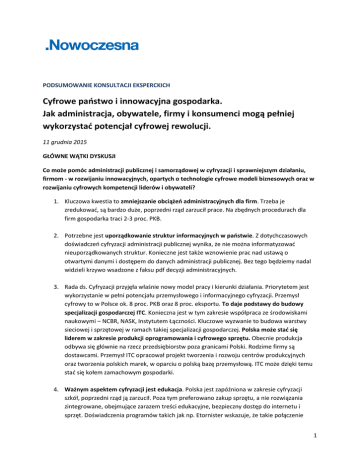 PODSUMOWANIE KONSULTACJI EKSPERCKICH Cyfrowe państwo i innowacyjna gospodarka. Jak administracja, obywatele, firmy i konsumenci mogą pełniej wykorzystać potencjał cyfrowej rewolucji. 11 grudnia 2015 GŁÓWNE WĄTKI DYSKUSJI Co może pomóc administracji publicznej i samorządowej w cyfryzacji i sprawniejszym działaniu, firmom - w rozwijaniu innowacyjnych, opartych o technologie cyfrowe modeli biznesowych oraz w rozwijaniu cyfrowych kompetencji liderów i obywateli? 1. Kluczowa kwestia to zmniejszanie obciążeń administracyjnych dla firm. Trzeba je zredukować, są bardzo duże, poprzedni rząd zarzucił prace. Na zbędnych procedurach dla firm gospodarka traci 2-3 proc. PKB. 2. Potrzebne jest uporządkowanie struktur informacyjnych w państwie. Z dotychczasowych doświadczeń cyfryzacji administracji publicznej wynika, że nie można informatyzować nieuporządkowanych struktur. Konieczne jest także wznowienie prac nad ustawą o otwartymi danymi i dostępem do danych administracji publicznej. Bez tego będziemy nadal widzieli krzywo wsadzone z faksu pdf decyzji administracyjnych. 3. Rada ds. Cyfryzacji przyjęła właśnie nowy model pracy i kierunki działania. Priorytetem jest wykorzystanie w pełni potencjału przemysłowego i informacyjnego cyfryzacji. Przemysł cyfrowy to w Polsce ok. 8 proc. PKB oraz 8 proc. eksportu. To daje podstawy do budowy specjalizacji gospodarczej ITC. Konieczna jest w tym zakresie współpraca ze środowiskami naukowymi – NCBR, NASK, Instytutem Łączności. Kluczowe wyzwanie to budowa warstwy sieciowej i sprzętowej w ramach takiej specjalizacji gospodarczej. Polska może stać się liderem w zakresie produkcji oprogramowania i cyfrowego sprzętu. Obecnie produkcja odbywa się głównie na rzecz przedsiębiorstw poza granicami Polski. Rodzime firmy są dostawcami. Przemysł ITC opracował projekt tworzenia i rozwoju centrów produkcyjnych oraz tworzenia polskich marek, w oparciu o polską bazę przemysłową. ITC może dzięki temu stać się kołem zamachowym gospodarki. 4. Ważnym aspektem cyfryzacji jest edukacja. Polska jest zapóźniona w zakresie cyfryzacji szkół, poprzedni rząd ją zarzucił. Poza tym preferowano zakup sprzętu, a nie rozwiązania zintegrowane, obejmujące zarazem treści edukacyjne, bezpieczny dostęp do internetu i sprzęt. Doświadczenia programów takich jak np. Etornister wskazuje, że takie połączenie 1 wpływa świetnie na rozwój kompetencji cyfrowych dzieci i nauczycieli. To kluczowa kwestia, bo dotyczy kilku milionów uczniów, 2 mln w podstawówkach, 700 tys. w technikach, 1 mln w gimnazjach. Trzeba mocno wyedukować dzieci i młodzież cyfrowo, to kwestia przygotowania do rynku pracy i metoda zwiększenia konkurencyjności polskiej gospodarki w świecie. 5. Komisja Cyfryzacji powinna sprzyjać cyfryzacji szkoły i edukacji. Stan podłączenia szkół do sieci światłowodowej jest niski, trzeba go poprawić – także we współpracy sektora publiczno – prywatnego. Obecnie szkoła jest postrzegana przez firmy jako klient biznesowy, a na to jej nie stać. W skali kraju zaledwie 0,6 proc. szkół ma szerokopasmowy internet, o zwiększenie dostępu do łączy trzeba zadbać w pierwszej kolejności. 6. Problemem jest niskie zastosowanie w firmach badań naukowych. Badania naukowe uczelni są źródłem wiedzy i nowych rozwiązań. Nie są jednak wdrażane do przemysłu, bo badania finansowane z budżetu oddaje się na cały świat publikując ich wyniki, i nie tworzą one polskich patentów. Wynika to m.in. z faktu, że nie można otrzymać tytułu doktora, zrobić habilitacji czy uzyskać profesury za wdrożenia. Potrzebna jest ustawa, która pozwala określić dorobek naukowy i przyznać stopień na podstawie wdrożeń i patentów. Takie rozwiązanie mają m.in. Niemcy. 7. Ważnym aspektem jest ochrona własności intelektualnej twórców. Twórcom, nie tylko rodzimym, potrzebna jest ochrona intelektualna. Trzeba zastanowić się nad jej formami. Rozwój piractwa jest negatywną stroną zjawiska cyfryzacji. Według PwC tylko na rynku wideo straty Skarbu Państwa wynoszą 170 – 200 mln zł, to 6 tys. miejsc pracy w sektorze kreatywnym. Niedostateczna ochrona własności intelektualnej może prowadzić do marginalizacji rodzimej produkcji kontentu cyfrowego. Pojawia się także kwestia digitalizacja treści w zakresie kultury, i digitalizacja zasobów polskiej kultury. To rodzi np. pytanie co dalej z archiwami TVP i narzędziami udostępniania ich. 8. Edukacja jest obecnie, obok usług, wysoko w priorytetach nowego MC. Warto zastanowić się, jakie działania w zakresie uczenia programowania i umiejętności współdziałania mogą mieć najlepszy skutek. Obecnie mamy np. propozycję podstawy programowej w zakresie nauki programowania oraz szereg działań pomagających w jego nauce. Tu potrzebna jest elastyczność w podejściu do programu, a nie zawężanie się do jednego rozwiązania – co pokazał m.in. program „Mistrzowie kodowania”. W zakresie infrastruktury ważne są nie tylko urządzenia, ale i internet szerokopasmowy. W szkołach stan dostępu jest bardzo różny, od dobrego do bardzo słabego. Trzecia kwestia to szkolenia nauczycieli na dobrym poziomie. Nie powinniśmy robić niczego, do czego system nie jest przygotowany. Szkolenia powinni zacząć prowadzić praktycy, a nie tylko „biorcy grantów”. Trzeba rozwijać także naukę robotyki, to przyszłościowa dziedzina. Trudno znaleźć ekspertów w tym zakresie, a bez tego efektywność firm nie będzie rosła. 9. Rada Informatyzacji i Edukacji przy MEN wypracowała dokument, który proponuje kształcenie informatyczne, co obejmuje programowanie, ale także sposób rozwiązywania problemów za pomocą komputera. Intencją tej propozycji jest szybkie uzyskanie akceptacji MEN i szybkie wdrożenie go w szkołach. Nauka programowania to pilne zadanie, trzeba 2 przygotować uczniów do przyszłego kształcenia i nowych miejsc pracy. Duż