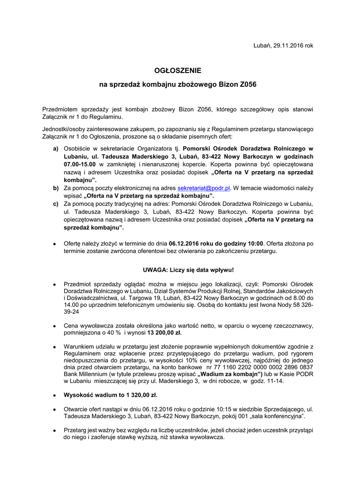 Lubań, 29.11.2016 rok OGŁOSZENIE na sprzedaż kombajnu zbożowego Bizon Z056 Przedmiotem sprzedaży jest kombajn zbożowy Bizon Z056, którego szczegółowy opis stanowi Załącznik nr 1 do Regulaminu. Jednostki/osoby zainteresowane zakupem, po zapoznaniu się z Regulaminem przetargu stanowiącego Załącznik nr 1 do Ogłoszenia, proszone są o składanie pisemnych ofert: a) Osobiście w sekretariacie Organizatora tj. Pomorski Ośrodek Doradztwa Rolniczego w Lubaniu, ul. Tadeusza Maderskiego 3, Lubań, 83-422 Nowy Barkoczyn w godzinach 07.00-15.00 w zamkniętej i nienaruszonej kopercie. Koperta powinna być opieczętowana nazwą i adresem Uczestnika oraz posiadać dopisek „Oferta na V przetarg na sprzedaż kombajnu”. b) Za pomocą poczty elektronicznej na adres [email protected]. W temacie wiadomości należy wpisać „Oferta na V przetarg na sprzedaż kombajnu”. c) Za pomocą poczty tradycyjnej na adres: Pomorski Ośrodek Doradztwa Rolniczego w Lubaniu, ul. Tadeusza Maderskiego 3, Lubań, 83-422 Nowy Barkoczyn. Koperta powinna być opieczętowana nazwą i adresem Uczestnika oraz posiadać dopisek „Oferta na V przetarg na sprzedaż kombajnu”. Ofertę należy złożyć w terminie do dnia 06.12.2016 roku do godziny 10:00. Oferta złożona po terminie zostanie zwrócona oferentowi bez otwierania po zakończeniu przetargu. UWAGA: Liczy się data wpływu! Przedmiot sprzedaży oglądać można w miejscu jego lokalizacji, czyli: Pomorski Ośrodek Doradztwa Rolniczego w Lubaniu, Dział Systemów Produkcji Rolnej, Standardów Jakościowych i Doświadczalnictwa, ul. Targowa 19, Lubań, 83-422 Nowy Barkoczyn w godzinach od 8.00 do 14.00 po uprzednim telefonicznym umówieniu się. Osobą do kontaktu jest Iwona Nody 58 32639-24 Cena wywoławcza została określona jako wartość netto, w oparciu o wycenę rzeczoznawcy, pomniejszona o 40 % i wynosi 13 200,00 zł. Warunkiem udziału w przetargu jest złożenie poprawnie wypełnionych dokumentów zgodnie z Regulaminem oraz wpłacenie przez przystępującego do przetargu wadium, pod rygorem niedopuszczenia do przetargu, w wysokości 10% ceny wywoławczej, najpóźniej do jednego dnia przed otwarciem przetargu, na konto bankowe nr 77 1160 2202 0000 0002 2896 0837 Bank Millennium (w tytule przelewu proszę wpisać „Wadium za kombajn”) lub w Kasie PODR w Lubaniu mieszczącej się przy ul. Maderskiego 3, w dni robocze, w godz. 11-14. Wysokość wadium to 1 320,00 zł. Otwarcie ofert nastąpi w dniu 06.12.2016 roku o godzinie 10:15 w siedzibie Sprzedającego, ul. Tadeusza Maderskiego 3, Lubań, 83-422 Nowy Barkoczyn, pokój 001 „sala konferencyjna”. Przetarg jest ważny bez względu na liczbę uczestników, jeżeli chociaż jeden uczestnik przystąpi do niego i zaoferuje stawkę wyższą, niż stawka wywoławcza. Informacja o wyborze oferty zostanie ogłoszona na stronie internetowej PODR pod adresem www.podr.pl. Organizator ma prawo zamknięcia/unieważnienia przetargu na każdym etapie bez podawania przyczyny. Z tytułu zamknięcia, unieważnienia przetargu lub odrzucenia oferty Jednostce/osobie zainteresowanej zakupem nie przysługuje żadne roszczenie wobec Organizatora. TERMIN SKŁADANIA OFERT Ofertę należy złożyć w siedzibie Organizatora: Pomorski Ośrodek Doradztwa Rolniczego w Lubaniu ul. Maderskiego 3, Lubań, 83-422 Nowy Barkoczyn tel.58 326-39-00, fax. 58 309-09-45, email: [email protected] , www.podr.pl Do dnia 06.12.2016 roku do godziny 10:00. Liczy się data wpływu. Załączniki: 1) Załącznik nr 1 – Regulamin 2) Załącznik nr 1 do Regulaminu – Wycena wartości rynkowej kombajnu