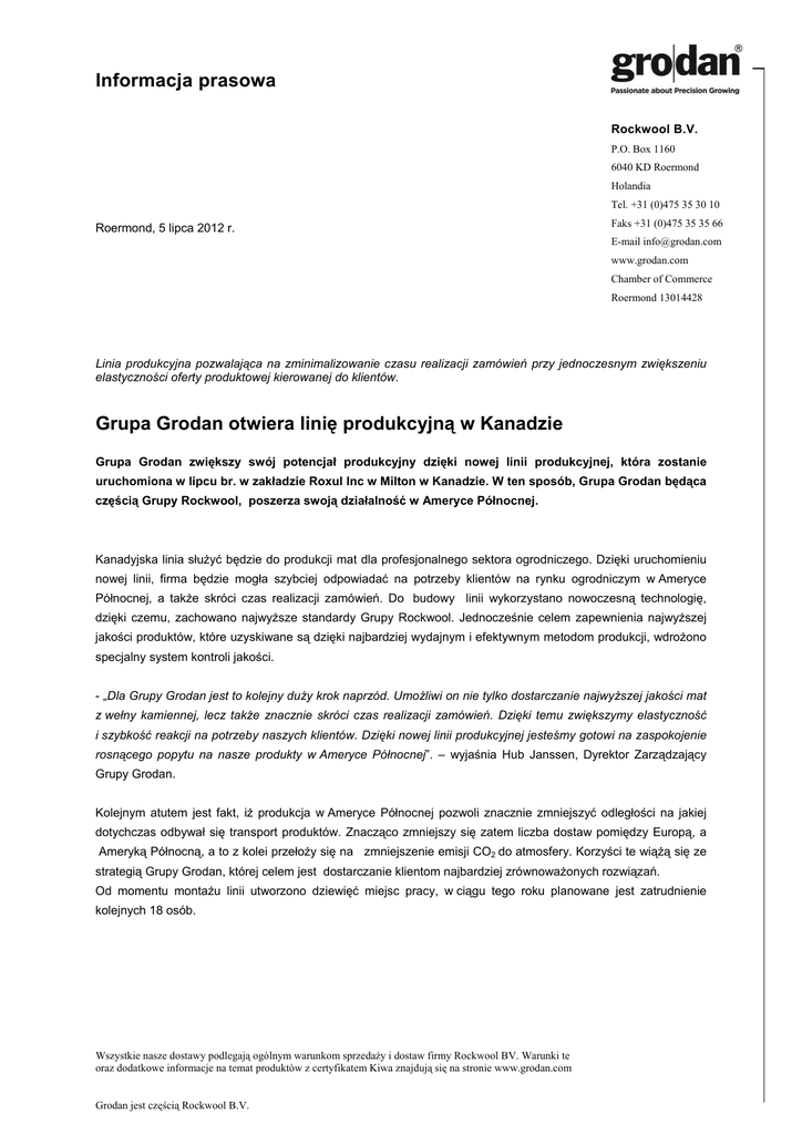 Informacja prasowa Rockwool B.V. P.O. Box 1160 6040 KD Roermond Holandia Tel. +31 (0)475 35 30 10 Roermond, 5 lipca 2012 r. Faks +31 (0)475 35 35 66 E-mail [email protected] www.grodan.com Chamber of Commerce Roermond 13014428 Linia produkcyjna pozwalająca na zminimalizowanie czasu realizacji zamówień przy jednoczesnym zwiększeniu elastyczności oferty produktowej kierowanej do klientów. Grupa Grodan otwiera linię produkcyjną w Kanadzie Grupa Grodan zwiększy swój potencjał produkcyjny dzięki nowej linii produkcyjnej, która zostanie uruchomiona w lipcu br. w zakładzie Roxul Inc w Milton w Kanadzie. W ten sposób, Grupa Grodan będąca częścią Grupy Rockwool, poszerza swoją działalność w Ameryce Północnej. Kanadyjska linia służyć będzie do produkcji mat dla profesjonalnego sektora ogrodniczego. Dzięki uruchomieniu nowej linii, firma będzie mogła szybciej odpowiadać na potrzeby klientów na rynku ogrodniczym w Ameryce Północnej, a także skróci czas realizacji zamówień. Do budowy linii wykorzystano nowoczesną technologię, dzięki czemu, zachowano najwyższe standardy Grupy Rockwool. Jednocześnie celem zapewnienia najwyższej jakości produktów, które uzyskiwane są dzięki najbardziej wydajnym i efektywnym metodom produkcji, wdrożono specjalny system kontroli jakości. - „Dla Grupy Grodan jest to kolejny duży krok naprzód. Umożliwi on nie tylko dostarczanie najwyższej jakości mat z wełny kamiennej, lecz także znacznie skróci czas realizacji zamówień. Dzięki temu zwiększymy elastyczność i szybkość reakcji na potrzeby naszych klientów. Dzięki nowej linii produkcyjnej jesteśmy gotowi na zaspokojenie rosnącego popytu na nasze produkty w Ameryce Północnej”. – wyjaśnia Hub Janssen, Dyrektor Zarządzający Grupy Grodan. Kolejnym atutem jest fakt, iż produkcja w Ameryce Północnej pozwoli znacznie zmniejszyć odległości na jakiej dotychczas odbywał się transport produktów. Znacząco zmniejszy się zatem liczba dostaw pomiędzy Europą, a Ameryką Północną, a to z kolei przełoży się na zmniejszenie emisji CO2 do atmosfery. Korzyści te wiążą się ze strategią Grupy Grodan, której celem jest dostarczanie klientom najbardziej zrównoważonych rozwiązań. Od momentu montażu linii utworzono dziewięć miejsc pracy, w ciągu tego roku planowane jest zatrudnienie kolejnych 18 osób. Wszystkie nasze dostawy podlegają ogólnym warunkom sprzedaży i dostaw firmy Rockwool BV. Warunki te oraz dodatkowe informacje na temat produktów z certyfikatem Kiwa znajdują się na stronie www.grodan.com Grodan jest częścią Rockwool B.V. Informacja korporacyjna: Grupa Grodan dostarcza innowacyjnych rozwiązań w dziedzinie upraw dla profesjonalnego i zrównoważonego ogrodnictwa, składających się z kombinacji czystych i kontrolowanych podłoży z wełny skalnej, profesjonalnego doradztwa i wsparcia. Rozwiązania te są wykorzystywane głównie na potrzeby upraw warzyw jak: pomidory, ogórki, papryka i bakłażany, oraz kwiatów - róż i gerber. Grupa Grodan została założona w 1969 roku, obecnie działa w ponad sześćdziesięciu krajach na całym świecie. Siedziba główna znajduje się w Roermond w Holandii. Więcej informacji i materiały ilustrowane: Joanna Więckowska, Marketing Manager CEE & Export Markets Tel: 22 375 07 89, e-mail: [email protected], www.grodan.pl Wszystkie nasze dostawy podlegają ogólnym warunkom sprzedaży i dostaw firmy Rockwool BV. Warunki te oraz dodatkowe informacje na temat produktów z certyfikatem Kiwa znajdują się na stronie www.grodan.com Grodan jest częścią Rockwool B.V.