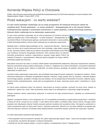 Komenda Miejska Policji w Chorzowie Źródło: http://chorzow.slaska.policja.gov.pl/ka5/informacje/wiadomosci/117233,Przed-wakacjami-co-warto-wiedziec.html Wygenerowano: Piątek, 3 marca 2017, 17:25 Przed wakacjami - co warto wiedzieć? O czym warto pamiętać wybierając się na urlop przypomina 35 instytucji biorących udział we wspólnej akcji "Przed wakacjami – co warto wiedzieć?". Zaangażowała się w nią również Policja. Funkcjonariusze apelują o zachowanie ostrożności w czasie podróży, a także kontrolują autokary, którymi dzieci wybierają się na wakacyjny wypoczynek. O czym warto pamiętać wybierając się na urlop przypomina 35 instytucji biorących udział we wspólnej akcji "Przed wakacjami – co warto wiedzieć?". Zaangażowała się w nią również Policja. Funkcjonariusze apelują o zachowanie ostrożności w czasie podróży, a także kontrolują autokary, którymi dzieci wybierają się na wakacyjny wypoczynek. Niedługo dzieci i młodzież będą wyjeżdżały na tzw. wypoczynek zbiorowy – kolonie lub obozy. Już teraz, jak to zwykle bywa pod koniec roku szkolnego, mają miejsce wyjazdy na tzw. wycieczki szkolne. Stało się już dobrym zwyczajem kontrolowanie przez Policję oraz Inspekcję Transportu Drogowego autokarów, które zawiozą dzieci na wakacje. Potrzebę sprawdzenia autokaru organizatorzy wyjazdu mogą zgłosić Policji lub Inspekcji Transportu z wyprzedzeniem. Wówczas patrol przyjedzie na miejsce zbiórki i skontroluje pojazd oraz kierowcę. Jeśli jednak nauczyciel lub rodzic na miejscu zbiórki będzie miał jakiekolwiek podejrzenia, dotyczące niesprawności autokaru, bądź też zachowanie kierowcy będzie wskazywało, że może on znajdować się w stanie nietrzeźwym, nie powinien absolutnie zgadzać się na wyjazd dzieci. Należy tu podkreślić, że każdy kierowca wsiadając do pojazdu, którym będzie kierował, odpowiada za ludzkie życie. Uczulamy osoby organizujące wypoczynek, aby przykładali dużą wagę do kwestii związanej z wynajęciem autokaru. Pewne informacje świadczące o należytym przygotowaniu pojazdu i kierowcy, mogą uzyskać sami np. poprosić o okazanie badania technicznego pojazdu, sprawdzić z którego roku jest autobus i ile ma przejechanych kilometrów na liczniku, obejrzeć opony. Pojazdy bardzo wyeksploatowane, nawet jeśli są przygotowane do drogi, stwarzają ryzyko awarii i komplikacji w czasie podróży. W trakcie jazdy autokarem dzieci nie powinny: spacerować po wnętrzu pojazdu, wychylać się przez okna, stawać na siedzeniach, opierać się o drzwi. Takie zachowania, oprócz tego że są niebezpieczne, rozpraszają uwagę kierującego. Postoje autobusu należy organizować wyłącznie w miejscach do tego przeznaczonych, najlepiej na oznakowanych parkingach. Zgodnie z przepisami Prawa o ruchu drogowym (art. 57) na pojeździe przewożącym zorganizowaną grupę dzieci i młodzieży w wieku do 18 lat, umieszcza się z przodu i z tyłu tablice barwy żółtej z symbolem dzieci barwy czarnej. Kierujący takim pojazdem jest obowiązany włączać światła awaryjne podczas wsiadania lub wysiadania dzieci. Kierującemu autobusem w czasie przewożenia osób nie wolno palić tytoniu i spożywać pokarmów. Zabrania mu się także oddalania od pojazdu gdy silnik jest włączony. Kierowca, od którego zależy bezpieczeństwo uczestników wyjazdu, powinien być wypoczęty i wyspany. Co zrobić żeby podróż autokarem była bezpiczna? ● Przed wyjazdem dziecka autokarem sprawdź, kto i gdzie organizuje jego wyjazd i pobyt - niższa cena wynajęcia autokaru na wycieczkę, nie powinna decydować o wyborze przewoźnika. ● Dowiedz się, jaki jest program pobytu i czy jest on zgodny z oczekiwaniami Twoimi i Twojego dziecka. ● Jeżeli masz uzasadnienie podejrzenia, co do stanu kierowcy (bełkotliwa mowa, wyczuwalna woń alkoholu) lub stanu technicznego pojazdu (popękane szyby, łyse opony) natychmiast wzywaj policję. ● Jeżeli kierowca, przewoźnik nie chce zgodzić się na kontrolę Policji (np. straszy, że nie będzie tak długo czekał na Policję, że zrezygnuje z wycieczki) to znak, że coś jest nie w porządku. ● Jeśli autobus rusza w dłuższą trasę pomyśl, aby w umowie wynajmu autokaru zawrzeć klauzulę, by w autobusie było dwóch kierowców, a autobus był poddany dodatkowym badaniom technicznym. Koszt badania technicznego wynosi 199 zł. ● Nad właściwym przebiegiem podróży powinni czuwać opiekunowie wycieczki. Miejsce przy drzwiach autobusu muszą zająć osoby dorosłe. Kierownik wycieczki zajmuje miejsce obok kierowcy. ● Przejścia w autokarze muszą być wolne, co umożliwia szybkie opuszczenie pojazdu w razie ewakuacji (wszystkie bagaże powinny być ulokowane na półkach lub bagażniku autokaru). ● W przejściach autobusu nie mogą znajdować się dodatkowe miejsca siedzące, a w czasie jazdy dzieci nie powinny spacerować po autobusie ani stać w przejściu. ● Jeżeli autobus jest wyposażony w pasy bezpieczeństwa, przewożone w nim osoby muszą mieć je zapięte. ● Należy pamiętać o przestrzeganiu norm czasu pracy kierowcy. W trakcie jazdy trzeba organizować przerwy na odpoczynek. Postoje te mogą odbywać się wyłącznie w miejscach do tego przeznaczonych, tj. na oznakowanych parkingach. ● Czas prowadzenia pojazdu i odpoczynku – wybrane zagadnienia: ❍ 1. Dzienny czas prowadzenia pojazdu nie może przekraczać:- norma – 9 godzin- przedłużony – 10 godzin 2 razy w tygodniu ❍ 2. Dopuszczalny czas prowadzenia pojazdu nie może przekraczać:- w tygodniu – 56 godzin- w ciągu dwóch kolejnych tygodni – 90 godzin ● ❍ 3. Maksymalny czas prowadzenia pojazdu bez przerwy – 4 godziny 30minut ❍ 4. Przerwa w prowadzeniu pojazdu – co najmniej 45 minut lub, co najmniej 15 minut i następna, co najmniej 30 minut. ❍ 5. Dzienny okres odpoczynku – norma, co najmniej 11 nieprzerywanych godzin w każdym 24 godzinnym okresie. Należy pamię