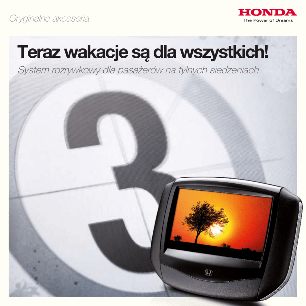 Oryginalne akcesoria Teraz wakacje są dla wszystkich! System rozrywkowy dla pasażerów na tylnych siedzeniach Perfekcyjnie zintegrowany System rozrywkowy dla pasażerów na tylnych siedzeniach został specjalnie zaprojektowany dla Twojej Hondy, tak by idealnie pasował do kształtów samochodu. Żadnych dziwacznych kątów, żadnych wystających kabli, po prostu elegancki system, który jeszcze bardziej poprawia wygląd Twojego samochodu, nawet wtedy, gdy ekrany są wyłączone. WYGODNY BEZPIECZNY ‣Monitor wpasowuje się łatwo w dyskretną stację dokującą z tyłu zagłówka ‣Zaprojektowany, wyprodukowany oraz przetestowany według najbardziej surowych standardów inżynieryjnych Hondy ‣Pozwala na normalne funkcjonowanie aktywnych zagłówków ‣Pilot zdalnego sterowania oraz bezprzewodowe słuchawki pozwalają pasażerom obsługiwać system bez przemieszczania się ‣Może być bez trudu wyjęty dla użytku poza samochodem ‣Zaokrąglone kształty dla bezpieczeństwa dzieci ‣Pozwala kierowcy na skupienie się na prowadzeniu samochodu i nie rozpraszanie się tym, co dzieje się z tyłu ‣Poddany testom wytrzymałościowym ‣Przetestowany w ramach kompleksowego programu testowego samochodu ‣Objęty trzyletnią gwarancją ZAAWANSOWANY ‣Kompatybilny z USB ‣Odtwarza płyty DVD, CD oraz pliki video „POWIEL” SWOJĄ ROZRYWKĘ! Mając zainstalowane dwa monitory, każdy jest szczęśliwy. Żadnych argumentów – po prostu szczęśliwi podróżnicy! ▶Ekran 7 calowy ▶A/V wejście/wyjście ▶A/V automatyczne wybieranie ▶Gniazdo DC ▶DivX, MPEG, WMA, MP3, AVI ▶Złącze USB ▶Bezprzewodowe słuchawki dostępne w dwóch rozmiarach - dziecięcym oraz dla dorosłych ▶Dwukanałowy nadajnik IR ▶Sygnał RGB do TFT ▶Ekran startowy Honda W celu uzyskania informacji na temat aplikacji do konkretnego modelu oraz innych szczegółów, skontaktuj się ze swoim dealerem Hondy. Dzieci również potrzebują wakacji Kiedy jesteś mały, długie podróże mogą wydawać się bardzo, bardzo długie. Niewiele do oglądania, niewiele do robienia… Pamiętasz kłótnie z tylnej kanapy o to, która zabawka jest czyja? Pamiętasz bałagan, który robiłeś przy pomocy kredek, gier, jedzenia i picia? Pamiętasz, jak nie mogłeś usiedzieć cicho na swoim miejscu pytając co chwila, jak daleko jeszcze…? Na szczęście czasy się zmieniły. System rozrywkowy Hondy oferuje pasażerom tylnych miejsc, zarówno młodym jak i tym starszym, możliwość zabrania ze sobą w te długie podróże ich ulubionych rozrywek. Starannie zaprojektowany system rozrywkowy w łagodnym „opakowaniu” dodaje jeszcze więcej uroku do pięknego wykończenia wnętrza Twojego samochodu. Bezpieczni, wygodnie usadowieni pasażerowie, zarówno dzieci jak i dorośli, mogą teraz oglądać swoje ulubione filmy, czy słuchać swojej własnej muzyki. W tym czasie możesz zrelaksować się i skoncentrować na czerpaniu przyjemności z jazdy. I to są dopiero prawdziwe wakacje! System można bez trudu wyjąć, by korzystać z niego poza samochodem Ta oferta nie odnosi się do żadnego konkretnego produktu oferowanego do sprzedaży. Producent i importer rezerwują sobie prawo do zmiany specyfikacji oferowanych akcesoriów bez uprzedniego powiadomienia. Dokładamy jednak wszelkich starań, aby zapewnić maksymalną dokładność wszelkich informacji w niniejszej broszurze. Ta broszura nie jest ofertą w jakimkolwiek znaczeniu niezależnie od informacji udzielanej przez firmy lub osoby ją przekazujące. Wszelka sprzedaż jest prowadzona przez dealerów zgodnie z ogólnymi warunkami gwarancji, kopia, których powinna być dostarczona przez sprzedającego na każde życzenie kupującego. Mimo włożonego wysiłku i z cyklu produkcyjnego broszury wynika konieczność wykonania jej na kilka miesięcy przed jej rozprowadzeniem, więc nie ma możliwości, aby odzwierciedlała wszelkie zmiany wprowadzone w tym czasie. Kupujący jest zawsze proszony o każdorazowe konsultowanie się ze sprzedawcą. Honda Poland Sp. z o.o., ul. Puławska 381, 02-801 Warszawa www.honda.pl www.honda-access.com 5000.09.2008.PL
