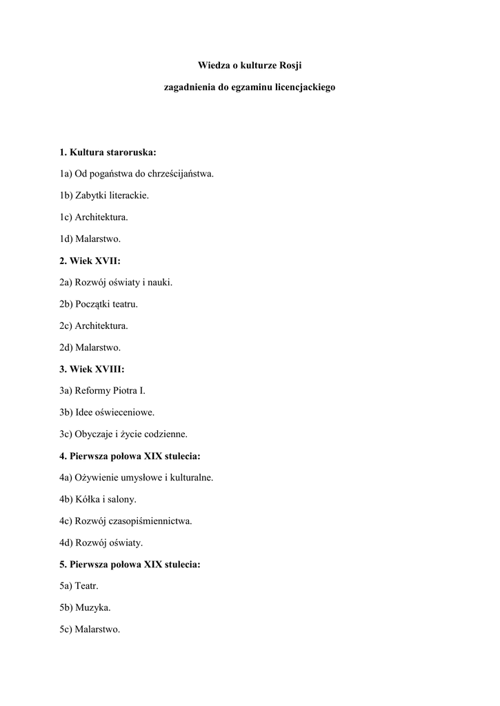 Wiedza o kulturze Rosji zagadnienia do egzaminu licencjackiego 1. Kultura staroruska: 1a) Od pogaństwa do chrześcijaństwa. 1b) Zabytki literackie. 1c) Architektura. 1d) Malarstwo. 2. Wiek XVII: 2a) Rozwój oświaty i nauki. 2b) Początki teatru. 2c) Architektura. 2d) Malarstwo. 3. Wiek XVIII: 3a) Reformy Piotra I. 3b) Idee oświeceniowe. 3c) Obyczaje i życie codzienne. 4. Pierwsza połowa XIX stulecia: 4a) Ożywienie umysłowe i kulturalne. 4b) Kółka i salony. 4c) Rozwój czasopiśmiennictwa. 4d) Rozwój oświaty. 5. Pierwsza połowa XIX stulecia: 5a) Teatr. 5b) Muzyka. 5c) Malarstwo. 5d) Ruch umysłowy i społeczny (słowianofile, okcydentaliści). 6. Przełom XIX i XX w.: 6a) Reformy Aleksandra II. 6b) Rozwój szkolnictwa. 6c) Teatr. 6d) Początki kina. 7. Przełom XIX i XX w.: 7a) Malarstwo. 7b) Architektura. 7c) Balet. 7d) Znaczenie przełomu modernistycznego. 8. Specyfika kultury rosyjskiej po 1917 6a) Emigracja (I, II i III fala). 6b) Awangarda lat 20-tych. 6c) Socrealizm. 9. Specyfika kultury rosyjskiej w II połowie XX w. 9a) Okres "odwilży". 9b) Narodziny kultury niezależnej. 9c) Lata stagnacji i zastoju. 9d) Czas "pieriestrojki". 10. Życie kulturalne w Rosji po roku 1991.