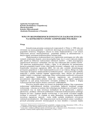 Agnieszka Szczepkowska Katedra Koniunktury Gospodarczej Marcin Kowalski Katedra Mikroekonomii Akademia Ekonomiczna w Poznaniu WPŁYW BEZPOŚREDNICH INWESTYCJI ZAGRANICZNYCH NA KONKURENCYJNOŚĆ GOSPODARKI POLSKIEJ Wstęp Konsekwencją przemian systemowych rozpoczętych w Polsce w 1990 roku jest otwieranie się naszej gospodarki i możliwość aktywnego jej uczestniczenia w systemie gospodarki światowej. Osiągnięcie sukcesu na arenie międzynarodowej a tym samym efektywność procesu internacjonalizacji gospodarki polskiej są zdeterminowane w dużym stopniu poziomem konkurencyjności naszego kraju. Międzynarodowa konkurencyjność jest współcześnie postrzegana nie tylko jako warunek zwiększania eksportu przez poszczególne kraje, lecz w coraz większym stopniu jako sposób na efektywne wykorzystanie rodzimych zasobów , a także przyciągnięcie zagranicznych inwestycji i technologii. Jest ona więc traktowana jako czynnik wzrostu1. Tak ujmowana konkurencyjność wynika z faktu, iż od kilkunastu lat mechanizmem łączącym gospodarki krajów świata, obok handlu towarami i usługami, stały się również bezpośrednie inwestycje zagraniczne (BIZ). Ich rola jako czynnika dynamizującego powiązania gospodarcze w skali międzynarodowej jest co raz większa, dlatego też, kraje zmierzające do poprawy międzynarodowej konkurencyjności muszą prowadzić politykę atrakcyjną z punktu widzenia kapitału zagranicznego, który obecnie jest głównym źródłem wiedzy o technologii i marketingu. Pełne wykorzystanie możliwości tworzonych przez napływające bezpośrednie inwestycje zagraniczne jest uwarunkowane prowadzeniem odpowiedniej polityki, takiej aby z jednej strony kapitał zagraniczny znajdował się pod presją konieczności rozwijania produkcji na eksport, z drugiej wykorzystywane były krajowe dostawy surowców i półproduktów. Powyższy postulat odnosi się również do gospodarki polskiej. Stan wyposażenia technicznego naukochłonnych dziedzin wytwarzania, będących nośnikami postępu technicznego , wskazuje na rozmiary luki technologicznej dzielącej nas od krajów wysoko rozwiniętych oraz na skalę inwestycji niezbędnych do jej ograniczenia i poprawy jakościowej produkcji. Głównymi problemami zwiększenia konkurencyjności polskiego eksportu jest stan i struktura aparatu wytwórczego, w tym przede wszystkim majątku trwałego w przemyśle2. Ze względu na niską akumulację wewnętrzną bezpośrednie inwestycje zagraniczne stanowią ważne źródło zasilania działalności rozwojowej rodzimych przedsiębiorstw . BIZ mogą przyczynić się do powolnych zmian w produkcji i pewnych przesunięć procesów inwestycyjnych na rzecz dziedzin o wyższym stopniu 1 D.Huebner, Międzynarodowa konkurencyjność gospodarki a strategia rozwoju, Ekonomista 3/1994, s.338 za C.I. Bradford Jr (red), Strategic Options for Latin America in the 1990s, Paris 1992. 2 ocenę stanu i struktury polskiego aparatu wytwórczego zob. w J.Kotowicz-Jawor, Determinanty wewnętrzne dynamiki i struktury handlu zagranicznego, Ekonomista 1-2/1999, s. 67-85. 120 Państwo i rynek w gospodarce przetwórstwa. Efektem tych procesów powinna być poprawa konkurencyjności gospodarki polskiej, to znaczy zwiększenie podaży towarów i usług konkurencyjnych pod względem cenowym i jakościowym, które mogłyby być z powodzeniem oferowane na rynku krajowym jak i na rynkach zagranicznych. Celem niniejszego referatu jest ocena wpływu bezpośrednich inwestycji zagranicznych na konkurencyjność gospodarki polskiej. Ze względu na brak w literaturze przedmiotu jednoznacznej, powszechnie akceptowanej definicji konkurencyjności gospodarki, niezbędnym jest zdefiniowanie tego pojęcia. Autorzy przyjmują najwęższe ujęcie konkurencyjności na szczeblu gospodarki narodowej, utożsamiając ją z dodatnim saldem bilansu handlowego. Tak przyjęta definicja wyznacza przedmiot, jak również metody mierzenia konkurencyjności. W aspekcie przyjętej terminologii w referacie skoncentrowano się na określeniu wpływu bezpośrednich inwestycji na polski eksport i import, jak również zbadano orientację produkcyjną przedsiębiorstw z udziałem kapitału zagranicznego na tle przedsiębiorstw wyłącznie z kapitałem polskim. 1. Wpływ bezpośrednich inwestycji zagranicznych na tworzenie przewagi konkurencyjnej gospodarek – aspekty teoretyczne Teoretyczne ujęcie wpływu bezpośrednich inwestycji zagranicznych na zmiany przewagi konkurencyjnej w handlu zagranicznym zaprezentował T.Ozawa. Podstawę jego rozważań stanowiła koncepcja M.Portera, który określił cztery czynniki determinujące uzyskanie przewagi międzynarodowej, wyznaczającej poziom jej konkurencyjności. Do tak zwanego „ diamentu Portera” zaliczamy3: • wyposażenie w czynniki wytwórcze, • czynniki popytowe, • odpowiednią strukturę branżową, • warunki tworzenia, organizacji i zarządzania przedsiębiorstwem. Na podstawie wyżej wymienionych elementów charakteryzujących gospodarkę można określić etap jej ekonomicznego rozwoju4. Każda gospodarka rozpoczyna od etapu w którym wytwarzane są towary pracochłonne i /lub surowcowochłonne. Przejście do kolejnego stadium oznacza zwiększenie udziału produkcji wyrobów kapitałochłonnych, a następnie jej koncentracja na towarach o wysokim udziale kwalifikowanej pracy i technologii. Ścieżka ewolucyjnego rozwoju oznacza więc przenoszenie przewag komparatywnych od towarów pracochłonnych i surowcowochłonnych do towarów kapitałochłonnych a następnie do produktów charakteryzujących się wysokim stopniem innowacyjności i nowoczesnej technologii. T. Ozawa rozszerza powyższą koncepcję rozwoju gospodarki o bezpośrednie inwestycje zagraniczne. Według niego kierunki napływu jak i odpływu kapitału 3 M.Gorynia, Międzynarodowa konkurencyjność gospodarki polskiej a polityka ekonomiczna, Ekonomista 3/1996, s.344 zob. M.Porter, The Competitive Advantage of Nations, 