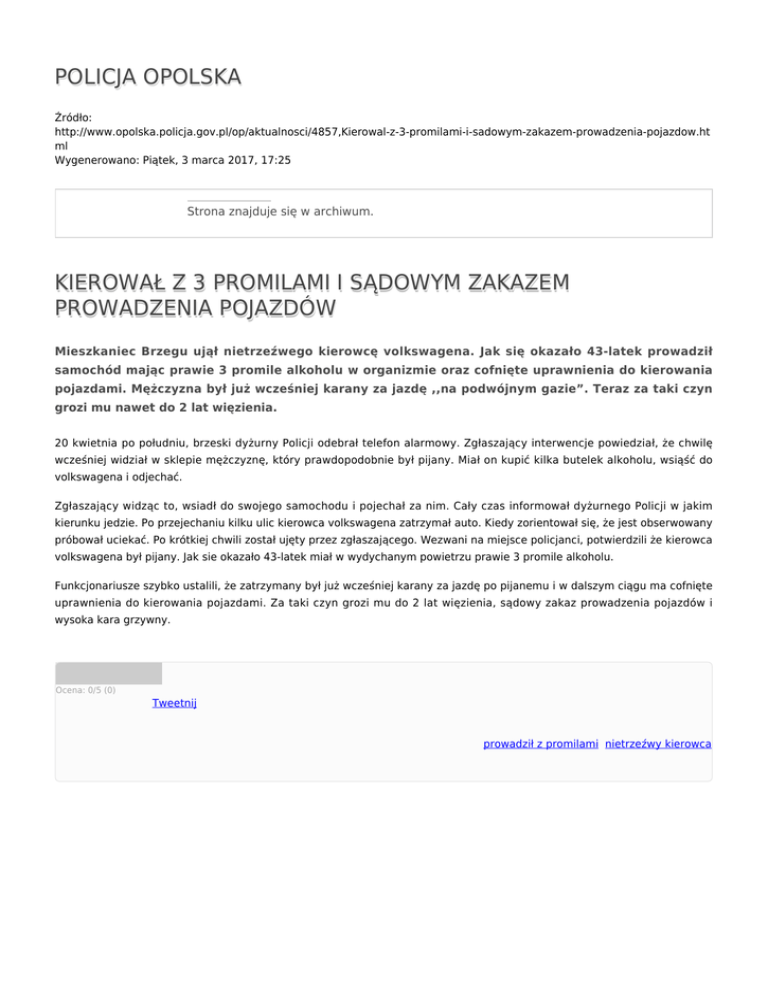 POLICJA OPOLSKA Źródło: http://www.opolska.policja.gov.pl/op/aktualnosci/4857,Kierowal-z-3-promilami-i-sadowym-zakazem-prowadzenia-pojazdow.ht ml Wygenerowano: Piątek, 3 marca 2017, 17:25 Strona znajduje się w archiwum. KIEROWAŁ Z 3 PROMILAMI I SĄDOWYM ZAKAZEM PROWADZENIA POJAZDÓW Mieszkaniec Brzegu ujął nietrzeźwego kierowcę volkswagena. Jak się okazało 43-latek prowadził samochód mając prawie 3 promile alkoholu w organizmie oraz cofnięte uprawnienia do kierowania pojazdami. Mężczyzna był już wcześniej karany za jazdę ,,na podwójnym gazie”. Teraz za taki czyn grozi mu nawet do 2 lat więzienia. 20 kwietnia po południu, brzeski dyżurny Policji odebrał telefon alarmowy. Zgłaszający interwencje powiedział, że chwilę wcześniej widział w sklepie mężczyznę, który prawdopodobnie był pijany. Miał on kupić kilka butelek alkoholu, wsiąść do volkswagena i odjechać. Zgłaszający widząc to, wsiadł do swojego samochodu i pojechał za nim. Cały czas informował dyżurnego Policji w jakim kierunku jedzie. Po przejechaniu kilku ulic kierowca volkswagena zatrzymał auto. Kiedy zorientował się, że jest obserwowany próbował uciekać. Po krótkiej chwili został ujęty przez zgłaszającego. Wezwani na miejsce policjanci, potwierdzili że kierowca volkswagena był pijany. Jak sie okazało 43-latek miał w wydychanym powietrzu prawie 3 promile alkoholu. Funkcjonariusze szybko ustalili, że zatrzymany był już wcześniej karany za jazdę po pijanemu i w dalszym ciągu ma cofnięte uprawnienia do kierowania pojazdami. Za taki czyn grozi mu do 2 lat więzienia, sądowy zakaz prowadzenia pojazdów i wysoka kara grzywny. Ocena: 0/5 (0) Tweetnij prowadził z promilami, nietrzeźwy kierowca
