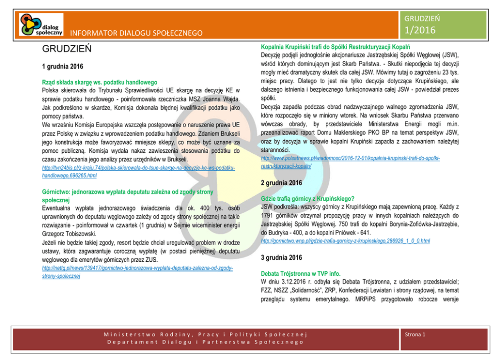 GRUDZIEŃ 1/2016 INFORMATOR DIALOGU SPOŁECZNEGO GRUDZIEŃ 1 grudnia 2016 Rząd składa skargę ws. podatku handlowego Polska skierowała do Trybunału Sprawiedliwości UE skargę na decyzję KE w sprawie podatku handlowego - poinformowała rzeczniczka MSZ Joanna Wajda. Jak podkreślono w skardze, Komisja dokonała błędnej kwalifikacji podatku jako pomocy państwa. We wrześniu Komisja Europejska wszczęła postępowanie o naruszenie prawa UE przez Polskę w związku z wprowadzeniem podatku handlowego. Zdaniem Brukseli jego konstrukcja może faworyzować mniejsze sklepy, co może być uznane za pomoc publiczną. Komisja wydała nakaz zawieszenia stosowania podatku do czasu zakończenia jego analizy przez urzędników w Brukseli. http://tvn24bis.pl/z-kraju,74/polska-skierowala-do-tsue-skarge-na-decyzje-ke-ws-podatkuhandlowego,696265.html Górnictwo: jednorazowa wypłata deputatu zależna od zgody strony społecznej Ewentualna wypłata jednorazowego świadczenia dla ok. 400 tys. osób uprawnionych do deputatu węglowego zależy od zgody strony społecznej na takie rozwiązanie - poinformował w czwartek (1 grudnia) w Sejmie wiceminister energii Grzegorz Tobiszowski. Jeżeli nie będzie takiej zgody, resort będzie chciał uregulować problem w drodze ustawy, która zagwarantuje coroczną wypłatę (w postaci pieniężnej) deputatu węglowego dla emerytów górniczych przez ZUS. http://nettg.pl/news/139417/gornictwo-jednorazowa-wyplata-deputatu-zalezna-od-zgodystrony-spolecznej Kopalnia Krupiński trafi do Spółki Restrukturyzacji Kopalń Decyzję podjęli jednogłośnie akcjonariusze Jastrzębskiej Spółki Węglowej (JSW), wśród których dominującym jest Skarb Państwa. - Skutki niepodjęcia tej decyzji mogły mieć dramatyczny skutek dla całej JSW. Mówimy tutaj o zagrożeniu 23 tys. miejsc pracy. Dlatego to jest nie tylko decyzja dotycząca Krupińskiego, ale dalszego istnienia i bezpiecznego funkcjonowania całej JSW - powiedział prezes spółki. Decyzja zapadła podczas obrad nadzwyczajnego walnego zgromadzenia JSW, które rozpoczęło się w miniony wtorek. Na wniosek Skarbu Państwa przerwano wówczas obrady, by przedstawiciele Ministerstwa Energii mogli m.in. przeanalizować raport Domu Maklerskiego PKO BP na temat perspektyw JSW, oraz by decyzja w sprawie kopalni Krupiński zapadła z zachowaniem należytej staranności. http://www.polsatnews.pl/wiadomosc/2016-12-01/kopalnia-krupinski-trafi-do-spolkirestrukturyzacji-kopaln/ 2 grudnia 2016 Gdzie trafią górnicy z Krupińskiego? JSW podkreśla: wszyscy górnicy z Krupińskiego mają zapewnioną pracę. Każdy z 1791 górników otrzymał propozycję pracy w innych kopalniach należących do Jastrzębskiej Spółki Węglowej. 750 trafi do kopalni Borynia-Zofiówka-Jastrzębie, do Budryka - 400, a do kopalni Pniówek - 641. http://gornictwo.wnp.pl/gdzie-trafia-gornicy-z-krupinskiego,286926_1_0_0.html 3 grudnia 2016 Debata Trójstronna w TVP info. W dniu 3.12.2016 r. odbyła się Debata Trójstronna, z udziałem przedstawiciel; FZZ, NSZZ „Solidarność”, ZRP, Konfederacji Lewiatan i strony rządowej, na temat przeglądu systemu emerytalnego. MRPiPS przygotowało robocze wersje Ministerstwo Rodziny, Pracy i Polityki Społecznej Departament Dialogu i Partnerstwa Społecznego Strona 1 GRUDZIEŃ 1/2016 INFORMATOR DIALOGU SPOŁECZNEGO dokumentów w sprawie zmian w systemie emerytalnym, które przesłano do konsultacji międzyresortowych i konsultacji społecznych. http://www.tvpparlament.pl/programy-telewizji-polskiej/tvp-info-debata-trojstronna/tvp-infodebata-trojstronna-03022016/28082888 5 grudnia 2016 Organizacje pracodawców i pacjentów wysłały list otwarty do premier ws. aptek Organizacje zrzeszające pracodawców i organizacje pacjenckie wystosowały do premier Beaty Szydło list otwarty w sprawie propozycji zmian w Prawie farmaceutycznym. Apelują w nim, by nie pozwolono "na wprowadzanie zmian, które będą niekorzystne zarówno dla polskich pacjentów, jak i polskich przedsiębiorców". Zdaniem sygnatariuszy, wprowadzenie do polskiego prawa zasady "apteka dla aptekarza", forsowanej przez korporację aptekarską, zagraża istnieniu tysięcy polskich aptek. http://forsal.pl/artykuly/998991,organizacje-pracodawcow-i-pacjentow-wyslaly-list-otwartydo-premier-ws-aptek.html 6 grudnia 2016 JSW: związkowcy chcą renegocjacji porozumienia Związkowcy z Jastrzębskiej Spółki Węglowej wystąpili do zarządu firmy z wnioskiem o renegocjowanie zawartego jesienią ub. roku porozumienia, zawieszającego na trzy lata wypłatę niektórych świadczeń pracowniczych. Spółka odpowiada, że nadal zmaga się ze skutkami kryzysu. Zawarte we wrześniu ubiegłego roku porozumienie ma przynieść w sumie ok. 2 mld zł oszczędności w ciągu trzech lat. To jeden z elementów programu naprawczego spółki. http://nettg.pl/news/139526/jsw-zwiazkowcy-chca-renegocjacji-porozumienia 7 grudnia 2016 Posiedzenie Zespołu Rady Dialogu Społecznego ds. ubezpieczeń społecznych W dniu 7 grudnia 2016 r. w Centrum Partnerstwa Społecznego „Dialog” odbyło się posiedzenie zespołu problemowego Rady Dialogu Społecznego ds. ubezpieczeń społecznych. W dużej mierze dyskusja skupiła się wokół środków zgromadzonych w Otwartych Funduszach Emerytalnych. http://www.dialog.gov.pl/aktualnosci/art,741,posiedzenie-zespolu-rady-dialoguspolecznego-ds-ubezpieczen-spolecznych.html Posiedzenie Trójstronnego Zespołu ds. Branży Węgla Brunatnego W dniu 7 grudnia 2016 roku odbyło się posiedzenie Zespołu Trójstronnego ds. Branży Węgla Brunatnego, na którym omawiano: Zaawansowanie prac nad „Programem dla sektora węgla brunatnego”; Sytuację w PAK KWB Adamów S.A. i w PAK KWB Konin w zakresie spraw pracowniczych; Sytuację w PGE Górnictwo i Energetyka Konwencjonalna S.A. – Oddział KWB Bełchatów i Oddział KWB Turów w zakresie spraw pracowniczych; Problemy związane z przedłużeniem bądź uzyskaniem koncesji na eksploatację złóż w