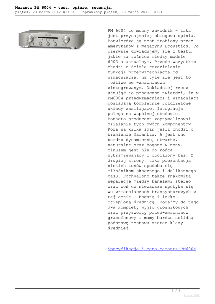 Marantz PM 6004 - test, opinie, recenzja. piątek, 23 marca 2012 01:00 - Poprawiony piątek, 23 marca 2012 14:01 PM 6004 to mocny zawodnik - taka jest przynajmniej obiegowa opinia. Potwierdza ją test zrobiony przez Amerykanów z magazynu Ecoustics. Po pierwsze dowiadujemy się z testu, jakie są różnice miedzy modelem 6003 a aktualnym. Przede wszystkim chodzi o ścisłe rozdzielenie funkcji przedwzmacniacza od wzmacniacza, na tyle ile jest to możliwe we wzmacniaczu zintegrowanym. Dokładniej rzecz ujmując to producent twierdzi, że w PM6004 przedwzmacniacz i wzmacniacz posiadają kompletnie rozdzielone układy zasilające. Integracja polega na wspólnej obudowie. Ponadto producent zoptymalizował działanie tych dwóch komponentów. Pora na kilka zdań jeśli chodzi o brzmienie Marantza. A jest ono bardzo dynamiczne, otwarte, naturalne oraz bogate w tony. Minusem jest nie do końca wybrzmiewający i obciążony bas. Z drugiej strony, taka prezentacja niskich tonów spodoba się miłośnikom skocznego i delikatnego basu. Pochwalono także znakomitą separację między kanałami stereo oraz coś co niezawsze spotyka się we wzmacniaczach tranzystorowych w tej cenie - bogatą i lekko ocieploną średnicę. Dodajmy do tego dwa komplety wyjść głośnikowych oraz przyzwoity przedwzmacniacz gramofonowy i mamy bardzo solidną podstawę zestawu stereo klasy średniej. Specyfikacja i cena Marantz PM6004 1 / 1 Phoca PDF