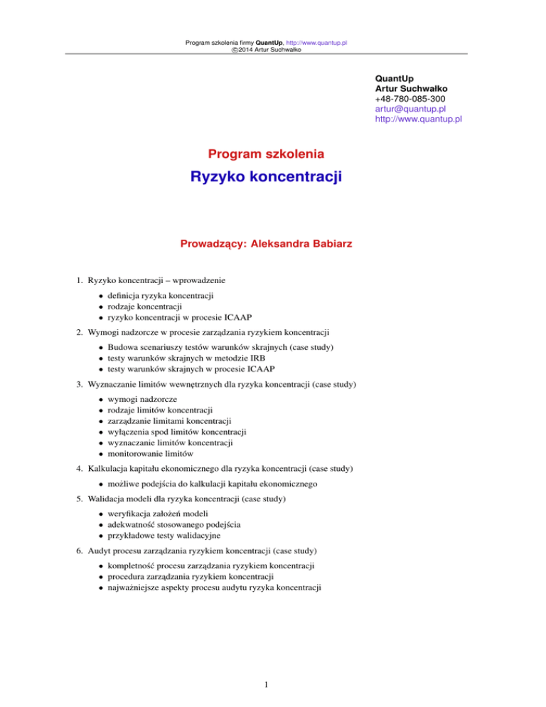 Program szkolenia firmy QuantUp, http://www.quantup.pl c 2014 Artur Suchwałko QuantUp Artur Suchwałko +48-780-085-300 [email protected] http://www.quantup.pl Program szkolenia Ryzyko koncentracji Prowadzacy: ˛ Aleksandra Babiarz 1. Ryzyko koncentracji – wprowadzenie • definicja ryzyka koncentracji • rodzaje koncentracji • ryzyko koncentracji w procesie ICAAP 2. Wymogi nadzorcze w procesie zarzadzania ˛ ryzykiem koncentracji • Budowa scenariuszy testów warunków skrajnych (case study) • testy warunków skrajnych w metodzie IRB • testy warunków skrajnych w procesie ICAAP 3. Wyznaczanie limitów wewn˛etrznych dla ryzyka koncentracji (case study) • • • • • • wymogi nadzorcze rodzaje limitów koncentracji zarzadzanie ˛ limitami koncentracji wyłaczenia ˛ spod limitów koncentracji wyznaczanie limitów koncentracji monitorowanie limitów 4. Kalkulacja kapitału ekonomicznego dla ryzyka koncentracji (case study) • możliwe podejścia do kalkulacji kapitału ekonomicznego 5. Walidacja modeli dla ryzyka koncentracji (case study) • weryfikacja założeń modeli • adekwatność stosowanego podejścia • przykładowe testy walidacyjne 6. Audyt procesu zarzadzania ˛ ryzykiem koncentracji (case study) • kompletność procesu zarzadzania ˛ ryzykiem koncentracji • procedura zarzadzania ˛ ryzykiem koncentracji • najważniejsze aspekty procesu audytu ryzyka koncentracji 1