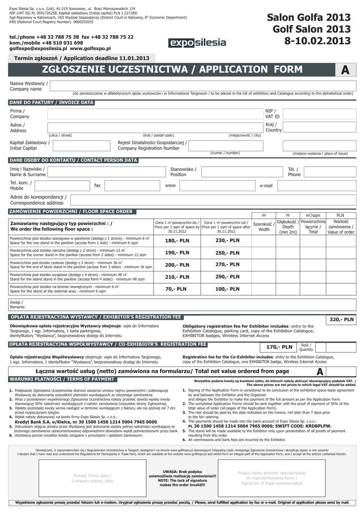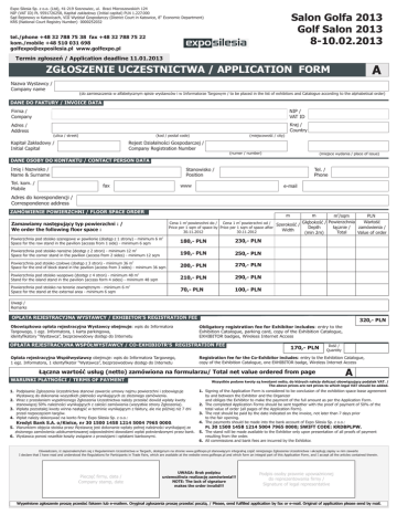Expo Silesia Sp. z o.o. (Ltd), 41-219 Sosnowiec, ul. Braci Mieroszewskich 124 NIP (VAT ID) PL 9591726258, Kapita³ zak³adowy (Initial capital) PLN 1.227.000 S¹d Rejonowy w Katowicach, VIII Wydzia³ Gospodarczy (District Court in Katowice, 8th Economic Department) KRS (National Court Registry Number) 0000252032 Salon Golfa 2013 Golf Salon 2013 8-10.02.2013 tel./phone +48 32 788 75 38 fax +48 32 788 75 22 kom./mobile +48 510 031 698 [email protected] www.golfexpo.pl Termin zg³oszeñ / Application deadline 11.01.2013 A ZG£OSZENIE UCZESTNICTWA / APPLICATION FORM Nazwa Wystawcy / Company name (do zamieszczenia w alfabetycznym spisie wystawców i w Informatorze Targowym / to be placed in the list of exhibitors and Catalogue according to the alphabetical order) DANE DO FAKTURY / INVOICE DATA Firma / Company NIP / VAT ID Adres / Address Kraj / Country (ulica / street) (kod / postal code) Kapita³ Zak³adowy / Initial Capital (miejscowoœæ / city) Rejest Dzia³alnoœci Gospodarczej / Company Registration Number (numer / number) (miejsce wydania / place of issue) DANE OSOBY DO KONTAKTU / CONTACT PERSON DATA Imiê i Nazwisko / Name & Surname Tel. kom. / Mobile Stanowisko / Position Tel. / Phone www fax e-mail Adres do korespondencji / Correspondence address ZAMÓWIENIE POWIERZCHNI / FLOOR SPACE ORDER m2/sqm PLN Wartoœæ G³êbokoœæ / Powierzchnia Cena 1 m powierzchni do / Cena 1 m powierzchni od / Szerokoœæ / ³¹cznie / Price per 1 sqm of space by Price per 1 sqm of space after zamówienia / Depth Width 30.11.2012 30.11.2012 Total Value of order (min 2m) m Zamawiamy nastêpuj¹cy typ powierzchni : / We order the following floor space : m 2 2 2 Powierzchnia pod stoisko szeregowe w pawilonie (dostêp z 1 strony) - minimum 6 m Space for the row stand in the pavilion (access from 1 side) - minimum 6 sqm 180,- PLN 230,- PLN 190,- PLN 250,- PLN 200,- PLN 270,- PLN 210,- PLN 290,- PLN 70,- PLN 100,- PLN 2 Powierzchnia pod stoisko naro¿ne (dostêp z 2 stron) - minimum 12 m Space for the corner stand in the pavilion (access from 2 sides) - minimum 12 sqm 2 Powierzchnia pod stoisko czo³owe (dostêp z 3 stron) - minimum 36 m Space for the end of block stand in the pavilion (access from 3 sides) - minimum 36 sqm 2 Powierzchnia pod stoisko wyspowe (dostêp z 4 stron) - minimum 48 m Stand for the island stand in the pavilion (access form 4 sides) - minimum 48 sqm 2 Powierzchnia pod stoisko na terenie zewnêtrznym - minimum 6 m Space for the stand at the external area - minimum 6 sqm Uwagi / Remarks OP£ATA REJESTRACYJNA WYSTAWCY / EXHIBITOR’S REGISTRATION FEE Obowi¹zkowa op³ata rejestracyjna Wystawcy obejmuje: wpis do Informatora Targowego, 1 egz. Informatora, 1 karta parkingowa, identyfikatory “Wystawca”, bezprzewodowy dostêp do Internetu 320,- PLN Obligatory registration fee for Exhibitor includes: entry to the Exhibition Catalogue, parking card, copy of the Exhibition Catalogue, EXHIBITOR badges, Wireless Internet Access OP£ATA REJESTRACYJNA WSPÓ£WYSTAWCY / CO-EXHIBIOTR’S REGISTRATION FEE Op³ata rejestracyjna Wspó³wystawcy obejmuje: wpis do Informatora Targowego, 1 egz. Informatora, 1 identyfikator “Wystawca”, bezprzewodowy dostêp do Internetu 170,- PLN Iloœæ / Quantity Registration fee for the Co-Exhibitor includes: entry to the Exhibition Catalogue, copy of the Exhibition Catalogue, one EXHIBITOR badge, Wireless Internet Access £¹czna wartoœæ us³ug (netto) zamówiona na formularzu/ Total net value ordered from page WARUNKI P£ATNOŒCI / TERMS OF PAYMENT A Wszystkie podane kwoty s¹ kwotami netto, do których nale¿y doliczyæ obowi¹zuj¹cy podatek VAT. / The above prices are net prices to which legal VAT should be added. 1. Podpisanie Zg³oszenia Uczestnictwa stanowi zawarcie umowy najmu powierzchni i zobowi¹zuje Wystawcê do dokonania wszystkich p³atnoœci wynikaj¹cych ze z³o¿onego zamówienia. 2. Wraz z przes³aniem wype³nionego Zg³oszenia Uczestnictwa nale¿y przes³aæ dowód wp³aty kwoty stanowi¹cej 50% nale¿noœci wynikaj¹cych z ca³oœci zamówienia (wszystkie strony Zg³oszenia). 3. Wp³ata pozosta³ej kwoty winna nast¹piæ w terminie wynikaj¹cym z faktury, ale nie póŸniej ni¿ 7 dni przed rozpoczêciem targów. 4. Wp³at nale¿y dokonywaæ na konto firmy Expo Silesia Sp. z o.o.: Kredyt Bank S.A. o/Kielce, nr 30 1500 1458 1214 5004 7965 0000. 5. Warunkiem objêcia stoiska przez Wystawcê jest dokonanie wp³aty pe³nej nale¿noœci wynikaj¹cej ze z³o¿onego zamówienia udokumentowanej odpowiednimi dowodami wp³at potwierdzonymi przez bank. 6. Wystawca ponosi wszelkie koszty zwi¹zane z prowizjami i op³atami bankowymi. 1. Signing of the Application Form is considered to be conclusion of the exhibition space lease agreement by and between the Exhibitor and the Organizer and obliges the Exhibitor to make the payment of the full amount as per the Application Form. 2. The completed Application Forms should be sent together with the proof of payment of 50% of the total value of order (all pages of the Application Form). 3. The rest should be paid by the date indicated on the invoice, not later than 7 days prior to the fair opening. 4. The payments should be made into the bank account of Expo Silesia Sp. z o.o.: PL 30 1500 1458 1214 5004 7965 0000; SWIFT CODE: KRDBPLPW. 5. The stand will be made available to the Exhibitor only upon presentation of all proofs of payment resulting from the order. 6. All commissions and bank fees are incurred by the Exhibitor. Oœwiadczam, i¿ zapozna³em/³am siê z Regulaminem Uczestnictwa w Targach, dostêpnym na stronie www.golfexpo.pl stanowi¹cym integraln¹ czêœæ niniejszego Zg³oszenia Uczestnictwa i akceptujê zapisy w nim zawarte I declare that I have read and understood the Regulations for Participants in Trade Fairs, which are available at the website www.golfexpo.pl and which form an integral part of this Application Form, and I accept all the articles contained therein. Pieczêæ firmy, data / Compan
