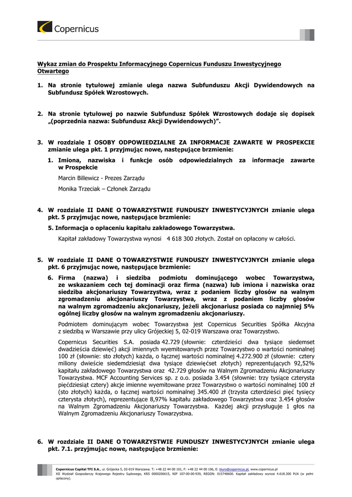Wykaz zmian do Prospektu Informacyjnego Copernicus Funduszu Inwestycyjnego Otwartego 1. Na stronie tytułowej zmianie ulega nazwa Subfunduszu Akcji Dywidendowych na Subfundusz Spółek Wzrostowych. 2. Na stronie tytułowej po nazwie Subfundusz Spółek Wzrostowych dodaje się dopisek „(poprzednia nazwa: Subfundusz Akcji Dywidendowych)”. 3. W rozdziale I OSOBY ODPOWIEDZIALNE ZA INFORMACJE ZAWARTE W PROSPEKCIE zmianie ulega pkt. 1 przyjmując nowe, następujące brzmienie: 1. Imiona, nazwiska w Prospekcie i funkcje osób odpowiedzialnych za informacje zawarte Marcin Billewicz - Prezes Zarządu Monika Trzeciak – Członek Zarządu 4. W rozdziale II DANE O TOWARZYSTWIE FUNDUSZY INWESTYCYJNYCH zmianie ulega pkt. 5 przyjmując nowe, następujące brzmienie: 5. Informacja o opłaceniu kapitału zakładowego Towarzystwa. Kapitał zakładowy Towarzystwa wynosi 4 618 300 złotych. Został on opłacony w całości. 5. W rozdziale II DANE O TOWARZYSTWIE FUNDUSZY INWESTYCYJNYCH zmianie ulega pkt. 6 przyjmując nowe, następujące brzmienie: 6. Firma (nazwa) i siedziba podmiotu dominującego wobec Towarzystwa, ze wskazaniem cech tej dominacji oraz firma (nazwa) lub imiona i nazwiska oraz siedziba akcjonariuszy Towarzystwa, wraz z podaniem liczby głosów na walnym zgromadzeniu akcjonariuszy Towarzystwa, wraz z podaniem liczby głosów na walnym zgromadzeniu akcjonariuszy, jeżeli akcjonariusz posiada co najmniej 5% ogólnej liczby głosów na walnym zgromadzeniu akcjonariuszy. Podmiotem dominującym wobec Towarzystwa jest Copernicus Securities Spółka Akcyjna z siedzibą w Warszawie przy ulicy Grójeckiej 5, 02-019 Warszawa oraz Towarzystwo. Copernicus Securities S.A. posiada 42.729 (słownie: czterdzieści dwa tysiące siedemset dwadzieścia dziewięć) akcji imiennych wyemitowanych przez Towarzystwo o wartości nominalnej 100 zł (słownie: sto złotych) każda, o łącznej wartości nominalnej 4.272.900 zł (słownie: cztery miliony dwieście siedemdziesiąt dwa tysiące dziewięćset złotych) reprezentujących 92,52% kapitału zakładowego Towarzystwa oraz 42.729 głosów na Walnym Zgromadzeniu Akcjonariuszy Towarzystwa. MCF Accounting Services sp. z o.o. posiada 3.454 (słownie: trzy tysiące czterysta pięćdziesiąt cztery) akcje imienne wyemitowane przez Towarzystwo o wartości nominalnej 100 zł (sto złotych) każda, o łącznej wartości nominalnej 345.400 zł (trzysta czterdzieści pięć tysięcy czterysta złotych), reprezentujące 8,97% kapitału zakładowego Towarzystwa oraz 3.454 głosów na Walnym Zgromadzeniu Akcjonariuszy Towarzystwa. Każdej akcji przysługuje 1 głos na Walnym Zgromadzeniu Akcjonariuszy Towarzystwa. 6. W rozdziale II DANE O TOWARZYSTWIE FUNDUSZY INWESTYCYJNYCH zmianie ulega pkt. 7.1. przyjmując nowe, następujące brzmienie: Copernicus Capital TFI S.A., ul. Grójecka 5, 02-019 Warszawa. T: +48 22 44 00 101, F: +48 22 44 00 106, E: [email protected], www.copernicus.pl XII Wydział Gospodarczy Krajowego Rejestru Sądowego, KRS 0000206615, NIP 107-00-00-939, REGON: 015748600. Kapitał zakładowy wynosi 4.618.300 PLN (w pełni opłacony). 7.1. Imiona i nazwiska członków pełnionych w Zarządzie Zarządu Towarzystwa, ze wskazaniem funkcji Marcin Billewicz – Prezes Zarządu Monika Trzeciak – Członek Zarządu 7. W rozdziale II DANE O TOWARZYSTWIE FUNDUSZY INWESTYCYJNYCH zmianie ulega pkt. 7.3. przyjmując nowe, następujące brzmienie: 7.3 Imiona i nazwiska osób fizycznych zarządzających Subfunduszami Funduszu. Za zarządzanie Subfunduszem Spółek Wzrostowych odpowiada Jacek Wojton, makler papierów wartościowych (licencja nr 681); Za zarządzanie Subfunduszem Akcji odpowiada Jacek Wojton, makler papierów wartościowych (licencja nr 681). Za zarządzanie Subfunduszem Płynnościowym Plus odpowiada Tomasz Glinicki. Za zarządzanie Subfunduszem Dłużnym Skarbowym Plus odpowiada Tomasz Glinicki. 8. W rozdziale II DANE O TOWARZYSTWIE FUNDUSZY INWESTYCYJNYCH zmianie ulega pkt. 8.1. przyjmując nowe, następujące brzmienie: 8.1. Zarząd Towarzystwa Marcin Billewicz - Prezes Zarządu Poza pełnieniem funkcji Prezesa Zarządu Towarzystwa, Marcin Billewicz nie pełni innych funkcji, które mogłyby mieć znaczenie dla Uczestników Funduszu Monika Trzeciak – Członek Zarządu Poza pełnieniem funkcji Członka Zarządu Monika Trzeciak jest Członkiem Zarządu Copernicus Securities Spółka Akcyjna z siedzibą w Warszawie przy ulicy Grójeckiej 5. Nie pełni innych funkcji, które mogłyby mieć znaczenie dla Uczestników Funduszu 9. W rozdziale II DANE O TOWARZYSTWIE FUNDUSZY INWESTYCYJNYCH zmianie ulega pkt. 8.3. przyjmując nowe, następujące brzmienie: 2.13. Osoby fizyczne zarządzające Subfunduszami Funduszu Jacek Wojton nie pełni poza Towarzystwem innych funkcji, które mogłyby mieć znaczenie dla Uczestników Funduszu. Tomasz Glinicki nie pełni poza Towarzystwem innych funkcji, które mogłyby mieć znaczenie dla Uczestników Funduszu. 10. W rozdziale II DANE O TOWARZYSTWIE FUNDUSZY INWESTYCYJNYCH zmianie ulega pkt. 9 przyjmując nowe, następujące brzmienie: 9. Nazwy innych funduszy nieobjętych Prospektem inwestycyjnych zarządzanych przez Towarzystwo, 9.1. S-Collect Fundusz Inwestycyjny Zamknięty Niestandaryzowany Fundusz Sekurytyzacyjny 9.2. ALFA Real Estate Fundusz Inwestycyjny Zamknięty 9.3. Bison Niestandaryzowany Sekurytyzacyjny Fundusz Inwestycyjny Zamknięty 9.4. Sowiniec Fundusz Inwestycyjny Zamknięty 2 9.5. Armada Investments Fundusz Inwestycyjny Zamknięty 9.6. CC1 Fundusz Inwestycyjny Zamknięty 9.7. VPF I Niestandaryzowany Sekurytyzacyjny Fundusz Inwestycyjny Zamknięty 9.8. Monday Fundusz Inwestycyjny Zamknięty w likwidacji 9.9. CC5 Fundusz Inwestycyjny Zamknięty 9.10. VPF III Niestandaryzowany Sekurytyzacyjny Fundusz Inwestycyjny Zamknięty 9.11. Świtalski Fundusz Inwestycyjny Zamknięty 9.12. CC3 Fundusz Inwestycyjny Zamknięty Aktywów Niepublicznych 9.13. CC6 Fundusz Inwestycyjny Zamknięty w likwidacji 9.14. CC14 Fund