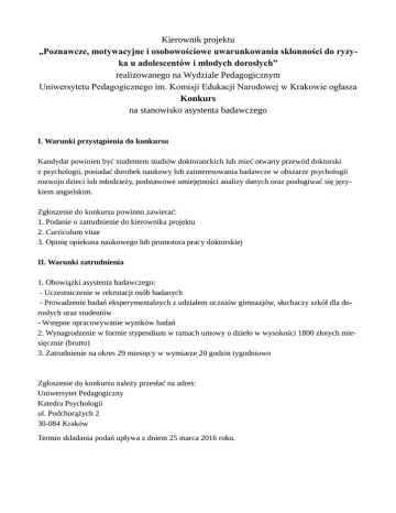 Kierownik projektu „Poznawcze, motywacyjne i osobowościowe uwarunkowania skłonności do ryzyka u adolescentów i młodych dorosłych” realizowanego na Wydziale Pedagogicznym Uniwersytetu Pedagogicznego im. Komisji Edukacji Narodowej w Krakowie ogłasza Konkurs na stanowisko asystenta badawczego I. Warunki przystąpienia do konkursu Kandydat powinien być studentem studiów doktoranckich lub mieć otwarty przewód doktorski z psychologii, posiadać dorobek naukowy lub zainteresowania badawcze w obszarze psychologii rozwoju dzieci lub młodzieży, podstawowe umiejętności analizy danych oraz posługiwać się językiem angielskim. Zgłoszenie do konkursu powinno zawierać: 1. Podanie o zatrudnienie do kierownika projektu 2. Curriculum vitae 3. Opinię opiekuna naukowego lub promotora pracy doktorskiej II. Warunki zatrudnienia 1. Obowiązki asystenta badawczego: - Uczestniczenie w rekrutacji osób badanych - Prowadzenie badań eksperymentalnych z udziałem uczniów gimnazjów, słuchaczy szkół dla dorosłych oraz studentów - Wstępne opracowywanie wyników badań 2. Wynagrodzenie w formie stypendium w ramach umowy o dzieło w wysokości 1800 złotych miesięcznie (brutto) 3. Zatrudnienie na okres 29 miesięcy w wymiarze 20 godzin tygodniowo Zgłoszenie do konkursu należy przesłać na adres: Uniwersytet Pedagogiczny Katedra Psychologii ul. Podchorążych 2 30-084 Kraków Termin składania podań upływa z dniem 25 marca 2016 roku.