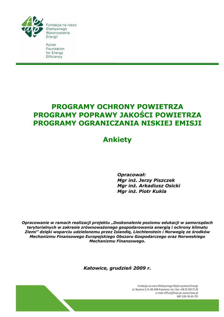 PROGRAMY OCHRONY POWIETRZA PROGRAMY POPRAWY JAKOŚCI POWIETRZA PROGRAMY OGRANICZANIA NISKIEJ EMISJI Ankiety Opracował: Mgr inż. Jerzy Piszczek Mgr inż. Arkadiusz Osicki Mgr inż. Piotr Kukla Opracowanie w ramach realizacji projektu „Doskonalenie poziomu edukacji w samorządach terytorialnych w zakresie zrównoważonego gospodarowania energią i ochrony klimatu Ziemi” dzięki wsparciu udzielonemu przez Islandię, Liechtenstein i Norwegię ze środków Mechanizmu Finansowego Europejskiego Obszaru Gospodarczego oraz Norweskiego Mechanizmu Finansowego. Katowice, grudzień 2009 r. I. ANKIETA – SZCZEGÓŁOWOŚĆ ZALEŻNA OD FAZY REALIZACJI Przygotowanie Programu wymaga wykonania szeregu działań analitycznych, w tym: a. niezbędne jest określenie jakich zanieczyszczeń Program będzie dotyczył, np.: dwutlenek siarki, pył, tlenki azou, tlenek węgla, dwutlenek węgla; b. potrzebne jest wskazanie dla jakich obiektów jest dedykowany (np. dla obiektów użyteczności publicznej administrowanych przez Gminę/Powiat, a ogrzewanych ze źródeł ciepła opalanych paliwami stałymi oraz dla indywidualnych użytkowników źródeł ciepła opalanych paliwami stałymi). c. należy również określić jakie przedsięwzięcia będą realizowane w ramach Programu (np. dokonywane będą wymiany istniejących, nieefektywnych i generujących znaczne ilości zanieczyszczeń urządzeń grzewczych na wysokosprawne i przyjazne środowisku nowoczesne urządzenia grzewcze opalane wysokojakościowym węglem, koksem, paliwami gazowymi lub ciekłymi, jak również zasilane energią elektryczną lub ciepłem sieciowym. Mogą być również stosowane urządzenia wykorzystujące energię odnawialną - energię wody, wiatru, słońca, ziemi, energię pochodzącą z biomasy). Wykonanie analiz i zaplanowanie działań, w wyniku których możliwa będzie poprawa jakości powietrza zgodnie z w/w założeniami wymaga zebrania określonej ilości informacji i danych dotyczących zarówno stanu istniejącego jak i planowanych przez poszczególnych potencjalnych uczestników Programu działań modernizujących. Jedną metod pozyskiwania tych informacji jest badanie ankietowe. W zależności od stopnia szczegółowości Programu i fazy jego realizacji stosowane są różne stopnie szczegółowości badań ankietowych. Na etapie początkowym wykonuje się zazwyczaj wstępne badanie ankietowe (przykład ankiety w załączeniu), natomiast przy konstruowaniu Programu i wniosku aplikacyjnego do określonej instytucji finansującej wymagane jest już znacznie bardziej szczegółowe badanie ankietowe połączone zazwyczaj z podpisaniem przez podmioty zainteresowane wstępnej deklaracji uczestnictwa w Programie (przykład ankiety o dużym stponiu szczegółowości w załączeniu). Oczywiście, w zależności od konkretnych potrzeb i wymagań instytucji finansujących zawartość ankiety może być do nich dostosowywana. 2 ANKIETA WSTĘPNA „Programu ograniczenia niskiej emisji na teranie Gminy __________” 1 Aktualnie posiadam: INDYWIDUALNĄ KOTŁOWNIĘ Węglową gazową olejową ogrzewanie elektryczne inne Opis i uwagi: Wiek posiadanego źródła ciepła 2 3 Dane budynku i koszty ogrzewania powyżej 15 lat od 10 do 15 lat od 5 do 10 lat poniżej 5 lat długość [m] szerokość [m] wysokość [m] liczba kondygnacji .................... ...................... ...................... ........................ Ogrzewana Liczba Zużycie paliwa Orientacyjny [ton/rok; powierzchnia mieszkańców koszt paliwa*) 3 m /rok; [zł/rok] użytkowa [osoby] kWh/rok] [m2] *) wlicza się również koszt deputatu węglowego 4 5 7 Planuję wymianę źródła ciepła na: Wykonane prace ociepleniowe i termoizolacyjne Planuję wymianę źródła ciepła (kotła) 9 nie olejowe ogrzewanie elektryczne gazowe pompę ciepła inne Wymiana okien ocieplenie ścian ocieplenie stropu nad ostat. kondygn. /dachem (automatyczne)*) we własnym zakresie Planuję udział w ramach programu w: Uważam, że udział własny nie powinien być wyższy niż: tak Węglowe retortowe A. 8 ...................... ...................... ........................ Posiadam deputat węglowy *) kotły z automatycznym paleniskiem bezrusztowym 6 .................... Jakie___________________ __________ chciał(a)bym skorzystać z programu B. pierwszym roku - 2010 Inne (jakie?) drugim roku - Trzecim roku – 2011 2012 4 000 zł 6 000 zł ___________ 3 UWAGA: realizacja programu bez udziału własnego nie jest możliwa 10 Proszę określić jaka temperatura panuje wewnątrz Pana / Pani budynku < 180C 18 – 20 0C 20 – 22 0C > 23 0C centralny (kocioł + grzejniki) etażowy (kocioł w mieszkaniu + grzejniki) gaz sieciowy 11 System ogrzewania budynku 12 Rodzaj stosowanego do ogrzewania paliwa 13 Sposób przygotowania ciepłej wody użytkowej Węgiel gatunkowy muł lub miał węglowy koks gaz płynny olej opałowy energia elektr. _________ Kocioł węglowy Gazowe Olejowe Elektryczne inne: inne: __________ _________ Inne: Deklaruję wstępnie udział w planowanym do realizacji przez Gminę ________ programie ograniczenia niskiej emisji (wymiany starych kotłów i pieców) na terenie Gminy, współfinansowanym z udziałem środków własnych, środków budżetowych Gminy i zewnętrznych środków pomocowych (niniejsza deklaracja nie oznacza zgody na przystąpienie do udziału w programie). Dokładne zasady funkcjonowania programu oraz regulamin uczestnictwa będą opracowane po przygotowaniu „Programu ograniczenia niskiej emisji na terenie Gminy ________” na podstawie wstępnych deklaracji uczestnictwa. UWAGA: W PROGRAMIE NIE PRZEWIDUJE SIĘ DOFINANSOWANIA DLA TRADYCYJNYCH (KOMOROWYCH) KOTŁÓW WĘGLOWYCH. Imię i nazwisko właściciela obiektu: ____________________________________ Adres ___________________________________________________________ podpis: __________________________ 4 ANKIETA „KOMPLEKSOWEGO PROGRAMU DZIAŁAŃ W ZAKRESIE ENERGII I POPRAWY JAKOŚCI POWIETRZA W GMINIE ____