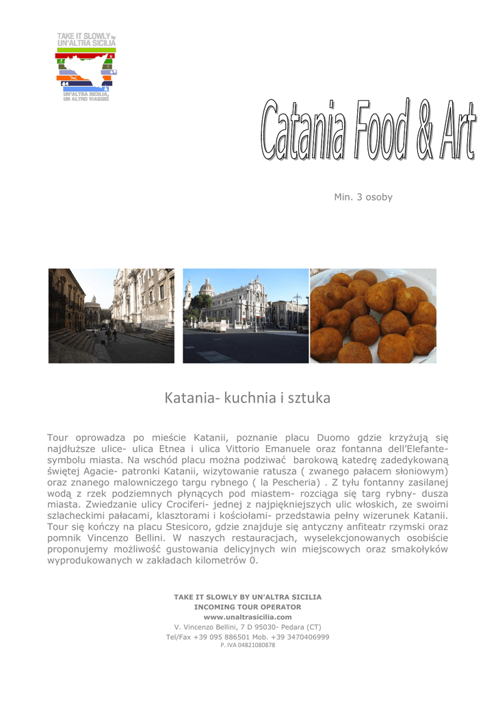 Min. 3 osoby Katania- kuchnia i sztuka Tour oprowadza po mieście Katanii, poznanie placu Duomo gdzie krzyżują się najdłuższe ulice- ulica Etnea i ulica Vittorio Emanuele oraz fontanna dell’Elefantesymbolu miasta. Na wschód placu można podziwać barokową katedrę zadedykowaną świętej Agacie- patronki Katanii, wizytowanie ratusza ( zwanego pałacem słoniowym) oraz znanego malowniczego targu rybnego ( la Pescheria) . Z tyłu fontanny zasilanej wodą z rzek podziemnych płynących pod miastem- rozciąga się targ rybny- dusza miasta. Zwiedzanie ulicy Crociferi- jednej z najpiękniejszych ulic włoskich, ze swoimi szlacheckimi pałacami, klasztorami i kościołami- przedstawia pełny wizerunek Katanii. Tour się kończy na placu Stesicoro, gdzie znajduje się antyczny anfiteatr rzymski oraz pomnik Vincenzo Bellini. W naszych restauracjach, wyselekcjonowanych osobiście proponujemy możliwość gustowania delicyjnych win miejscowych oraz smakołyków wyprodukowanych w zakładach kilometrów 0. TAKE IT SLOWLY BY UN’ALTRA SICILIA INCOMING TOUR OPERATOR www.unaltrasicilia.com V. Vincenzo Bellini, 7 D 95030- Pedara (CT) Tel/Fax +39 095 886501 Mob. +39 3470406999 P. IVA 04821080878 -W pakiecie: N. 1 wycieczka z przewodnikiem po Katanii, godziny 9-13; N. Aperitivo na bazie miejscowych smakołyków oraz win biologiczych; N. Poczęstunek z typowym wypiekiem sycylijskim- cannolo oraz degustacja mleka migdałowego oraz granita albo brioche Pakiet na zamówienie Cena w ofercie i nie podlega zwrotowi Un'Altra Sicilia. Un Altro Viaggio. TAKE IT SLOWLY BY UN’ALTRA SICILIA INCOMING TOUR OPERATOR www.unaltrasicilia.com V. Vincenzo Bellini, 7 D 95030- Pedara (CT) Tel/Fax +39 095 886501 Mob. +39 3470406999 P. IVA 04821080878